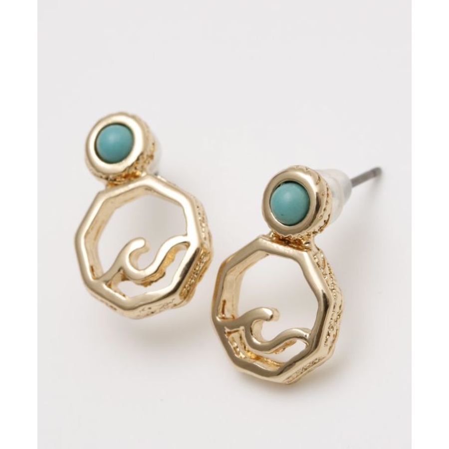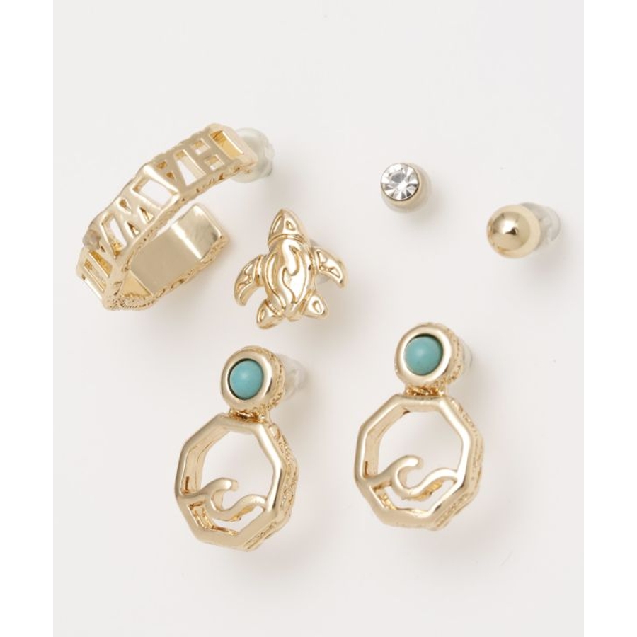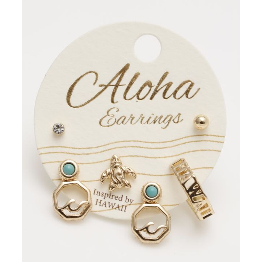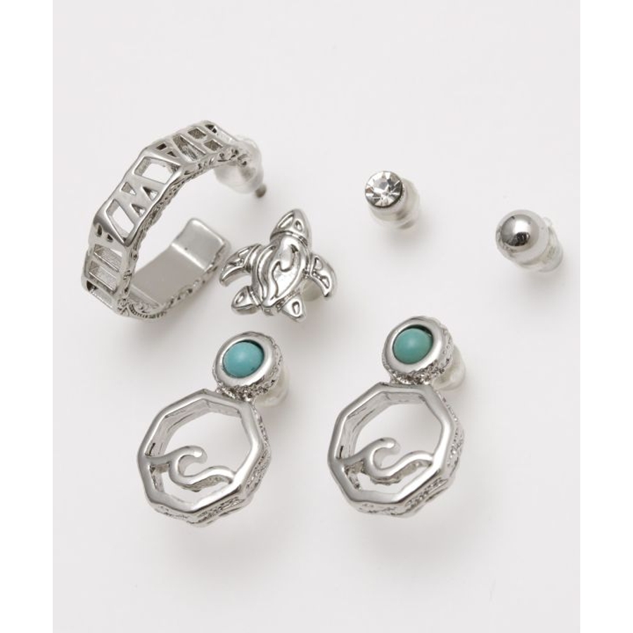 ハワイアンジュエリー調の刻印を施したピアス。ホヌモチーフとウェーブモチーフ、ターコイズカラーも合わさって、付けるだけで耳元も華やかにしてくれます。6個セットなので、その日の気分やコーディネートで自由な組み合わせも楽しめます。