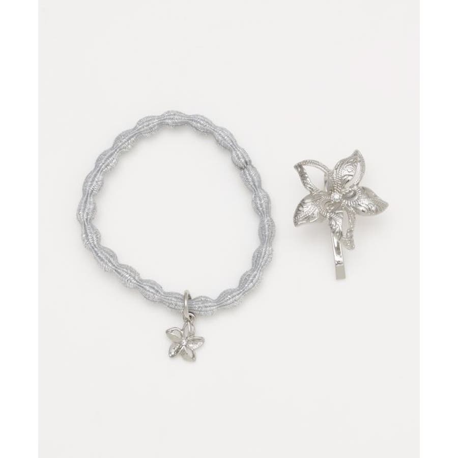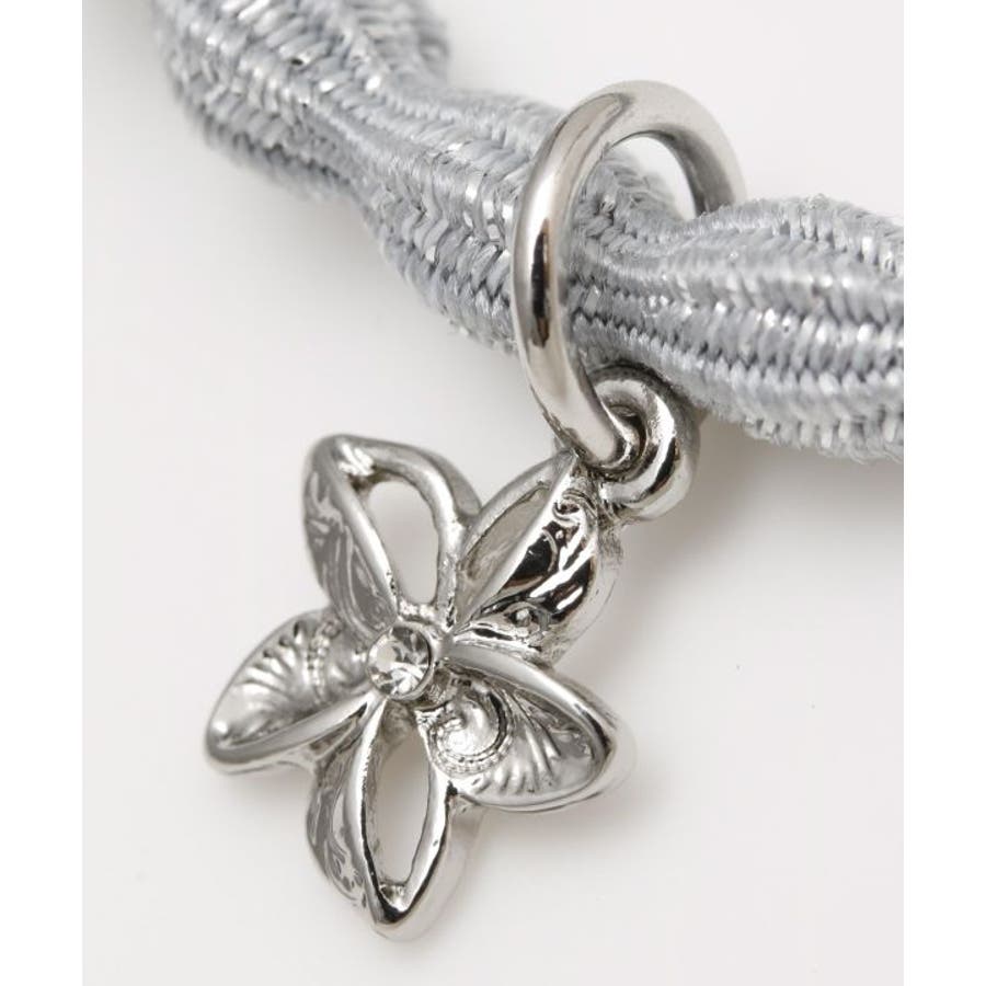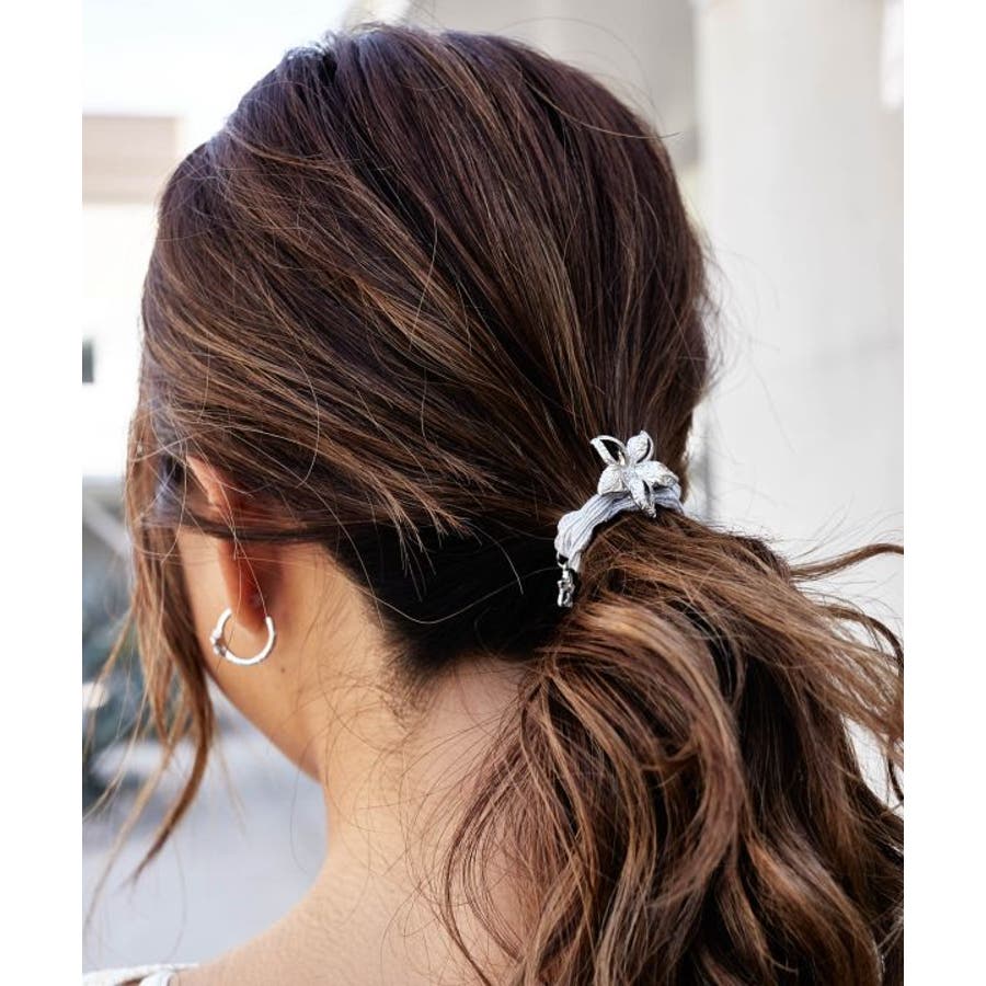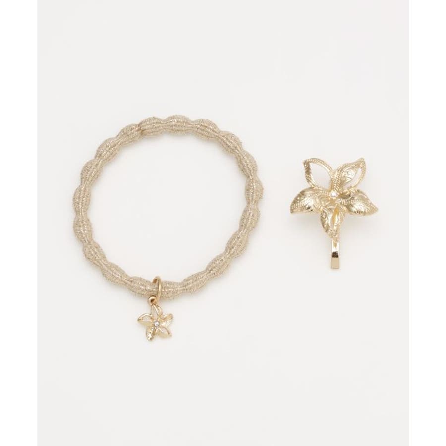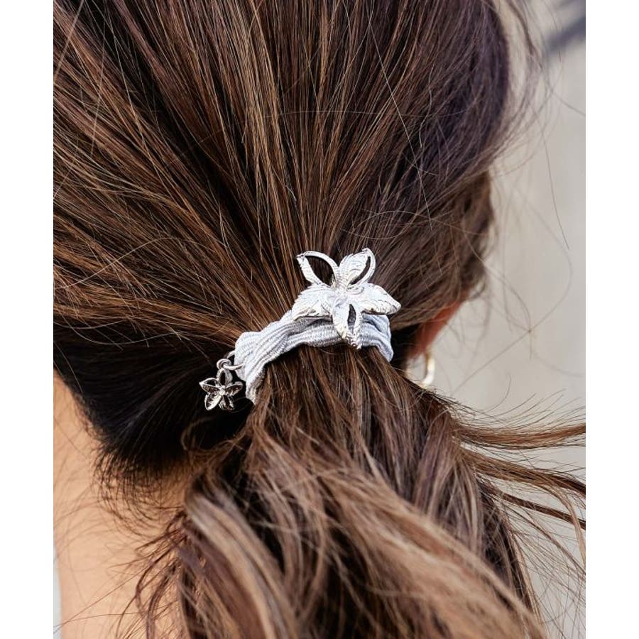 ハワイアンジュエリー調の刻印を施した、プルメリアのポニーフックとミニチャームのついたヘアゴムセット。キラキラなヘアゴムと、ゴージャスなプルメリアが一気にヘアアレンジを華やかに演出。お手持ちのヘアゴムと使ったりと、いろいろなヘアスタイルが楽しめるアイテム。