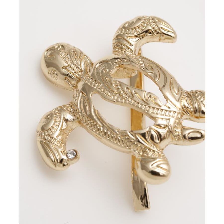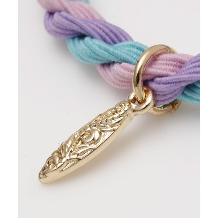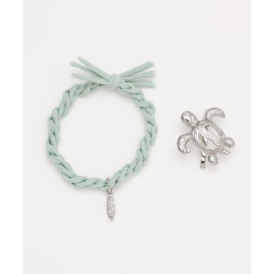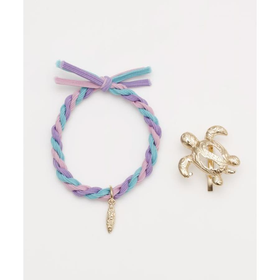 ハワイアンジュエリー調の刻印を施した、ホヌのポニーフックとミニチャームのついたヘアゴムセット。編み込まれたパステルカラーのヘアゴムと、ゴージャスなホヌがヘアアレンジのアクセントに。お手持ちのヘアゴムと使ったりと、いろいろなヘアスタイルが楽しめるアイテム。