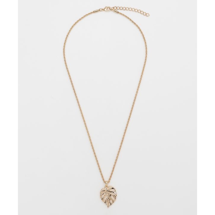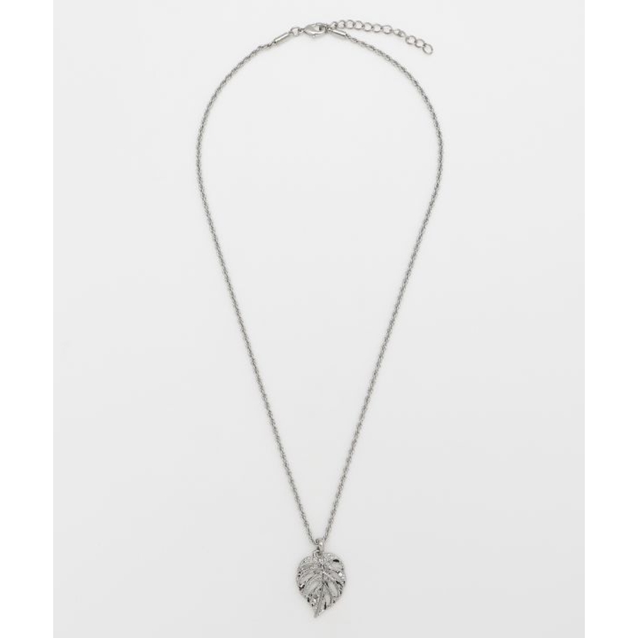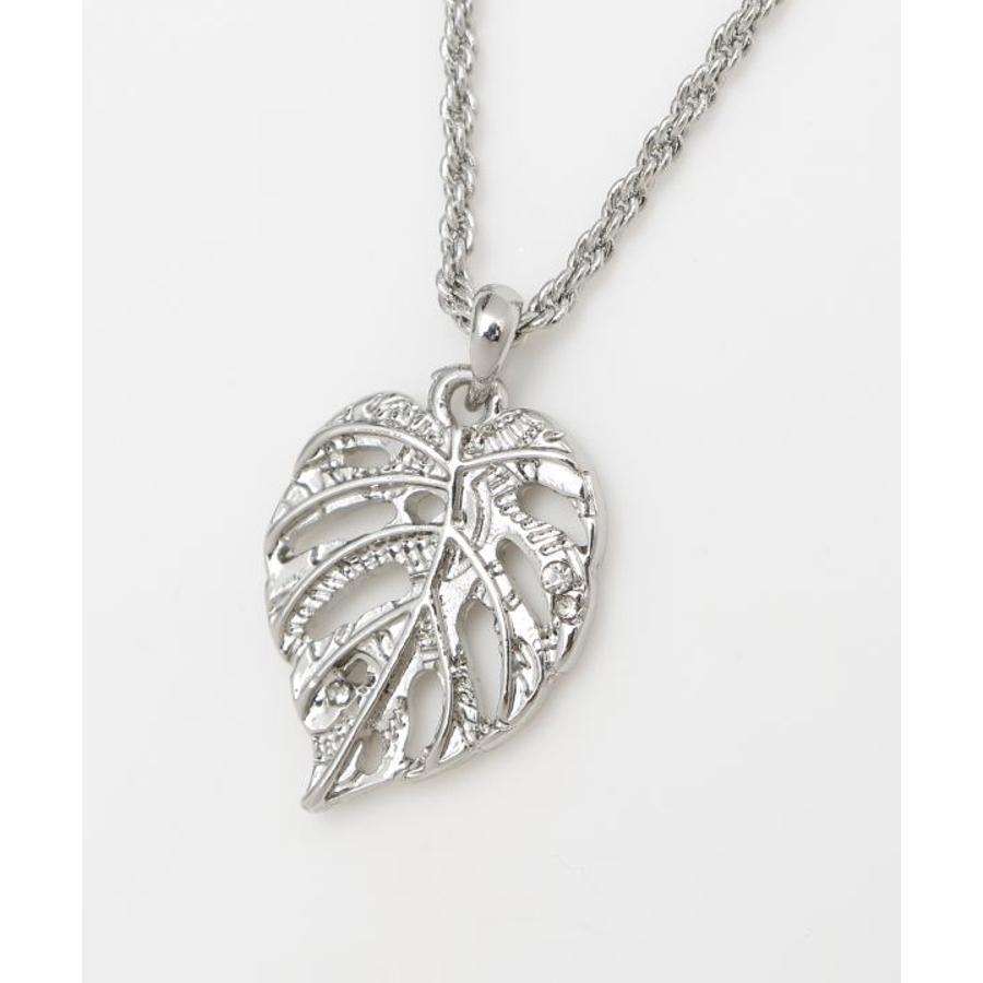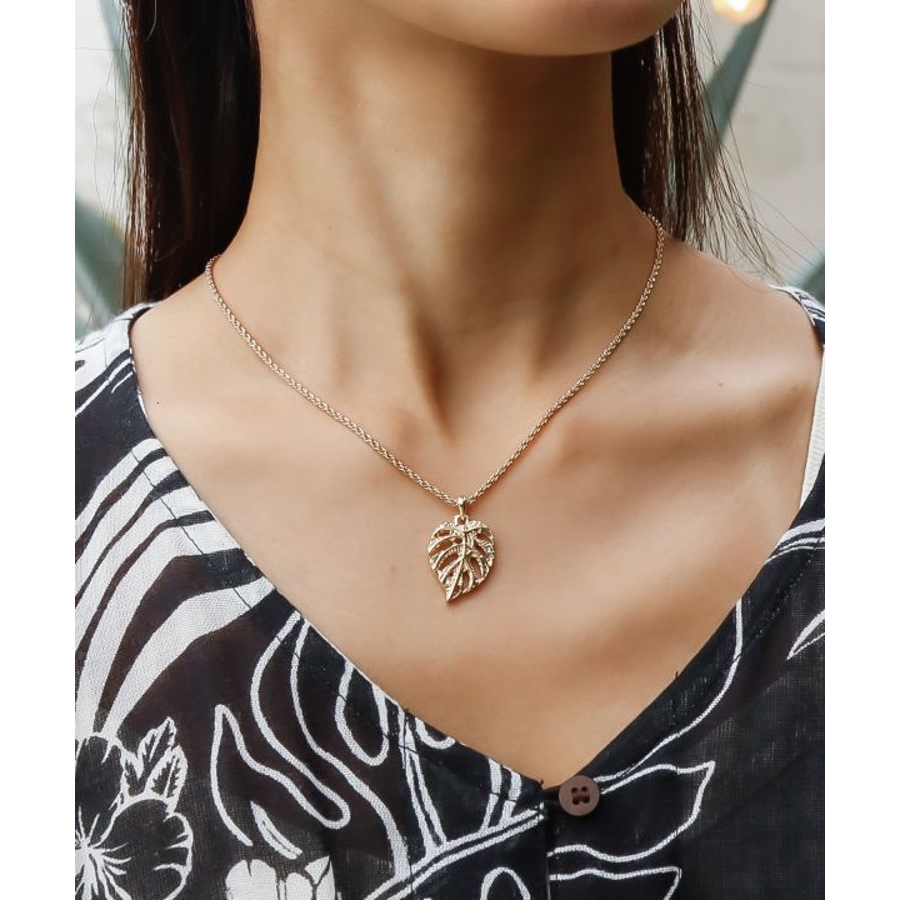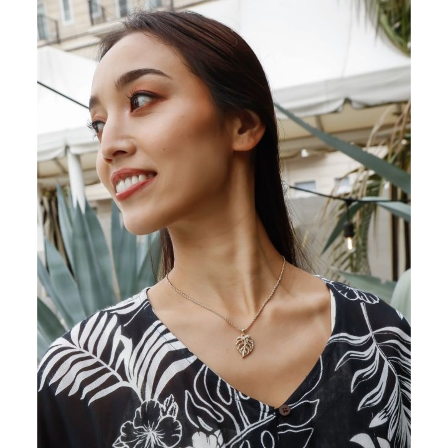 モンステラモチーフのネックレス。ハワイの文化ではモンステラは自然との調和を象徴する植物とされ、大きく美しい葉が癒しのエネルギーを感じさせます。ハワイアンジュエリー調の刻印が上品な輝きを添えるアクセサリーです。