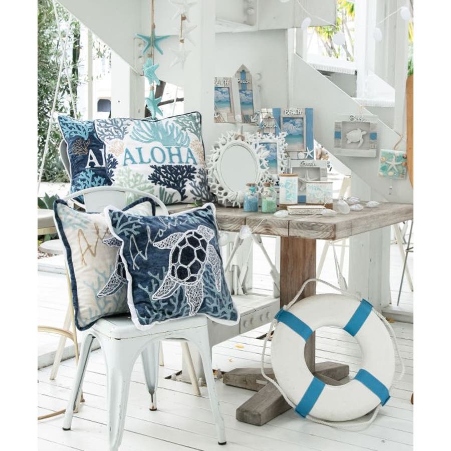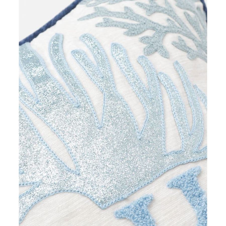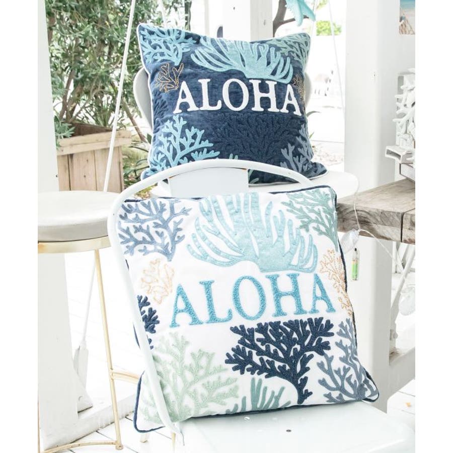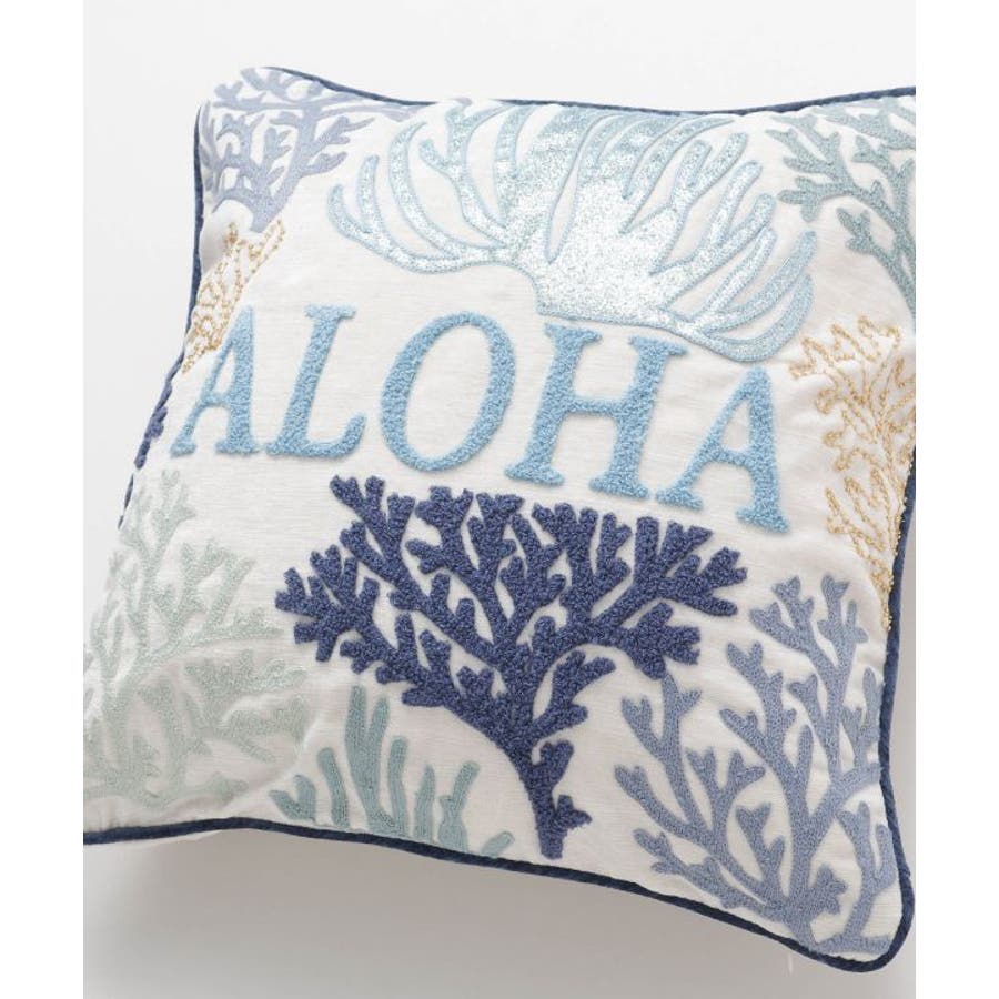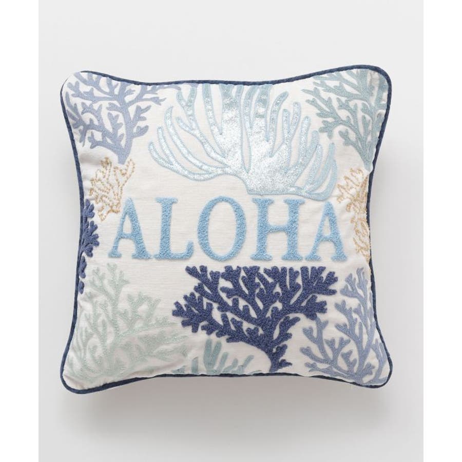様々なテクニックの刺しゅうが施されたクッションカバー。ハワイのホテルにありそうな高級感で、お部屋のアクセントに最適です。上品なオーシャンデザインでお家時間を贅沢に彩ります。