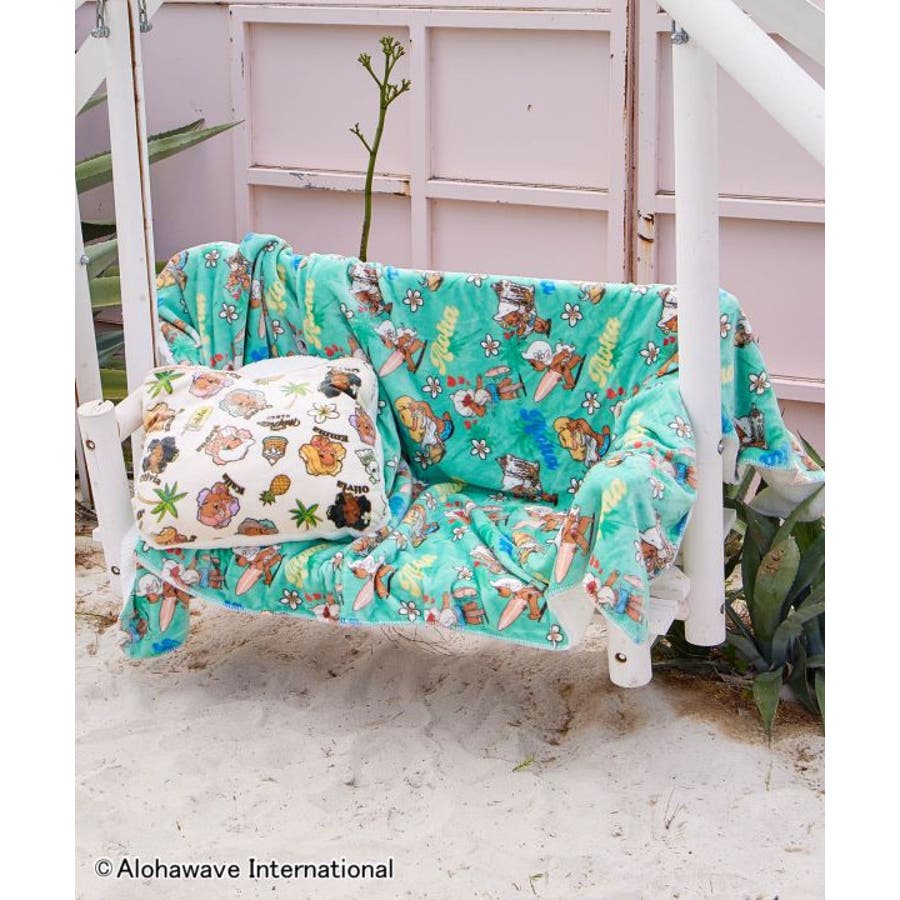 【Kahiko×Aloha Mapua】サーフィンとファッションを愛する365日ハワイを感じられるキャラクター、ALOHA MAPUA(アロハマプア)のブランケット。XLサイズはベッドやソファーの掛けカバーとして、ちょっとした敷物としてちょうど良いサイズ。パッカブル仕様になっていて、折りたたんでクッションとしても使用できます。可愛いキャラやハワイのモチーフのデザインは日々のおうちで過ごす時間を明るく、元気にしてくれます。
