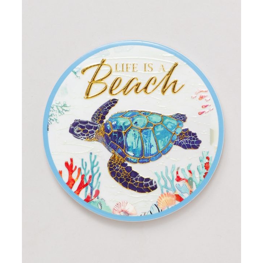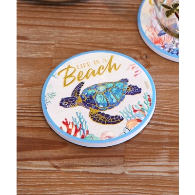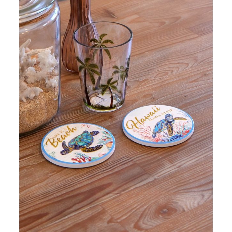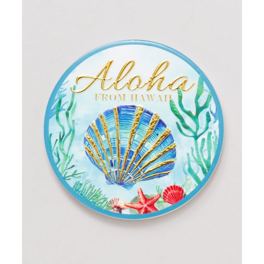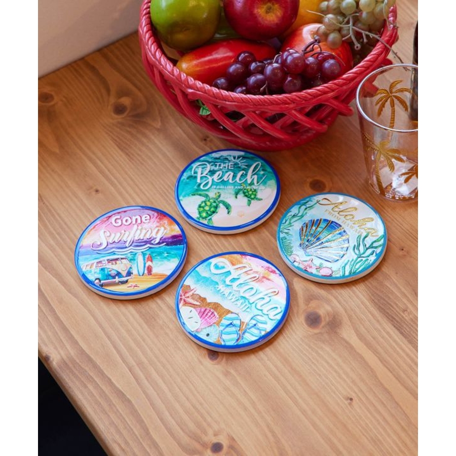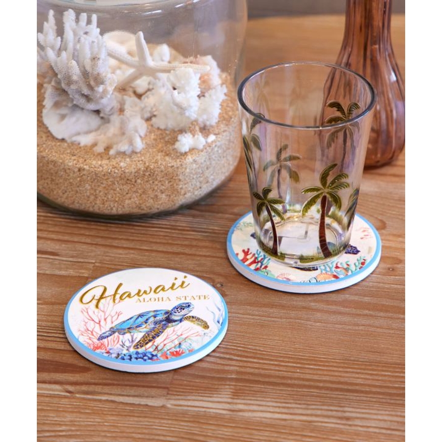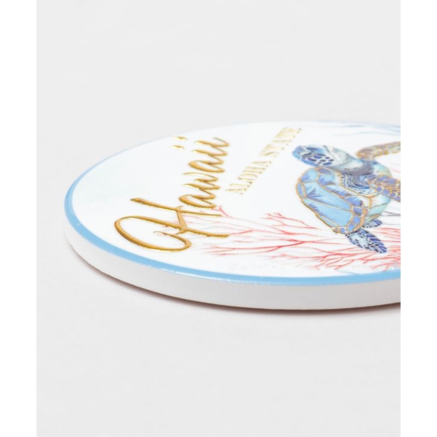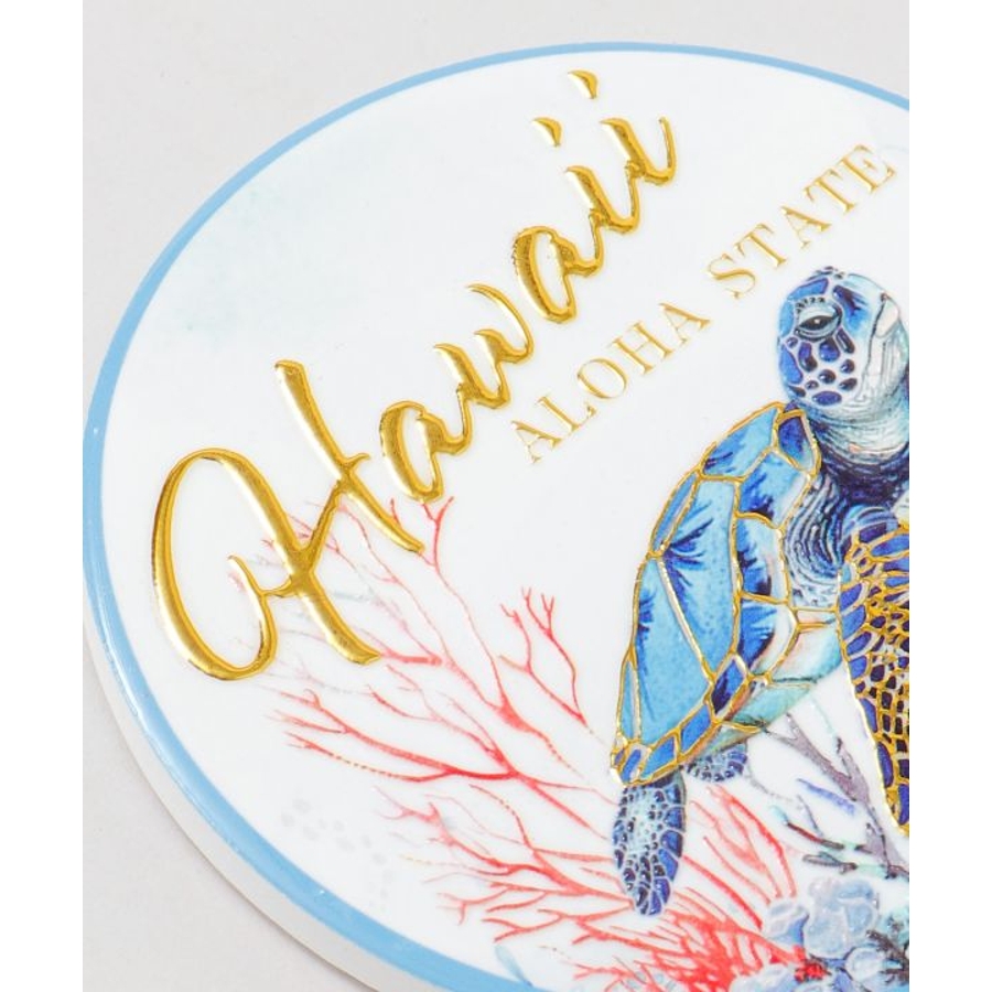 ハワイの美しい海の風景が描かれた陶器のコースター。インテリアとして飾りたくなるほどの美しさ。ゴールドの文字やデザインがきれいに輝きます。