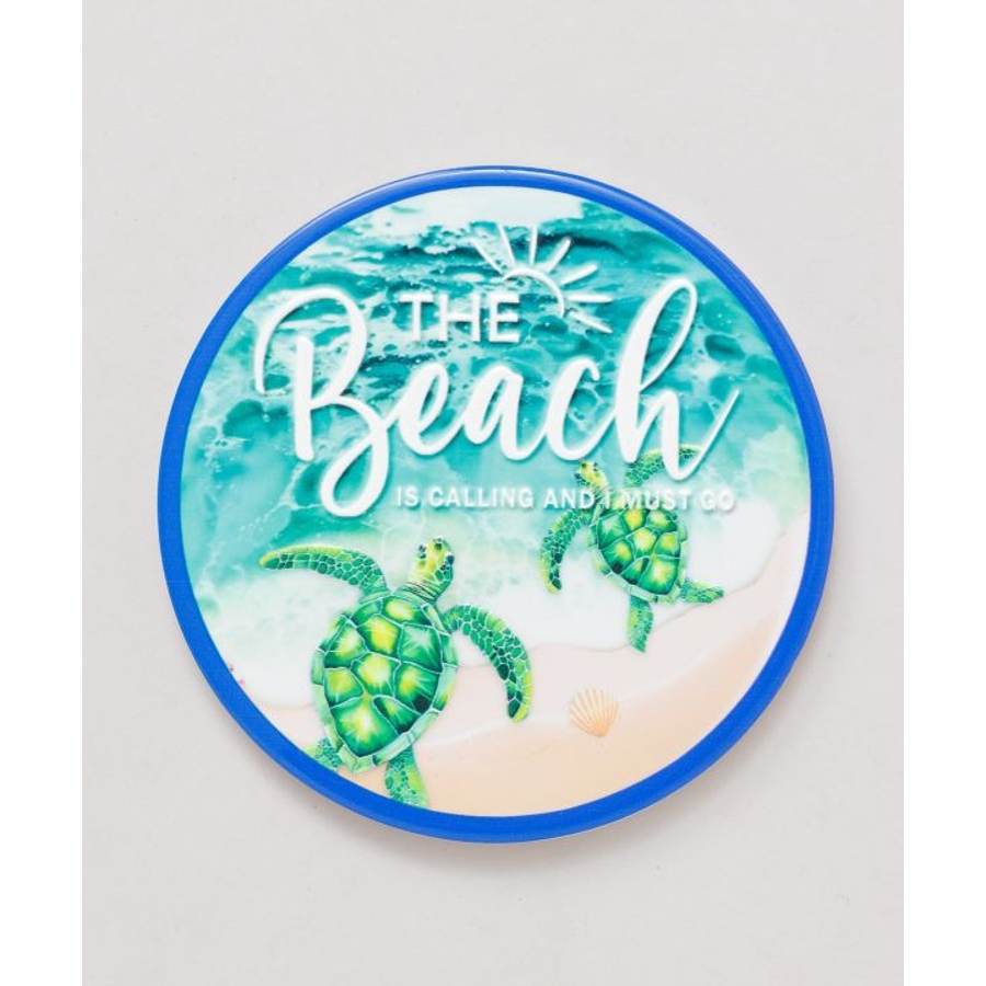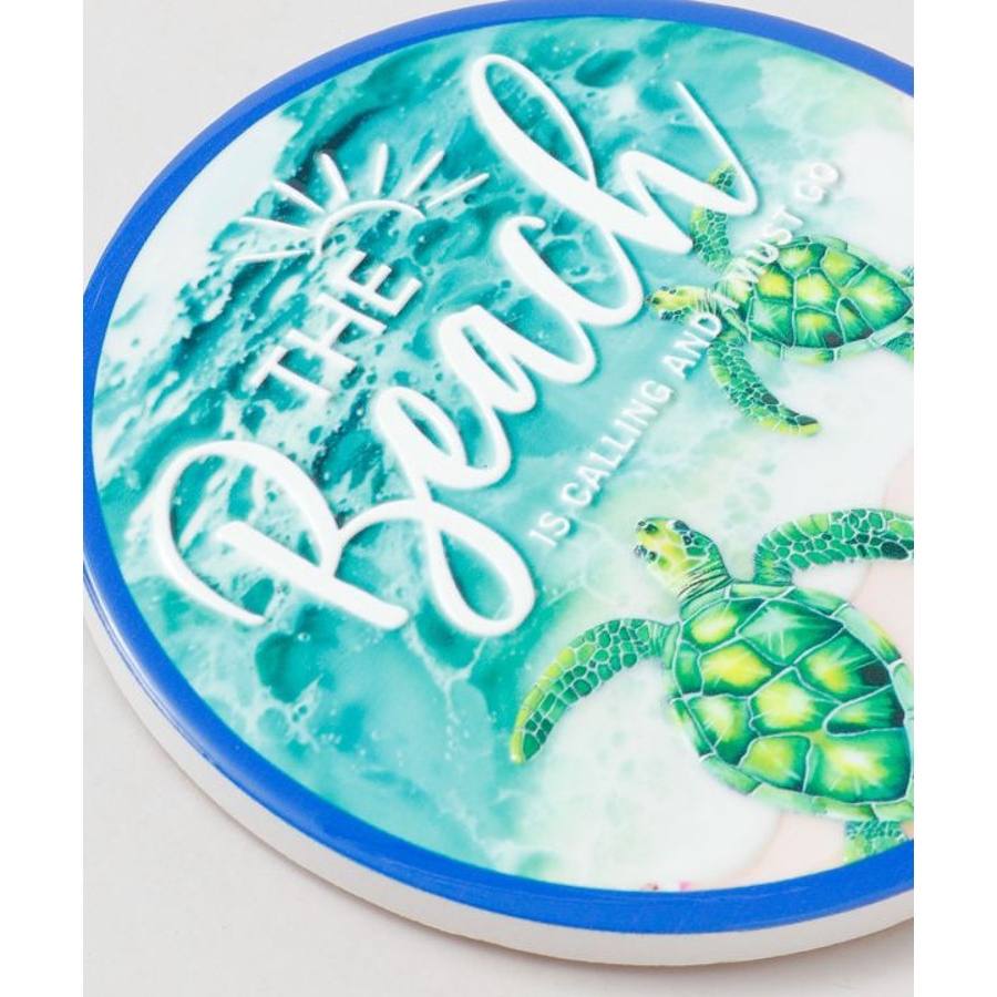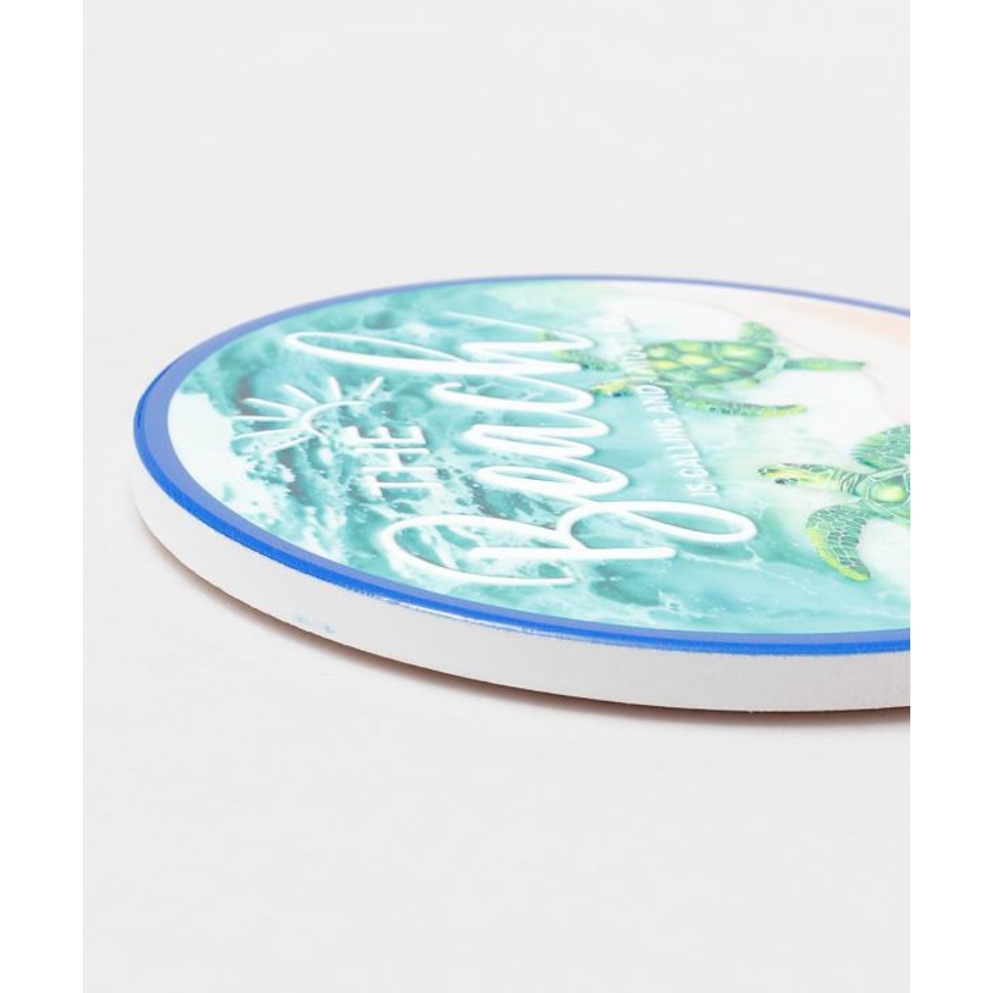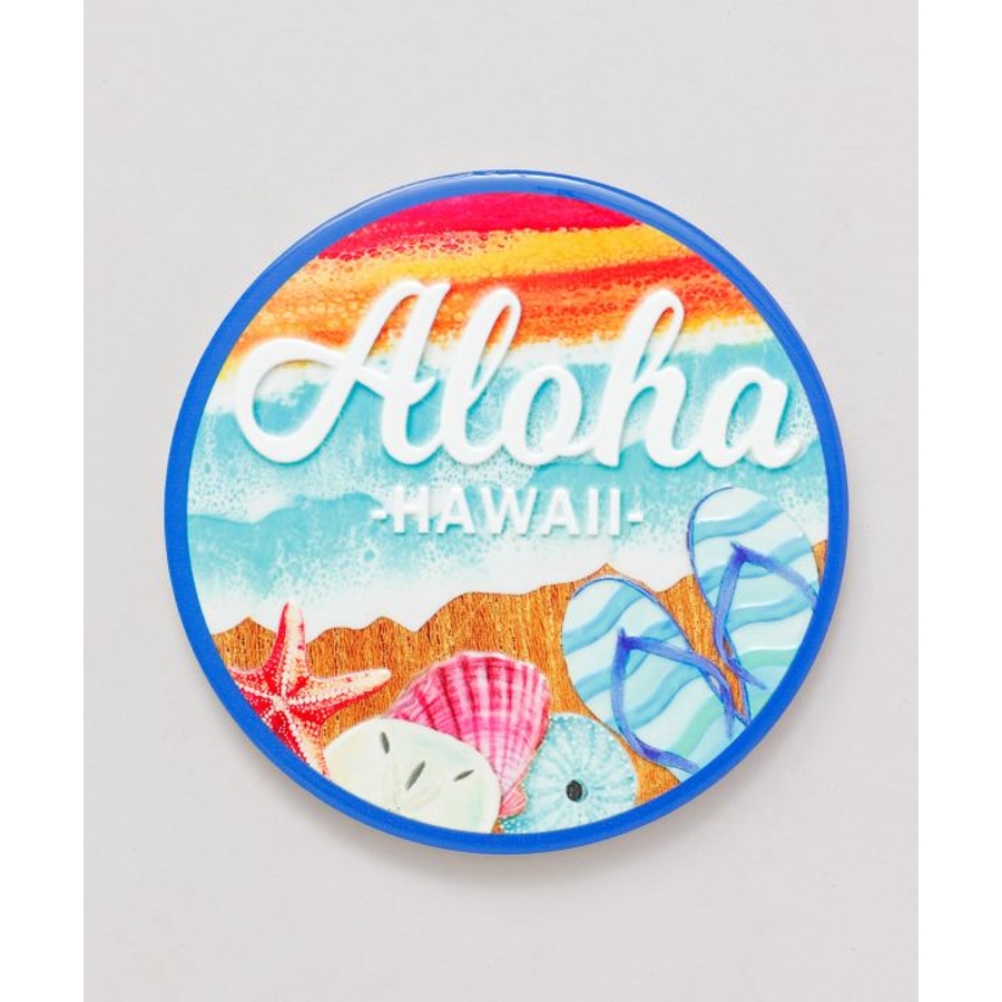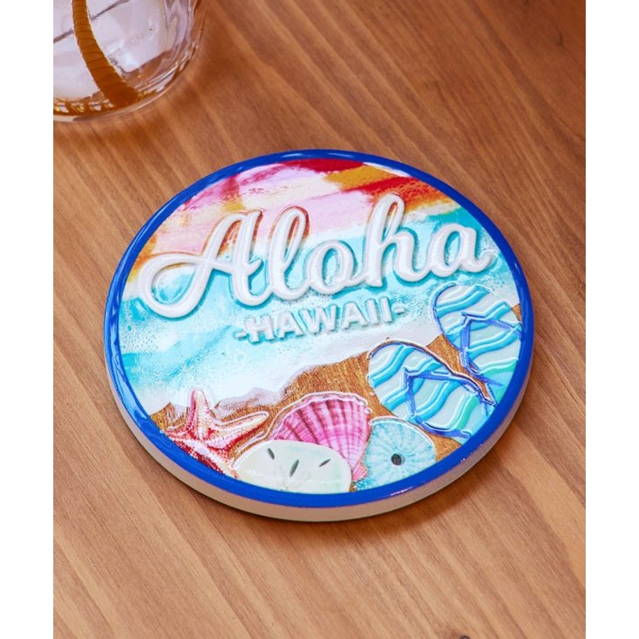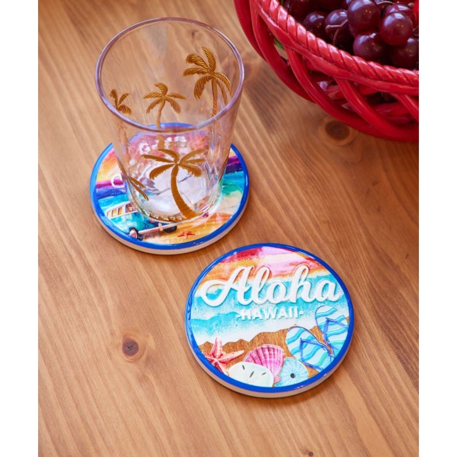 ハワイの美しい海の風景が描かれた陶器のコースター。インテリアとして飾りたくなるほどの美しさ。空と海のグラデーションが目を惹くデザインです。