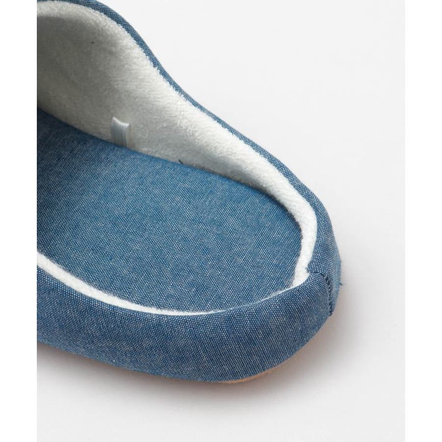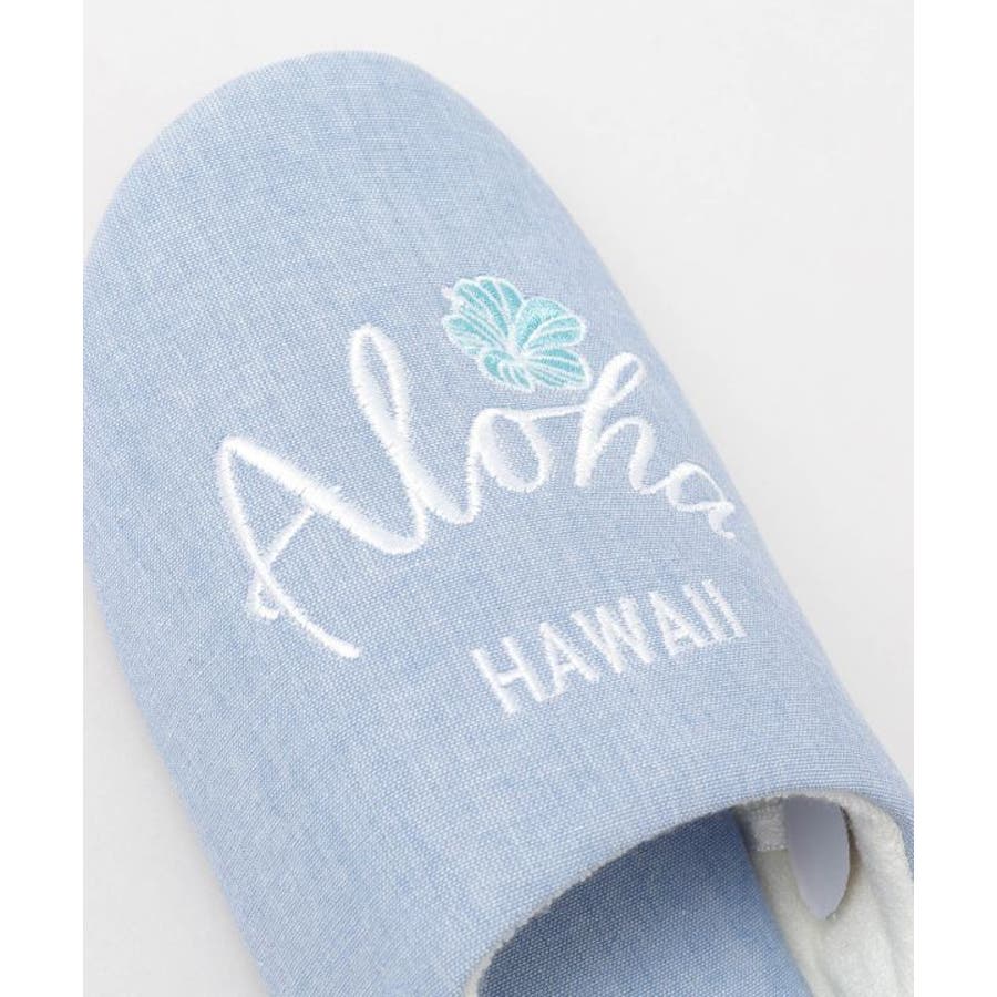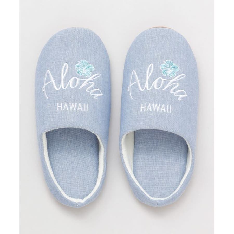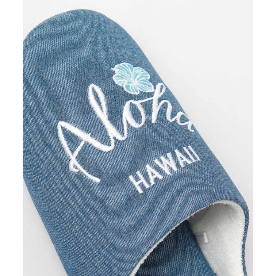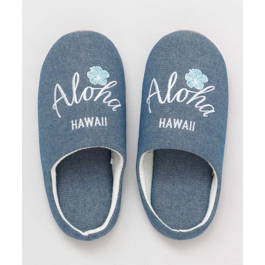 デニムのような色合いの生地にAlohaの文字が映えるスリッパ。裏地はパイル素材になっていて通年使えるデザインです。