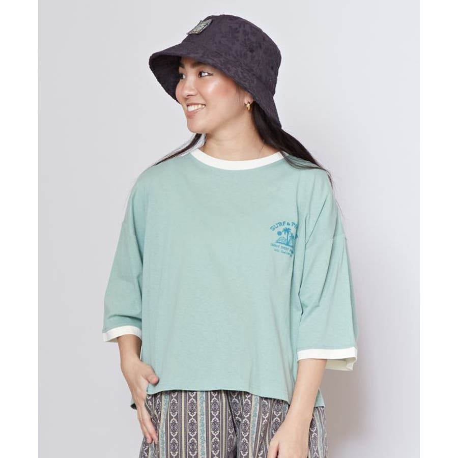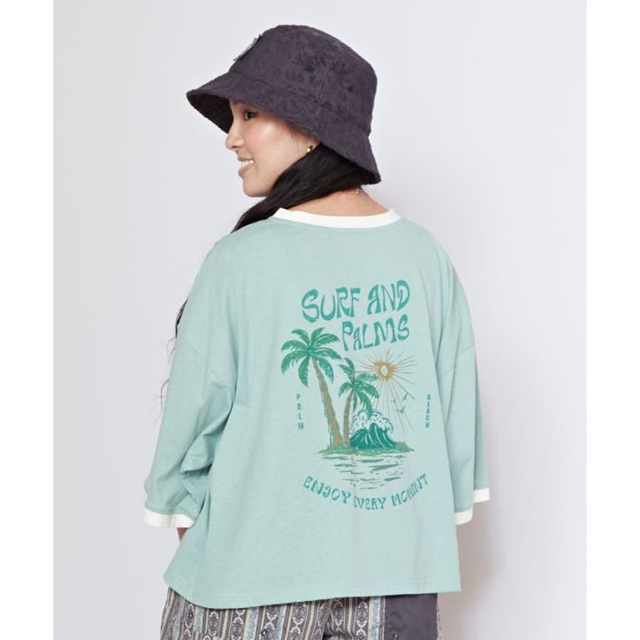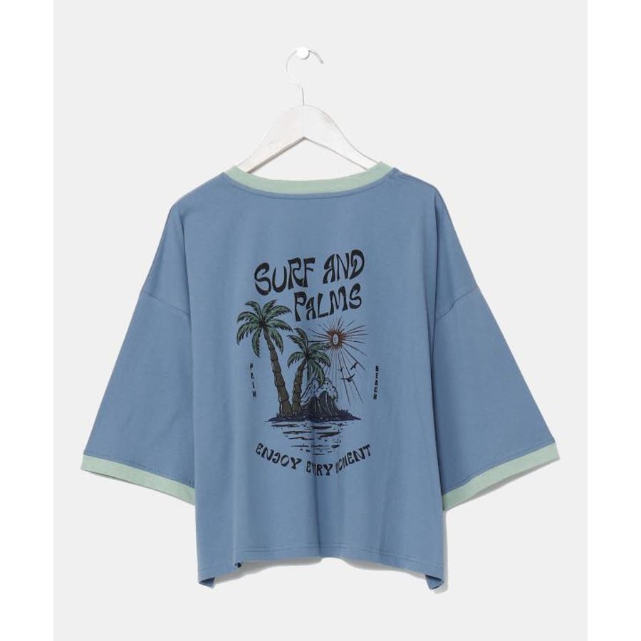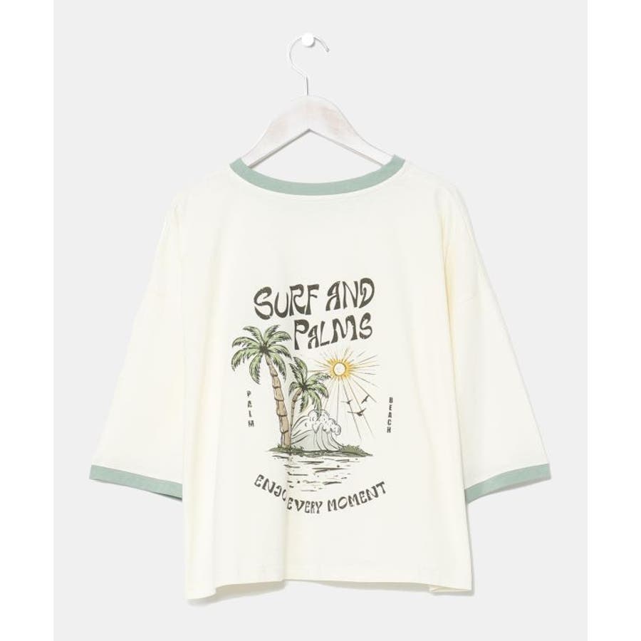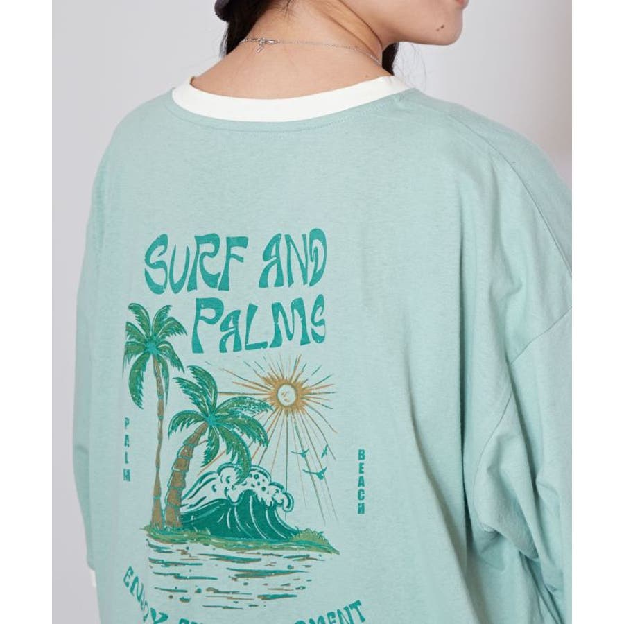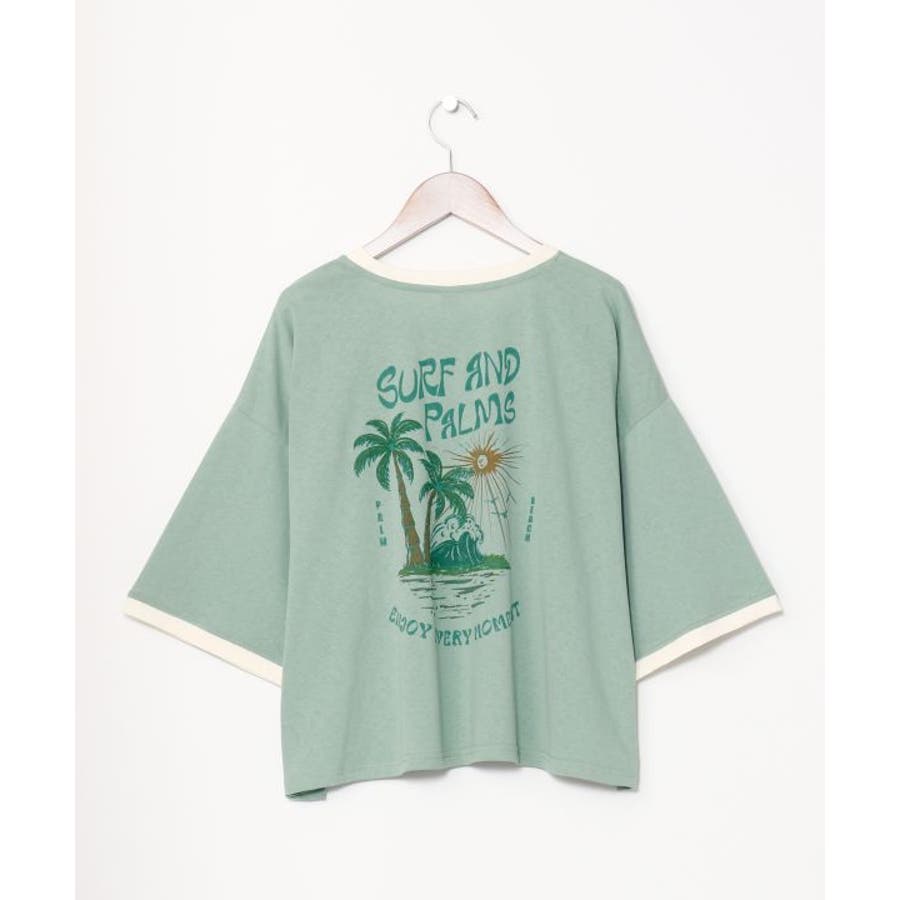 薄手のTシャツ。ゆったりとしたシルエット。サーフシーンをイメージしたバックプリントと、フロントのさりげないフロッキープリントがポイントです。襟と袖口の配色もポイント。
