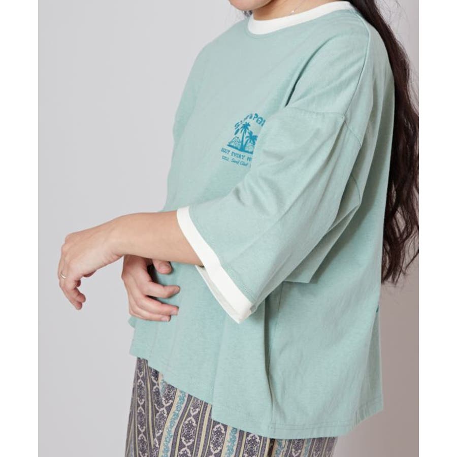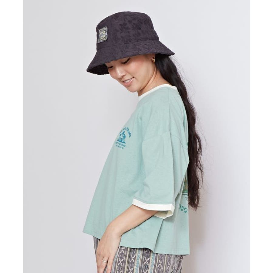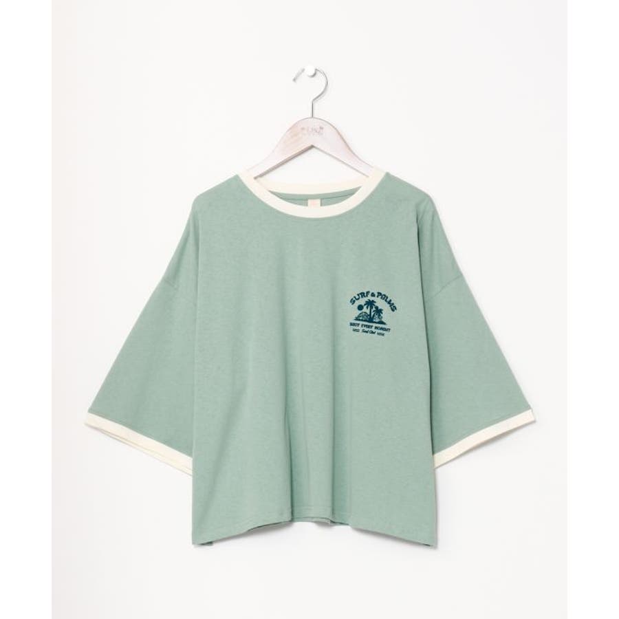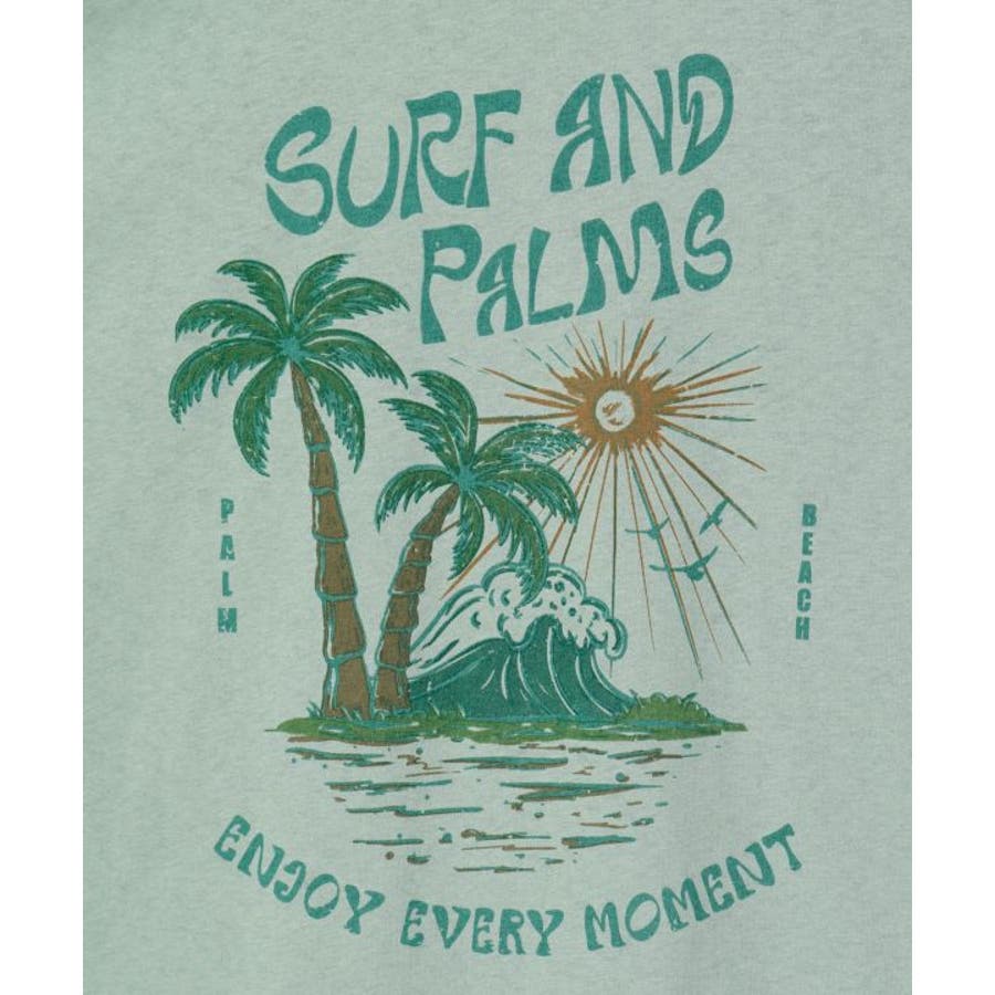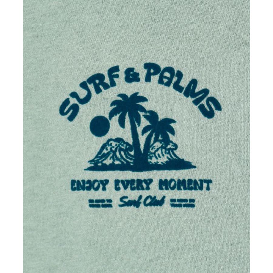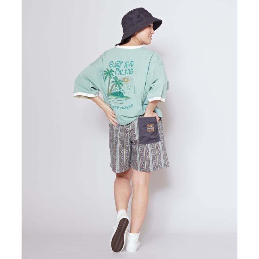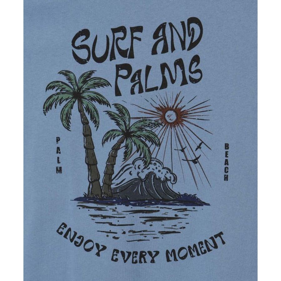 薄手のTシャツ。ゆったりとしたシルエット。サーフシーンをイメージしたバックプリントと、フロントのさりげないフロッキープリントがポイントです。襟と袖口の配色もポイント。