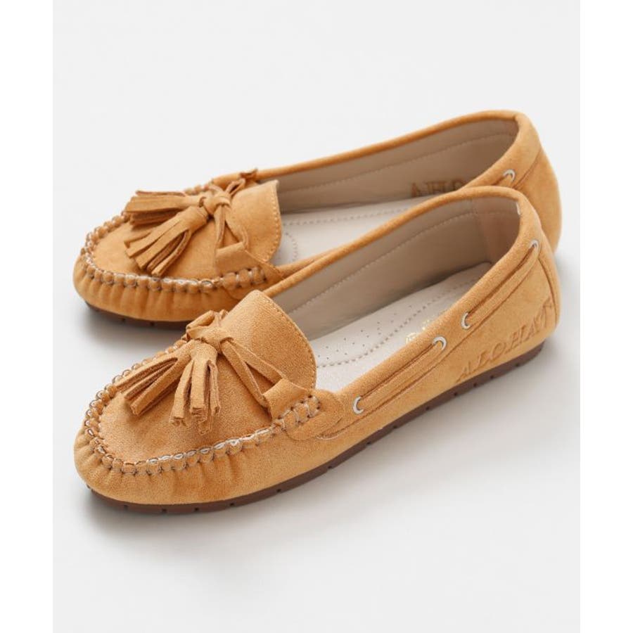 かかと部分の刺しゅうがポイントのモカシン。柔らかな素材で足になじみやすく、軽やかな履き心地。リラックス感がありながらも上品な印象で、ハワイの風を感じるナチュラルスタイルにぴったりの一足。