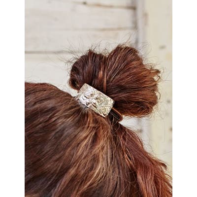可憐なプルメリアの花をハワイアンジュエリー風に刻印したプレートヘアゴム。カーブしていますので髪をまとめた時にヘアゴム部分が隠れ、お洒落な印象に◎ポニーテールやお団子ヘアにぴったりです♪