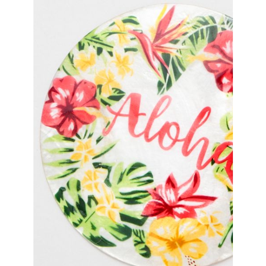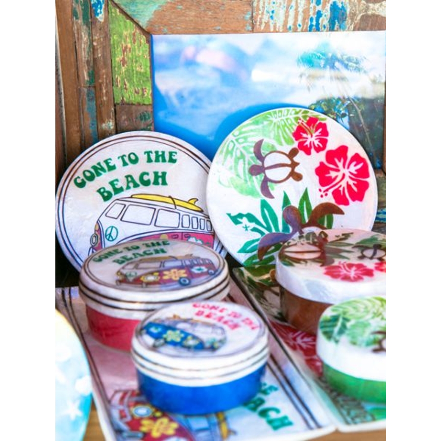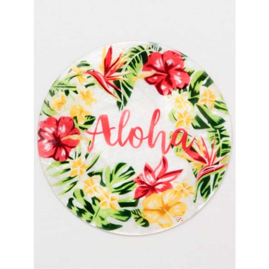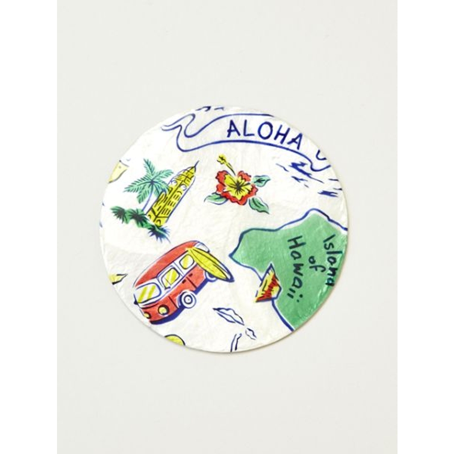 フィリピンの海でとれたカピス貝を加工し、プリントを施したコースター。光沢がありキラキラとした素材が魅力的です。食卓を涼やかに彩ってくれます。