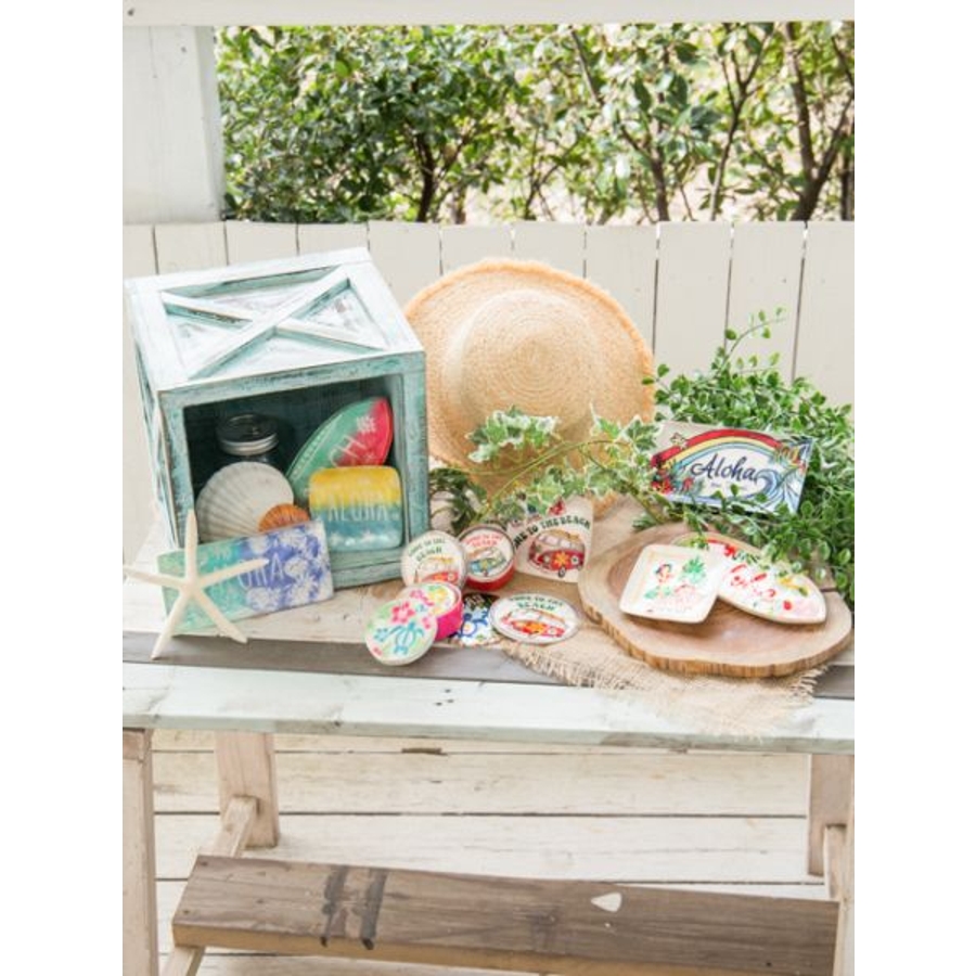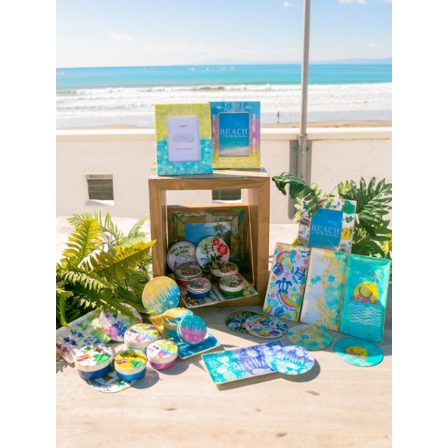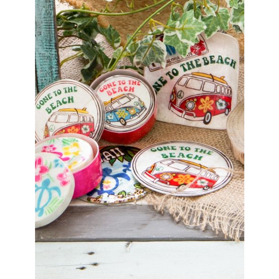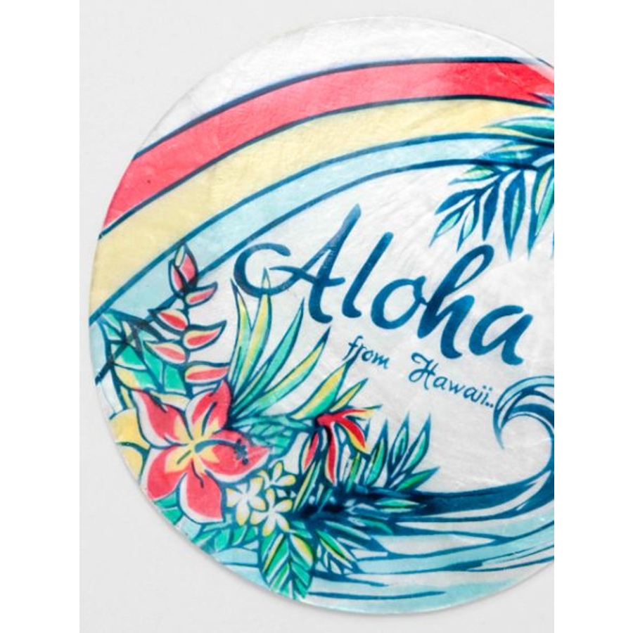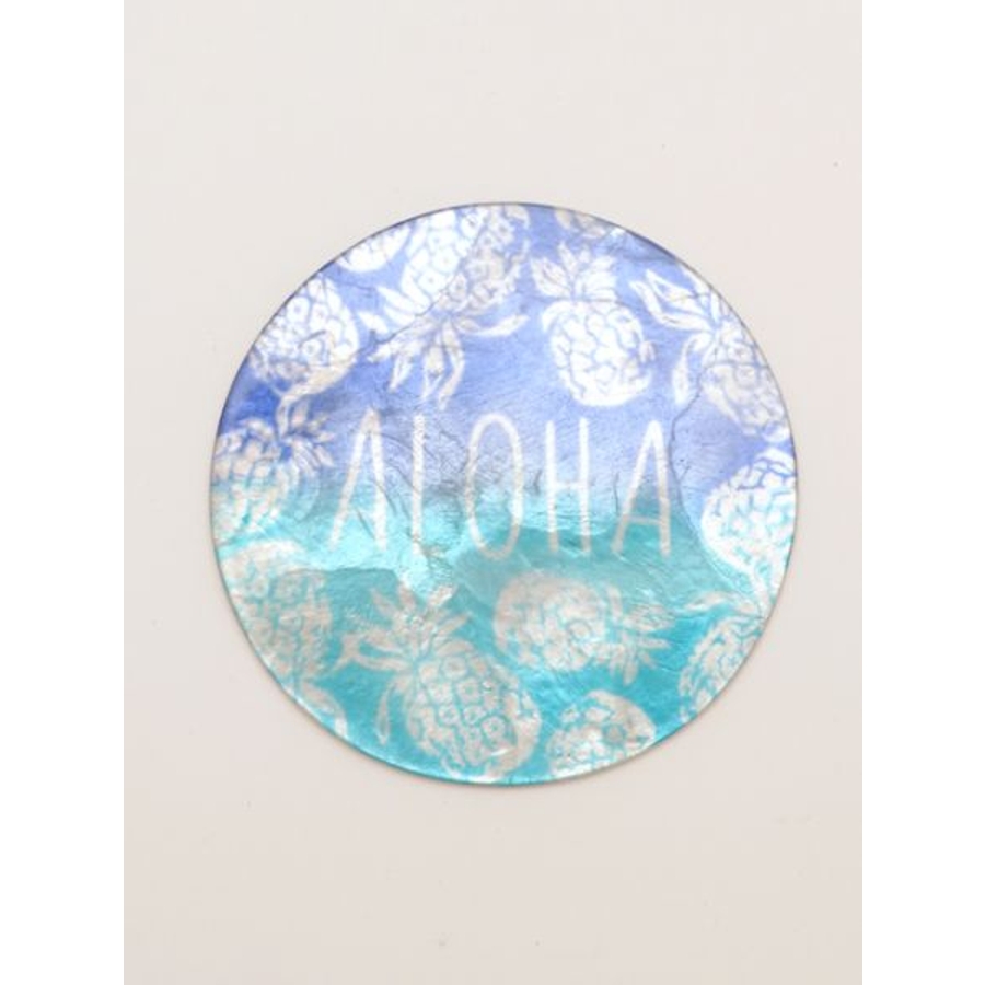 フィリピンの海でとれたカピス貝を加工し、プリントを施したコースター。光沢がありキラキラとした素材が魅力的です。食卓を涼やかに彩ってくれます。