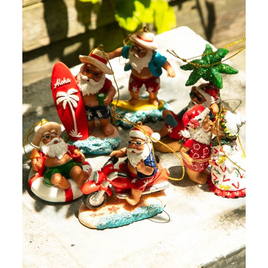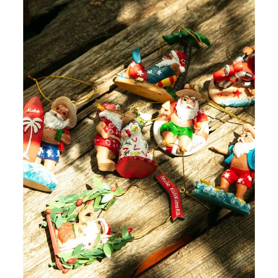 ハワイから届いたクリスマスオーナメント。カイムキクリスマスパレードを思い出すアイテム。それぞれ表情が違う愛くるしいハワイアンサンタのオーナメントは、リースに飾るだけでなく、玄関や棚上にちょこんと置いて飾るのもオススメです。お気に入りのあなただけのハワイアンサンタクロースを見つけてみてください。