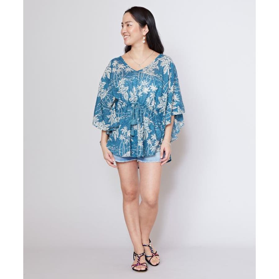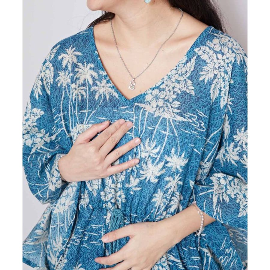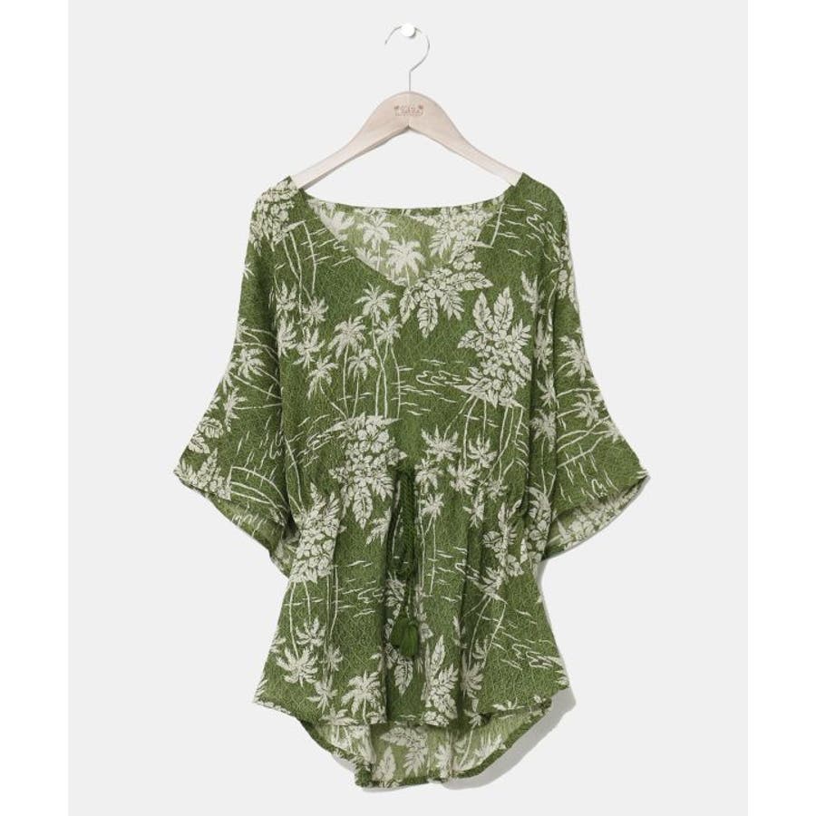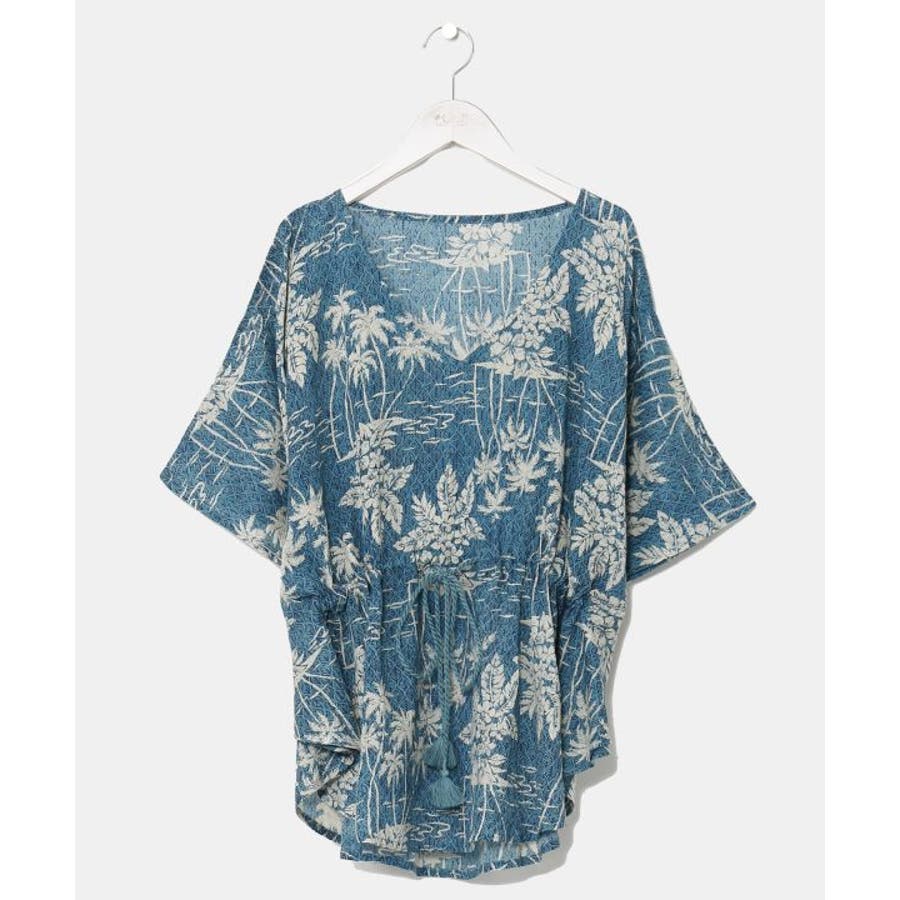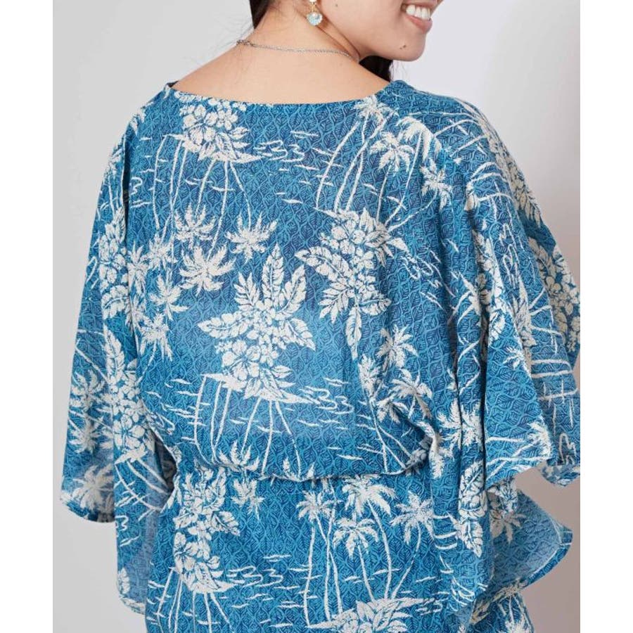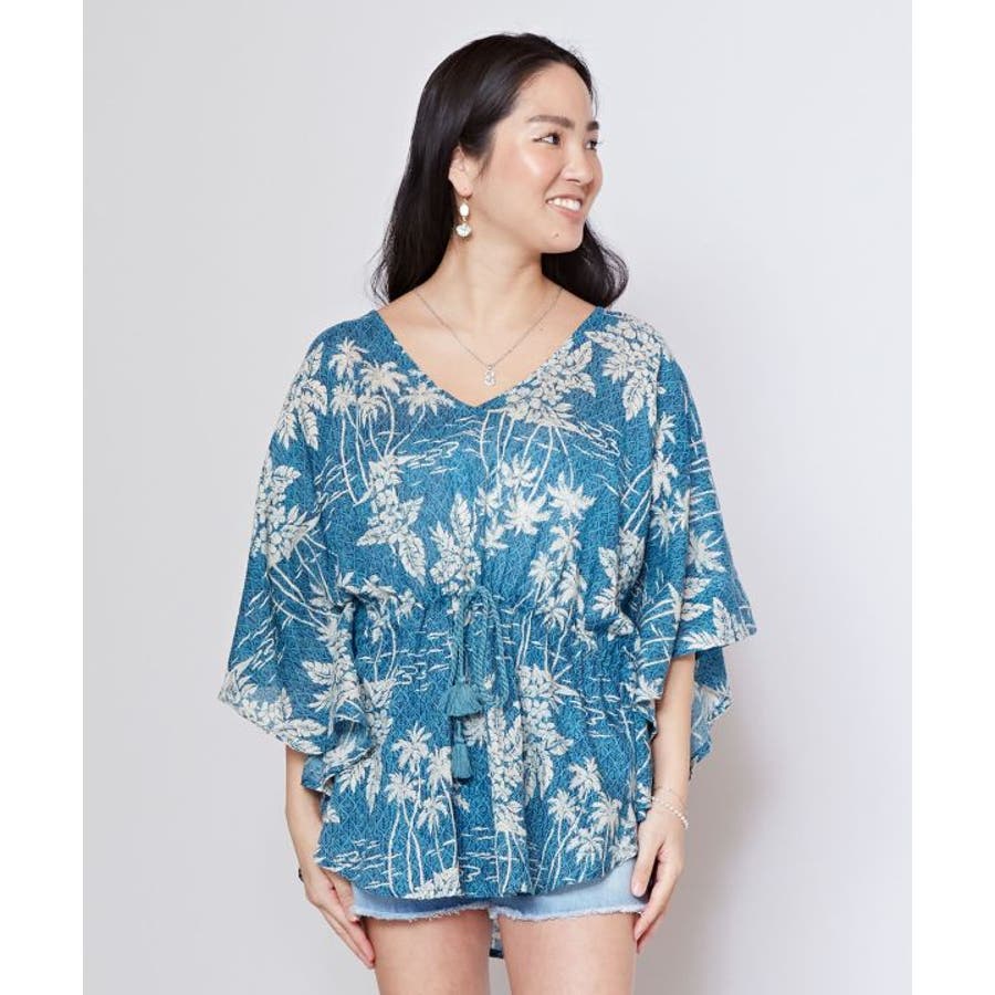 タパとヤシを重ねたビンテージ感のある柄のUVカット機能付きのトップス。ウエストの紐で調整可能です。カジュアルなスタイルにも、結婚式などの場面にもおすすめです。