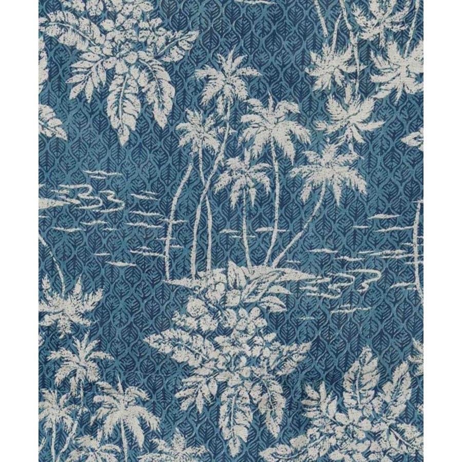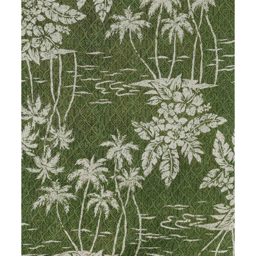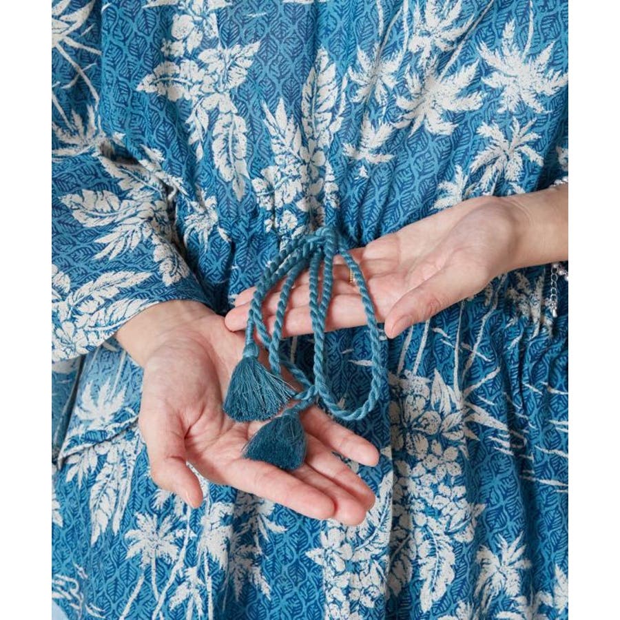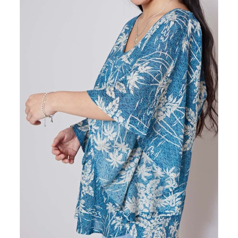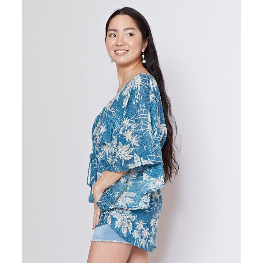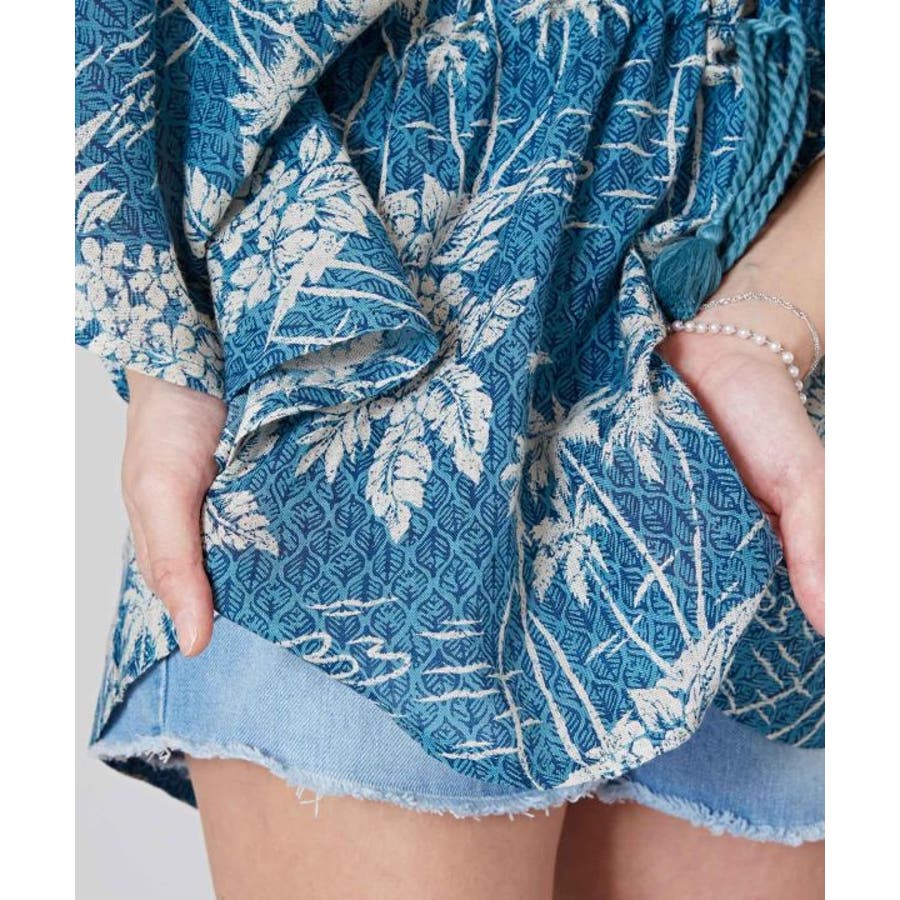 タパとヤシを重ねたビンテージ感のある柄のUVカット機能付きのトップス。ウエストの紐で調整可能です。カジュアルなスタイルにも、結婚式などの場面にもおすすめです。