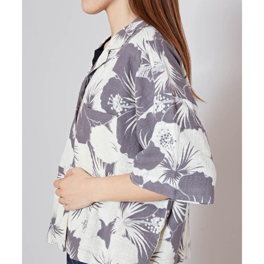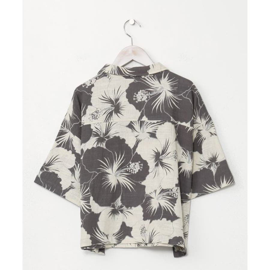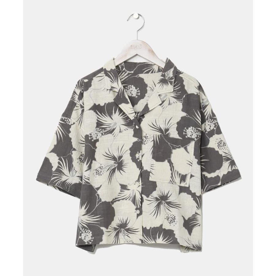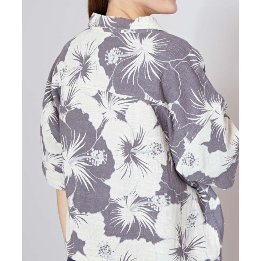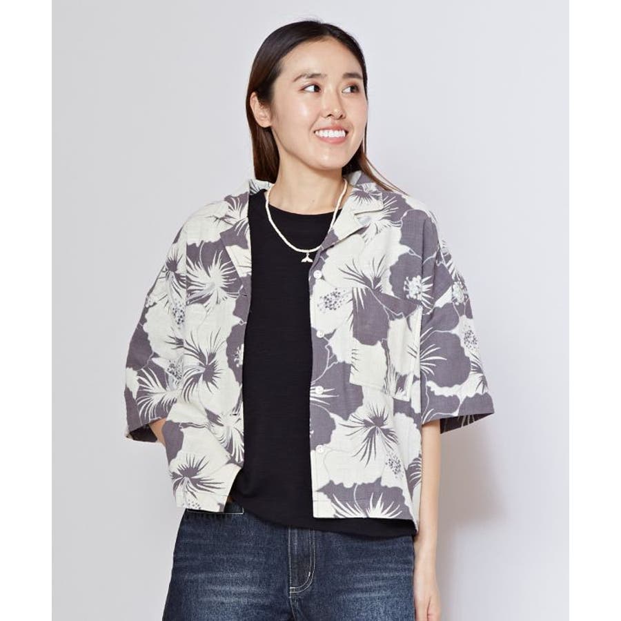 ざっくりとした風合いの綿素材の生地に、レトロ感のあるプリントが華やかなショート丈のアロハシャツ。ボタンを開けて羽織りとしても活躍します。