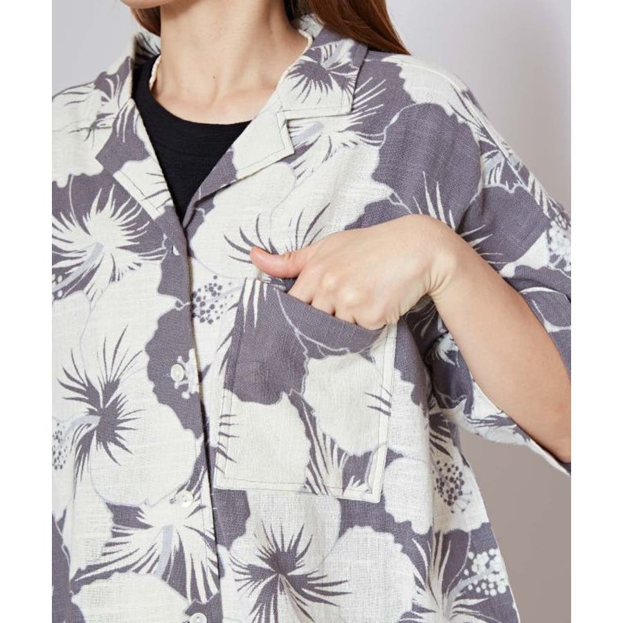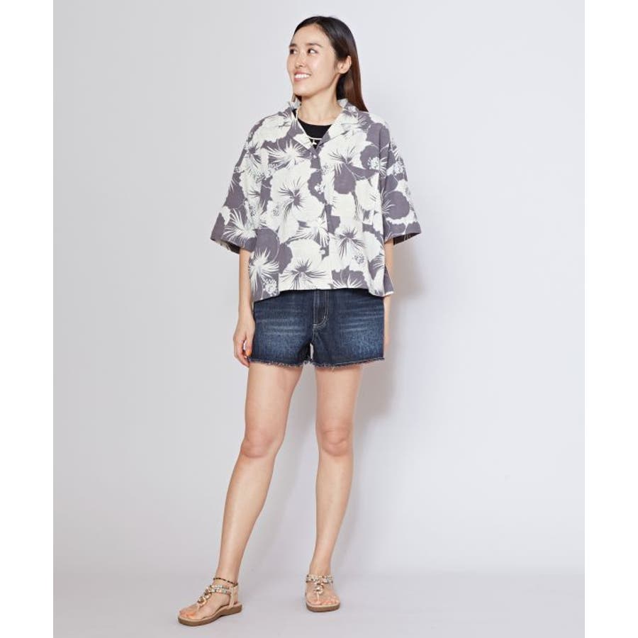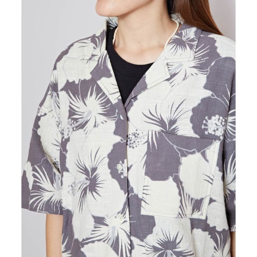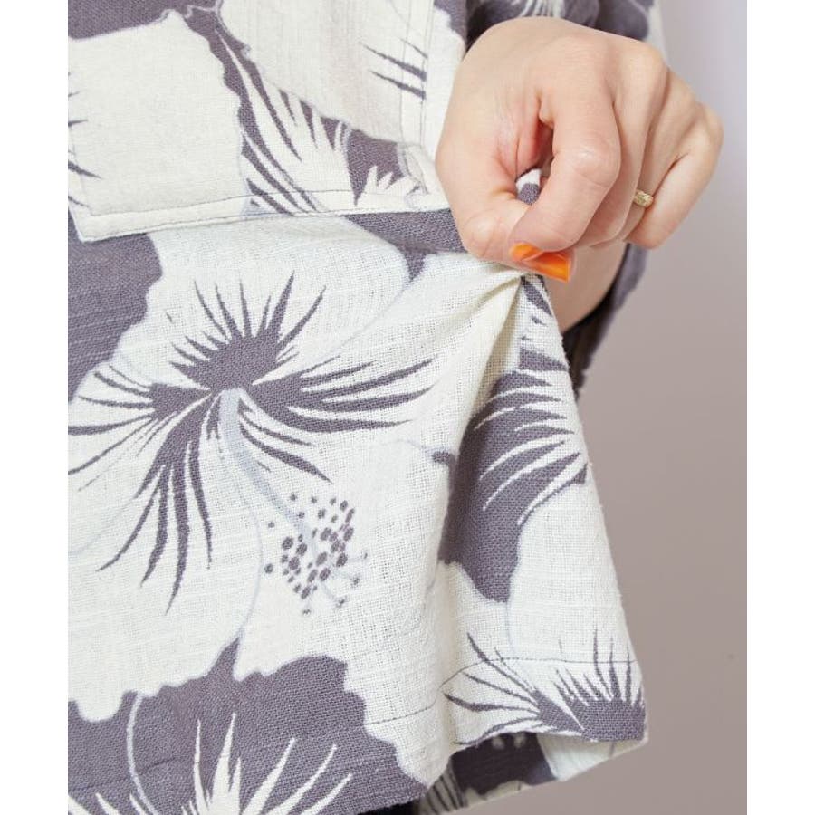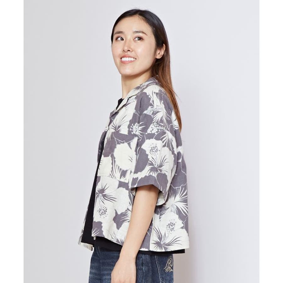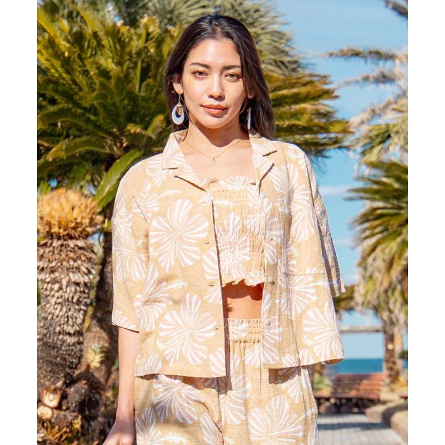 ざっくりとした風合いの綿素材の生地に、レトロ感のあるプリントが華やかなショート丈のアロハシャツ。ボタンを開けて羽織りとしても活躍します。