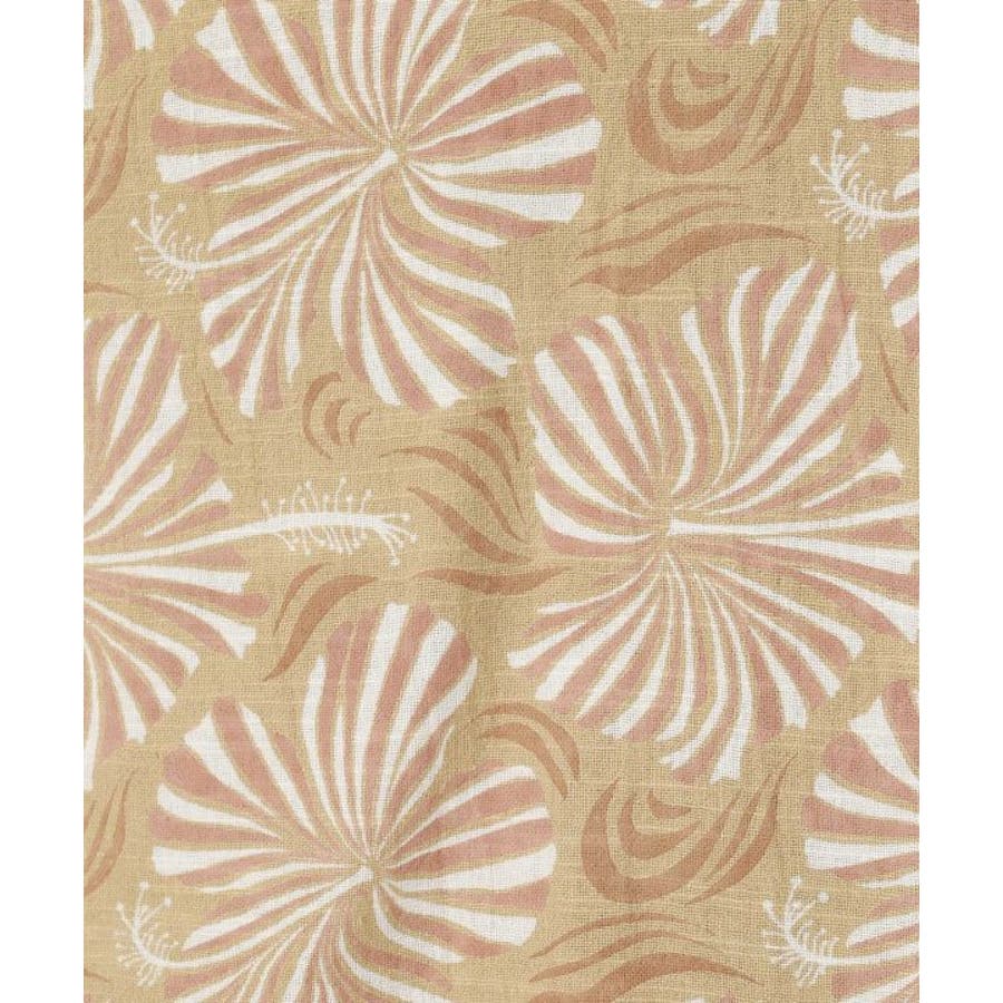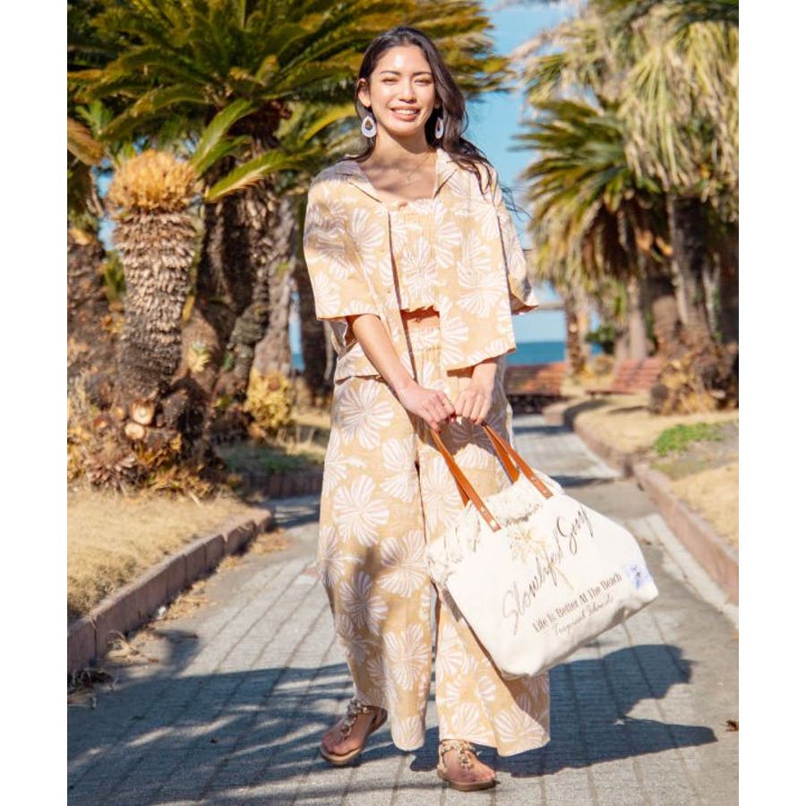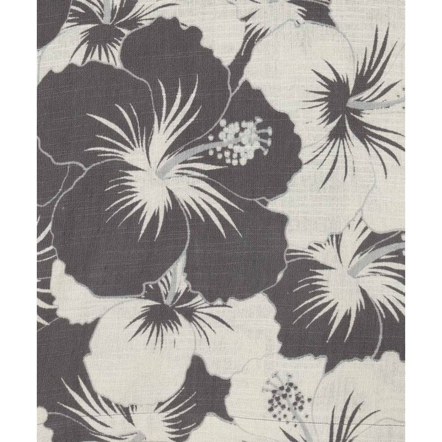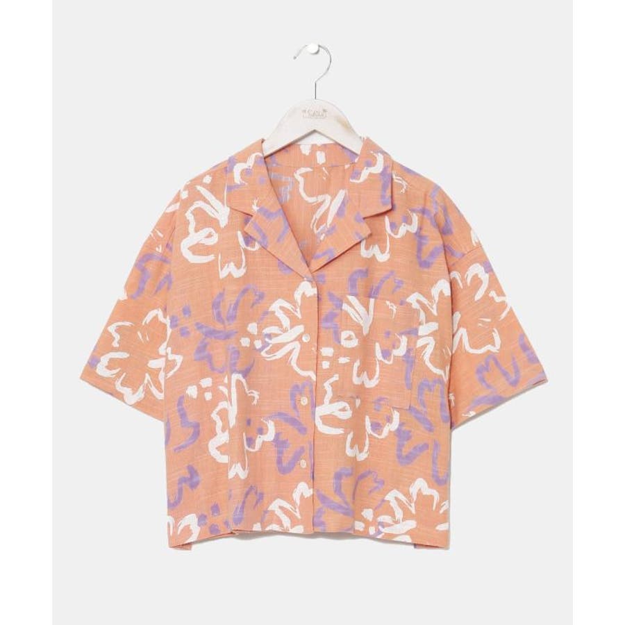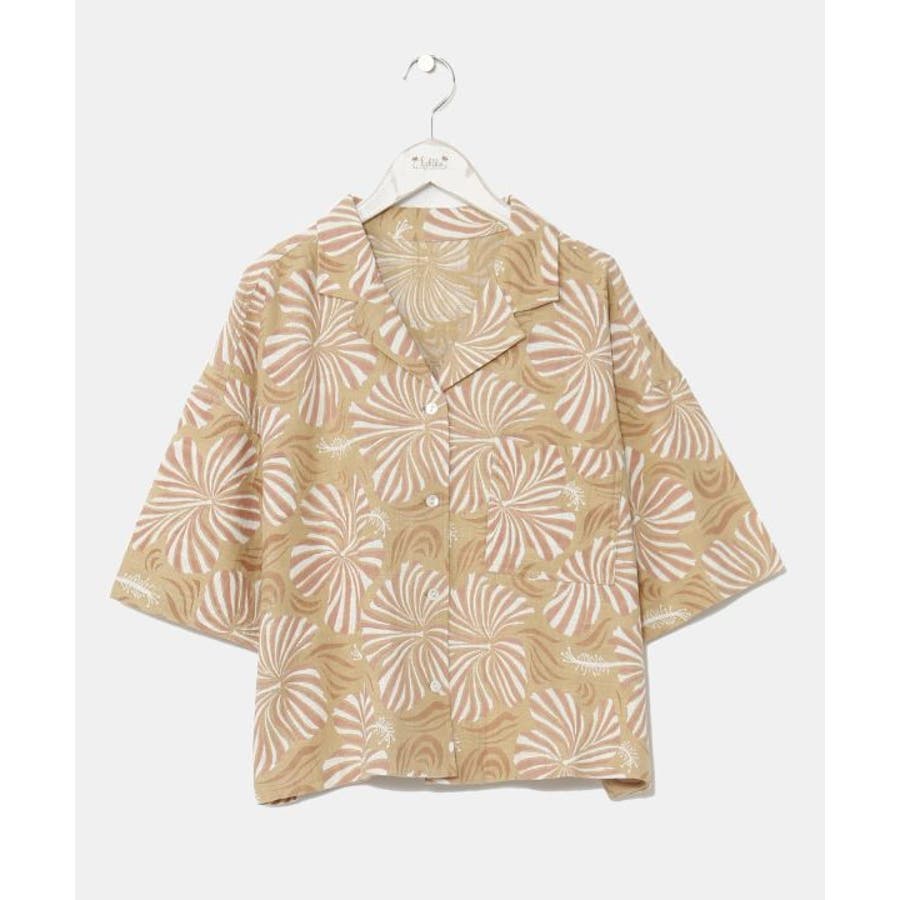 ざっくりとした風合いの綿素材の生地に、レトロ感のあるプリントが華やかなショート丈のアロハシャツ。ボタンを開けて羽織りとしても活躍します。
