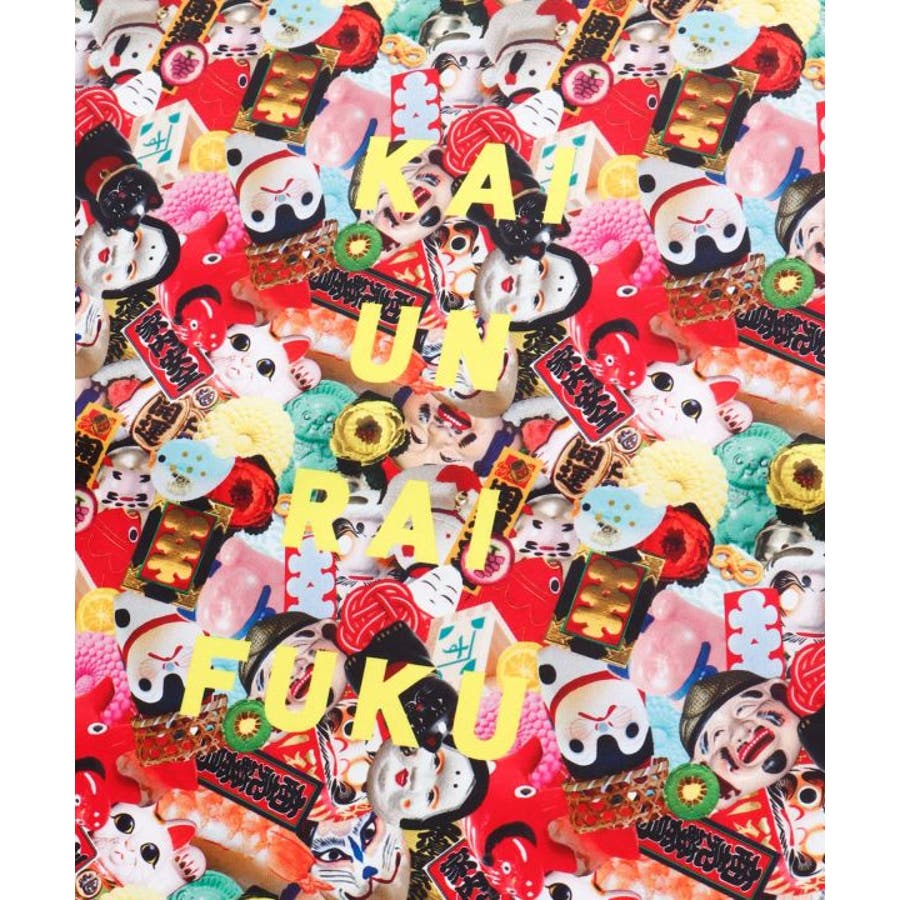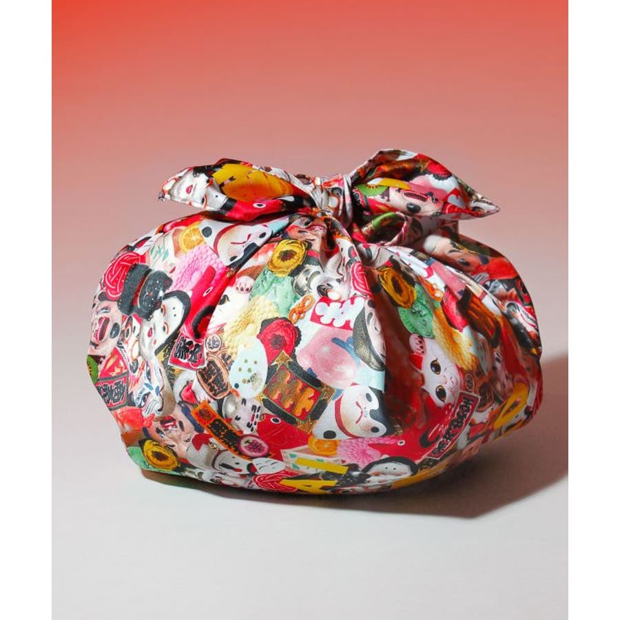 日本の縁起物や祝いものを詰め込んだ、賑やかな「開運来福」風呂敷。撥水生地なので、ちょっとした雨でも中の荷物を守ってくれます。