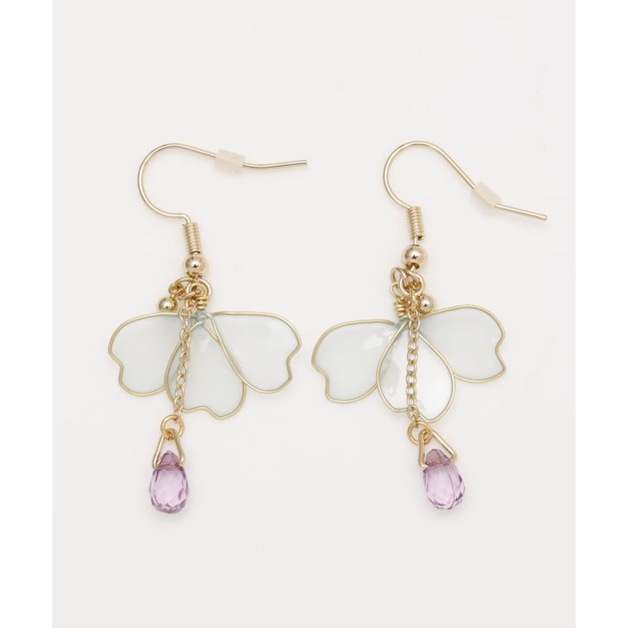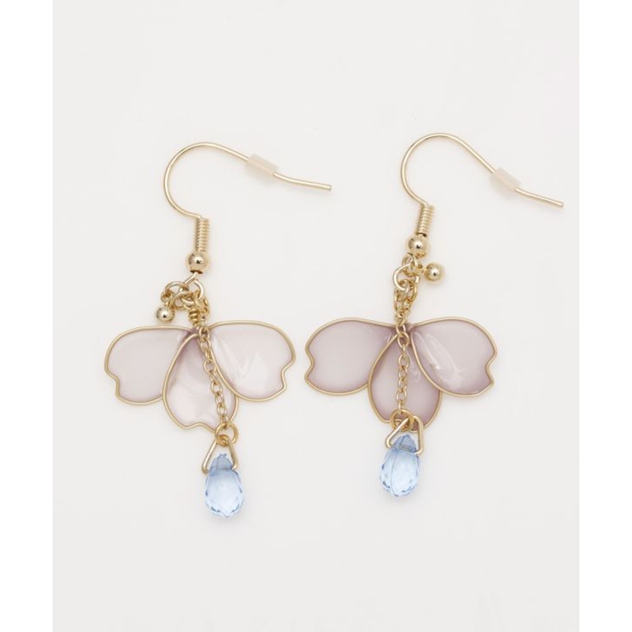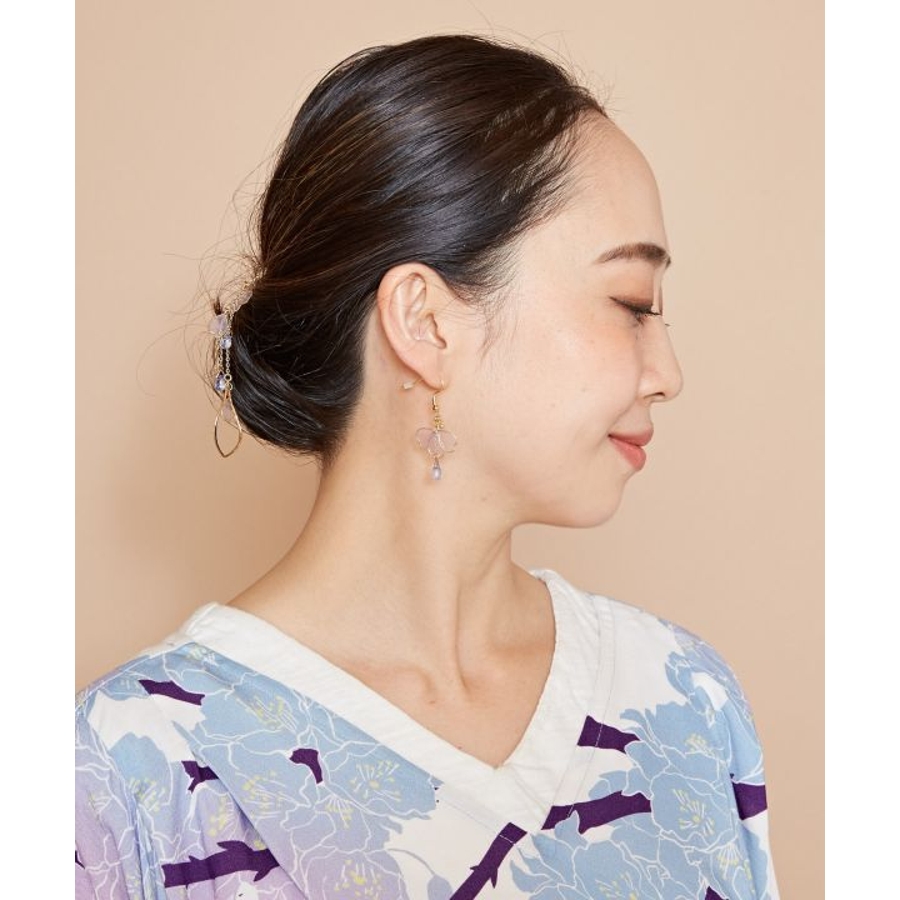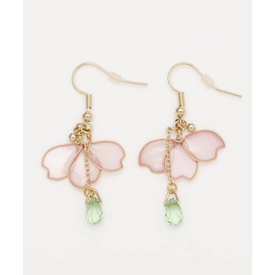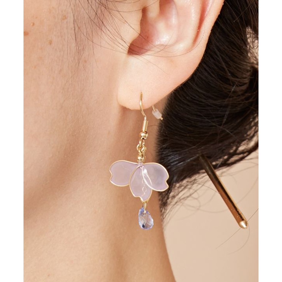 柔らかな色合いで桜の花を表現したピアス。透明感のある花びらに、きらりと輝くガラスビーズが上品な印象を与えてくれます。