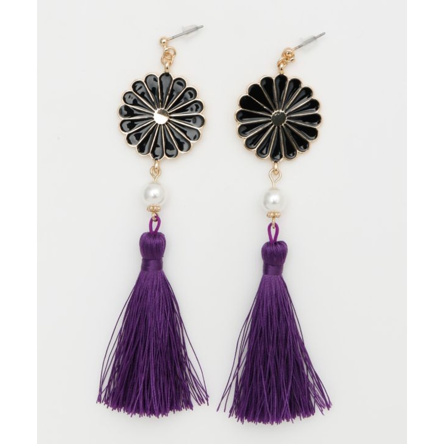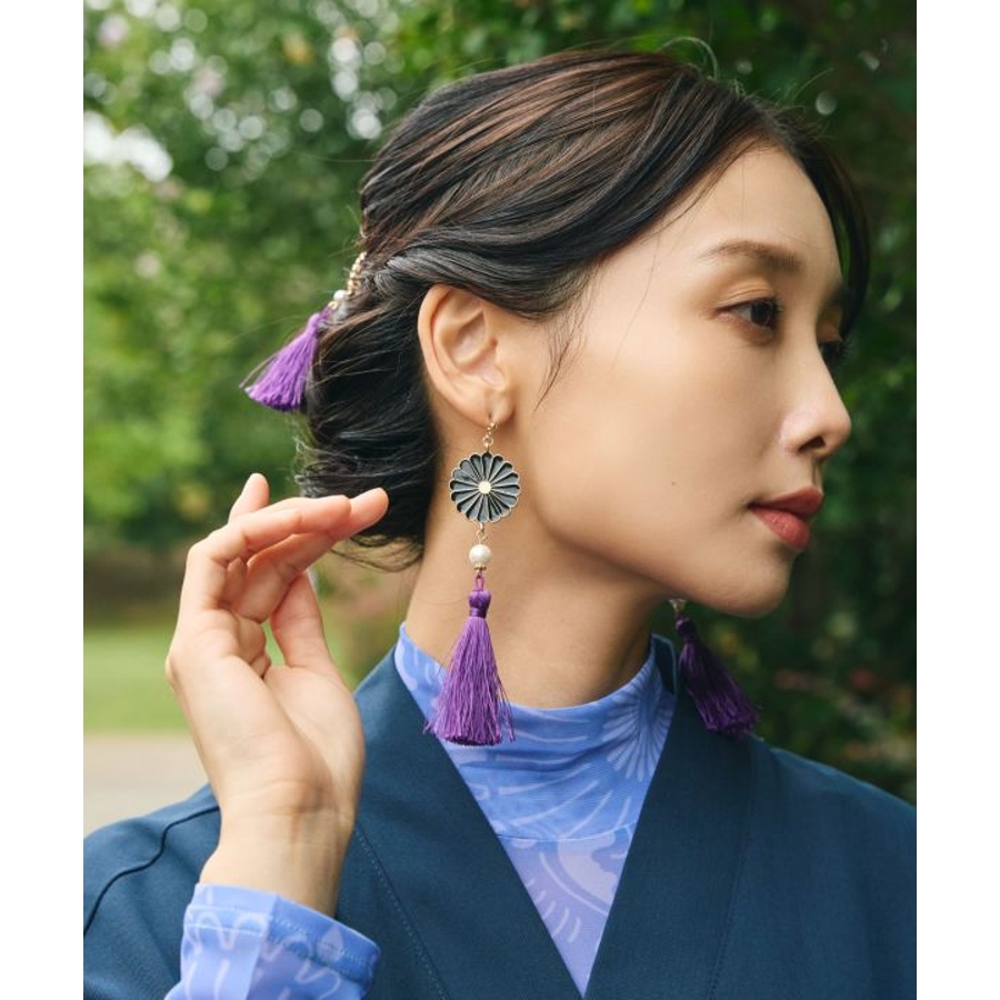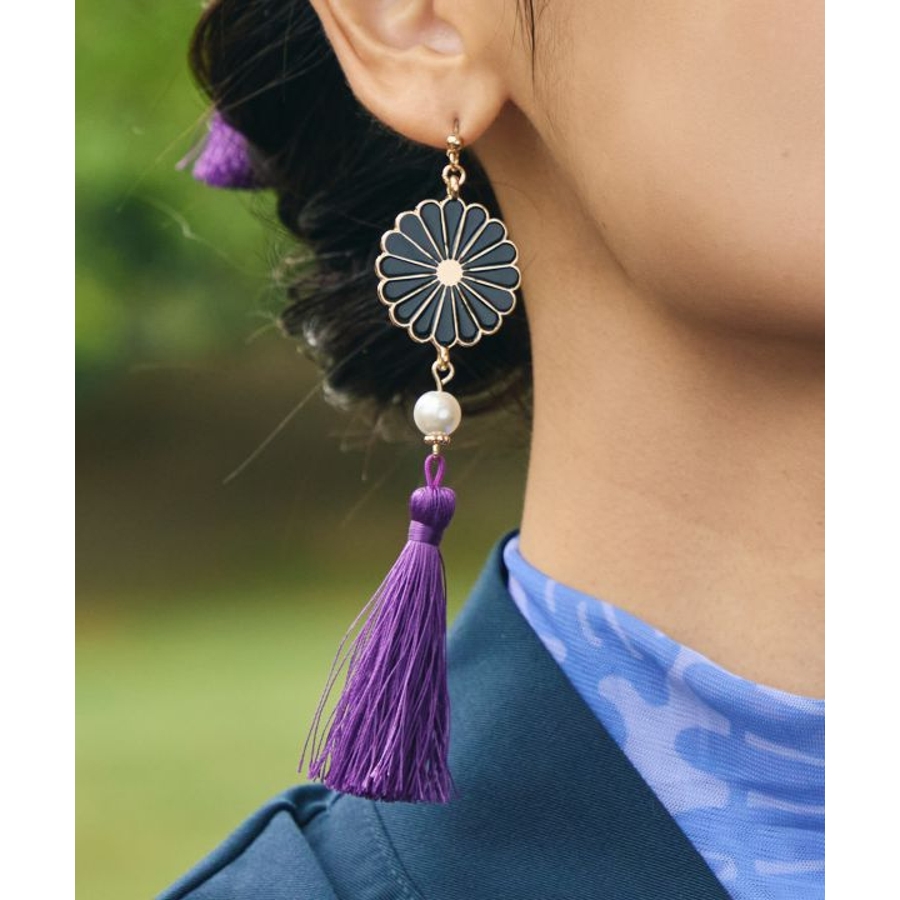 菊の花をモチーフにした存在感のあるレトロなピアス。大ぶりのタッセルがゆらめき、動くたびに優美な印象を与えます。和装にはもちろん、モダンな装いのアクセントにもおすすめのアイテムです。