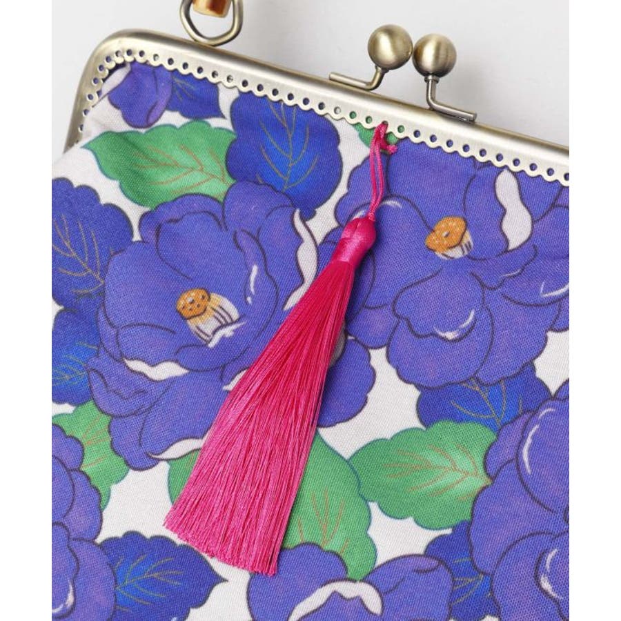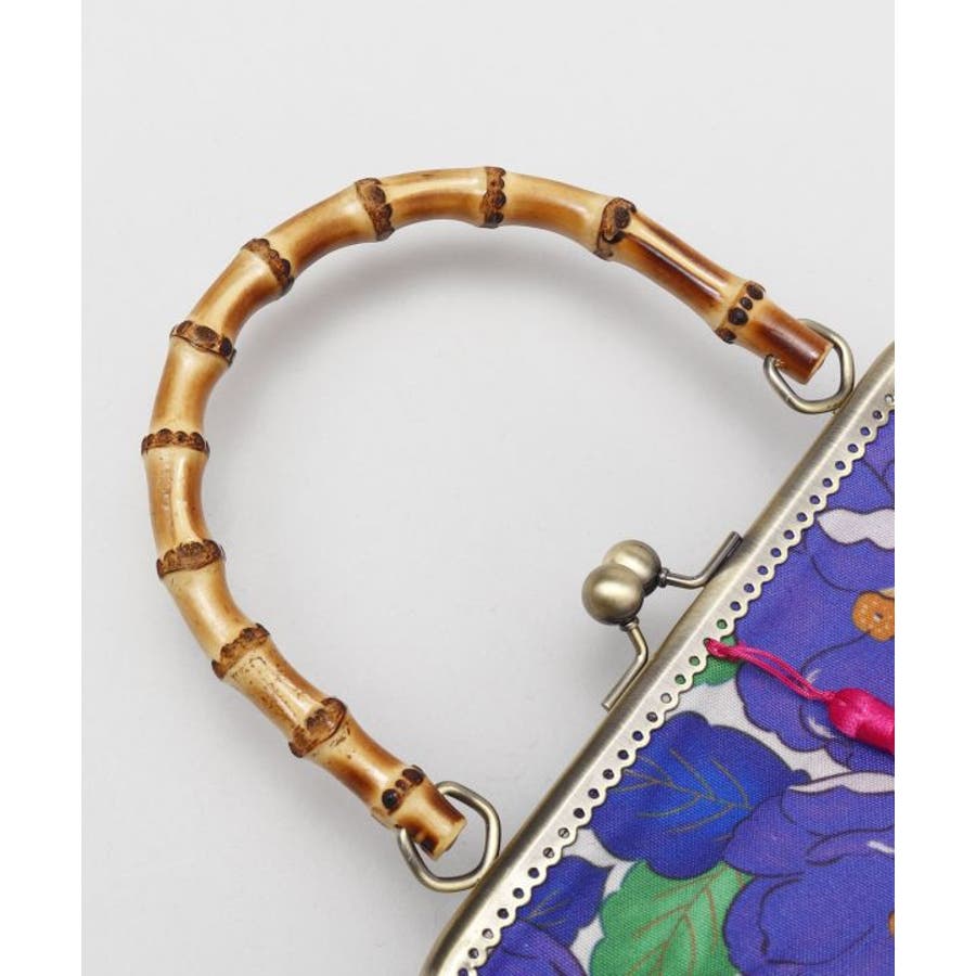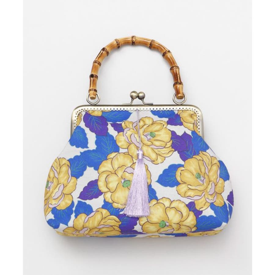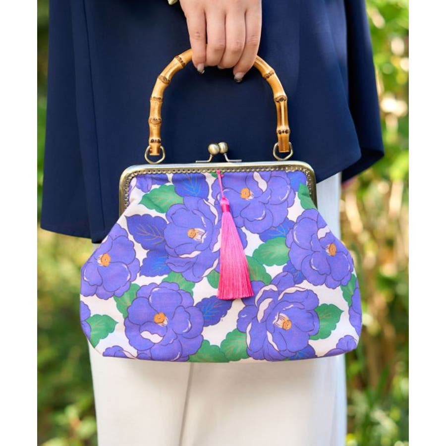 彩り華やかな椿がデザインされたバッグ。バンブー素材の持ち手で、レトロな印象に仕上げました。マチ付きで600mlのペットボトルもすっぽり入ります。大きく開く口金なので中が見やすくて便利。内ポケット付き。