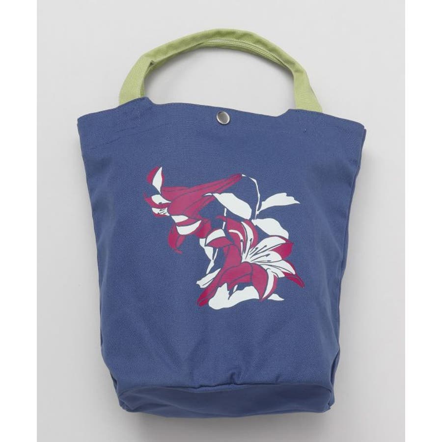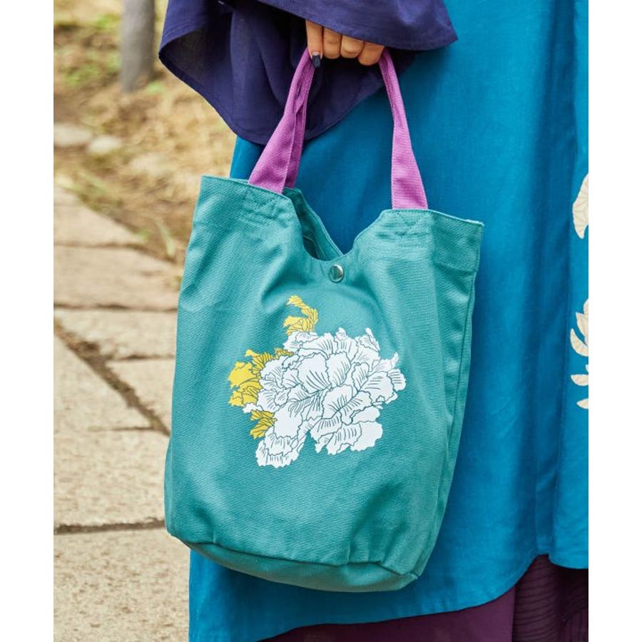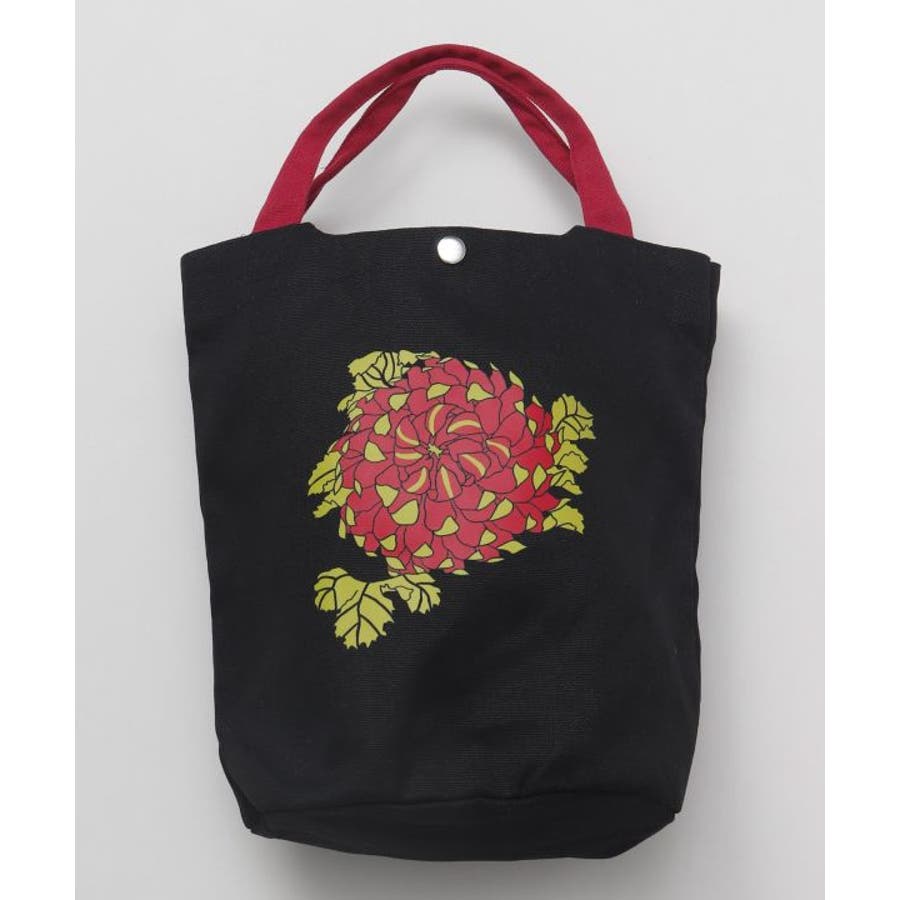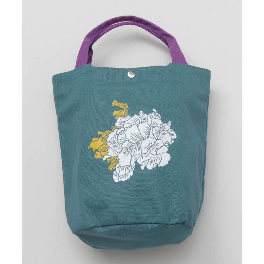 鮮やかな花を大胆にプリントした樽型のトートバッグ。ちょっとしたお出かけにも使いやすいサイズ感。持ち手もしっかりしていて持ちやすいです。