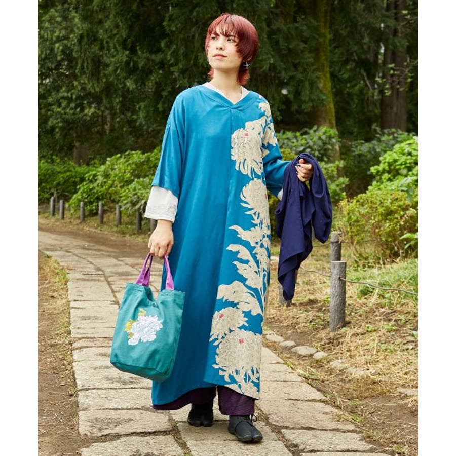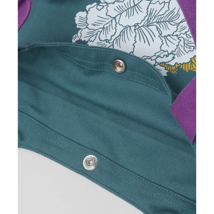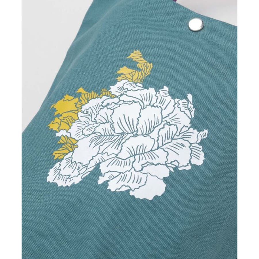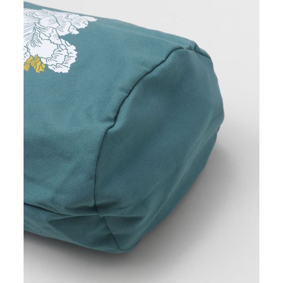 鮮やかな花を大胆にプリントした樽型のトートバッグ。ちょっとしたお出かけにも使いやすいサイズ感。持ち手もしっかりしていて持ちやすいです。