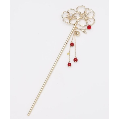 牡丹のつぼみが開花する様子を表した透かし絵のような簪(かんざし)。小さな鈴とチェーンが歩くたびにシャラシャラと揺れ、存在感を増します。髪飾りから和を取り入れてみてはいかがでしょうか。