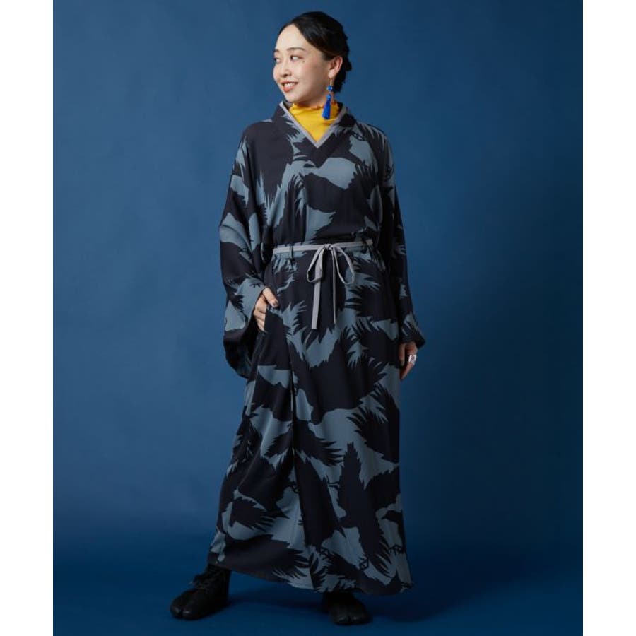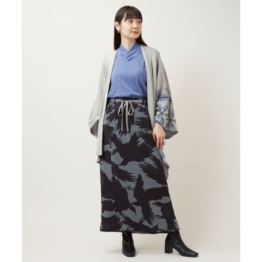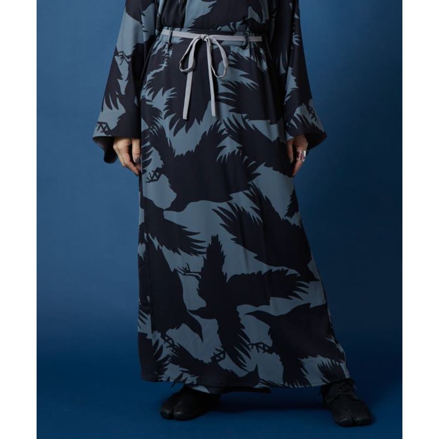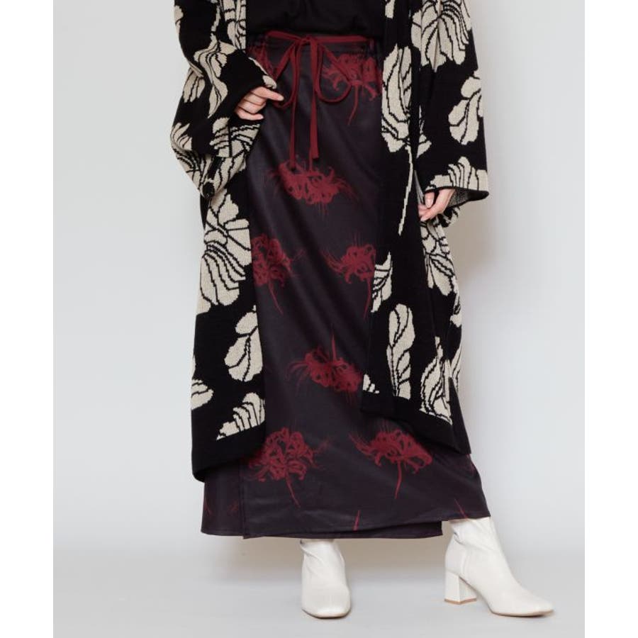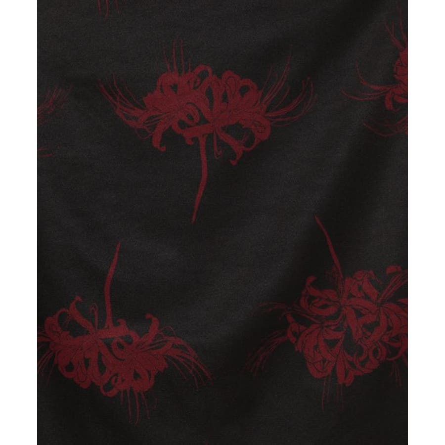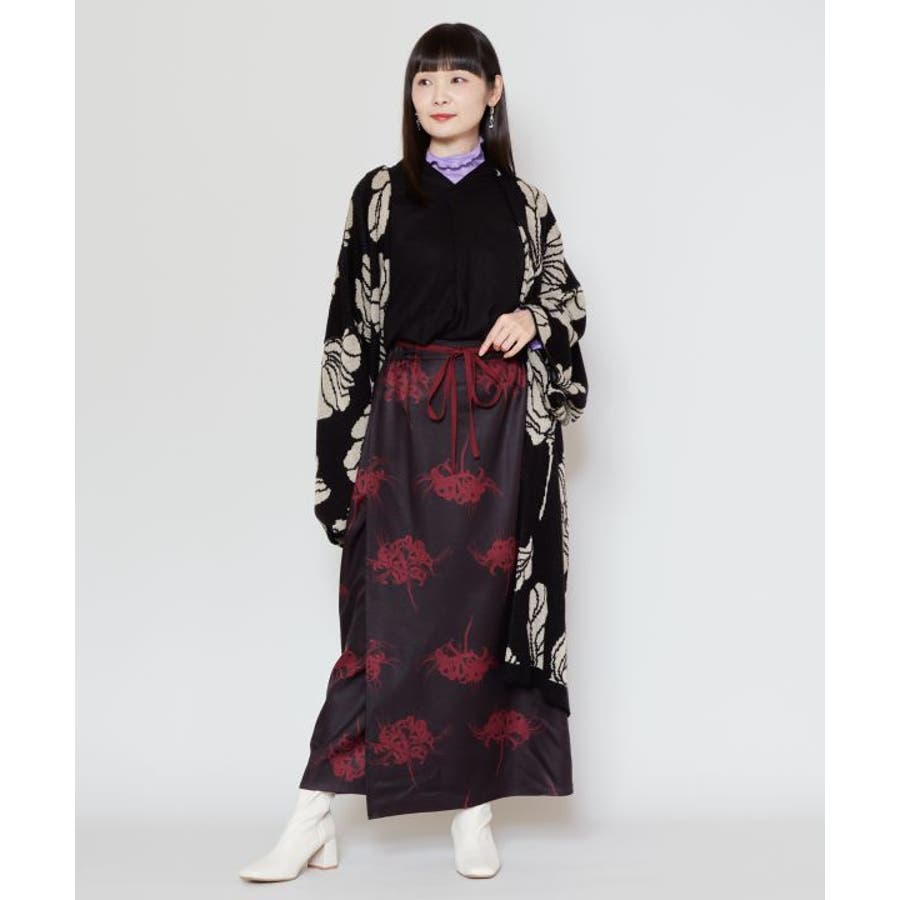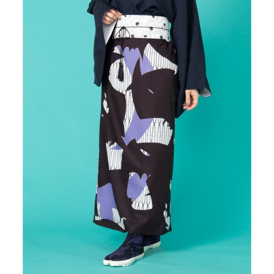 「彼岸花」「コウモリ」「ざくろ」柄を、現代的な色彩で大胆に描いたスカート。トップスと合わせてセットアップで着用すれば、スタイリッシュな和装カジュアルが完成。両サイドポケット付き。