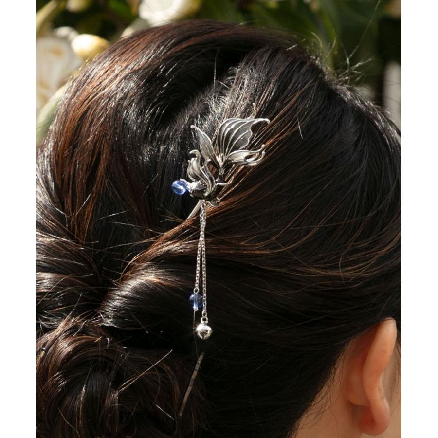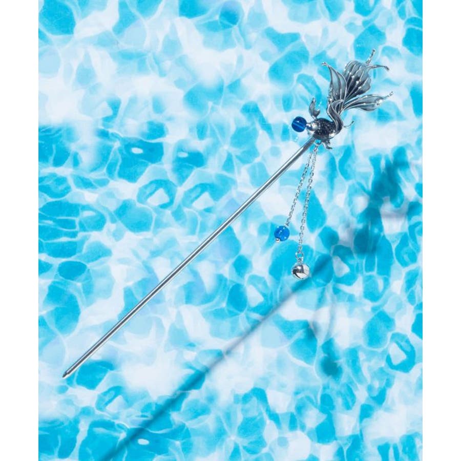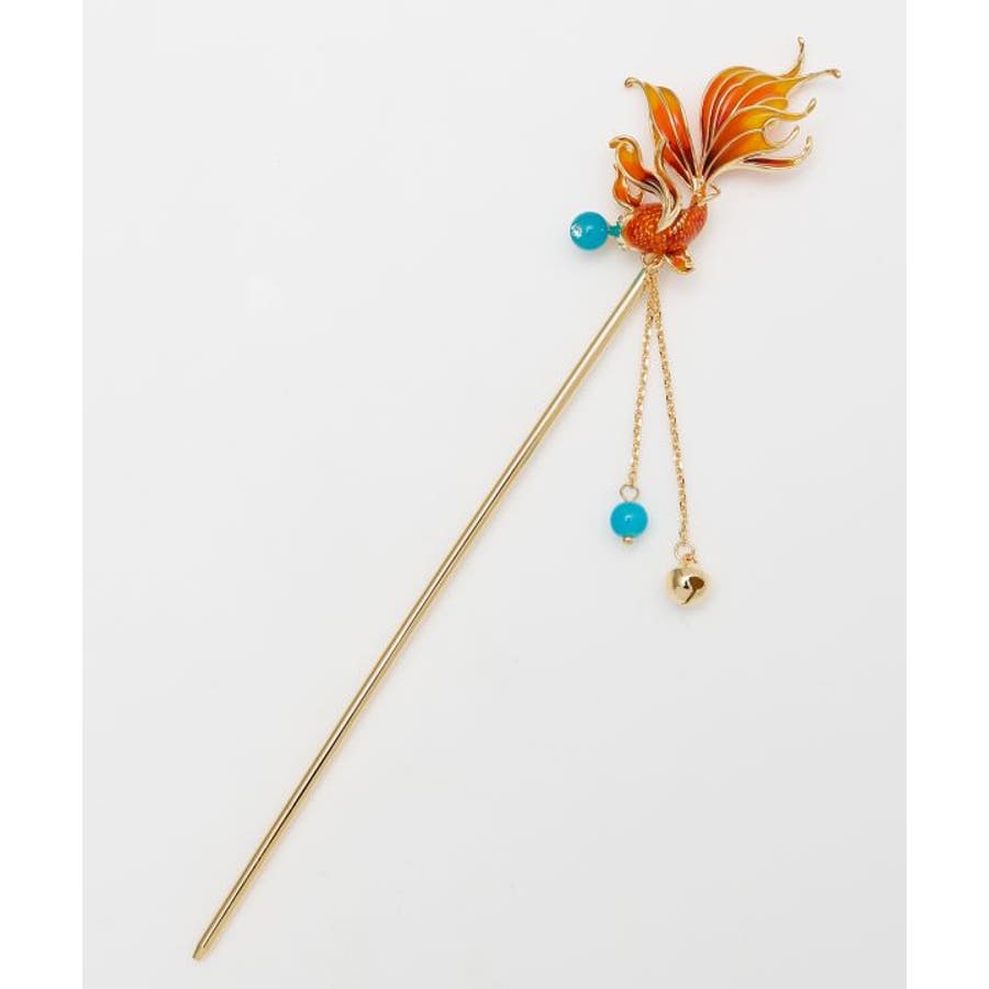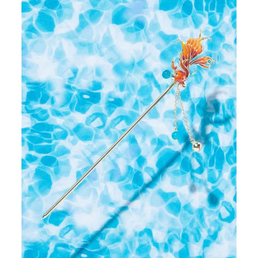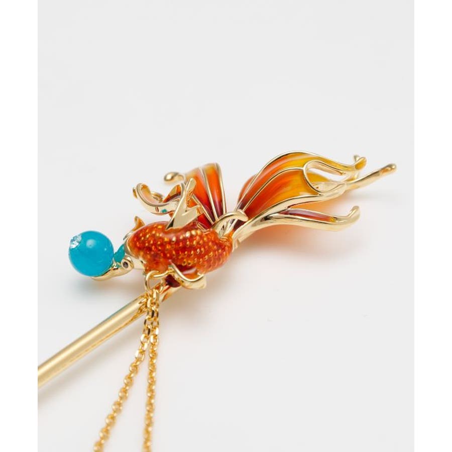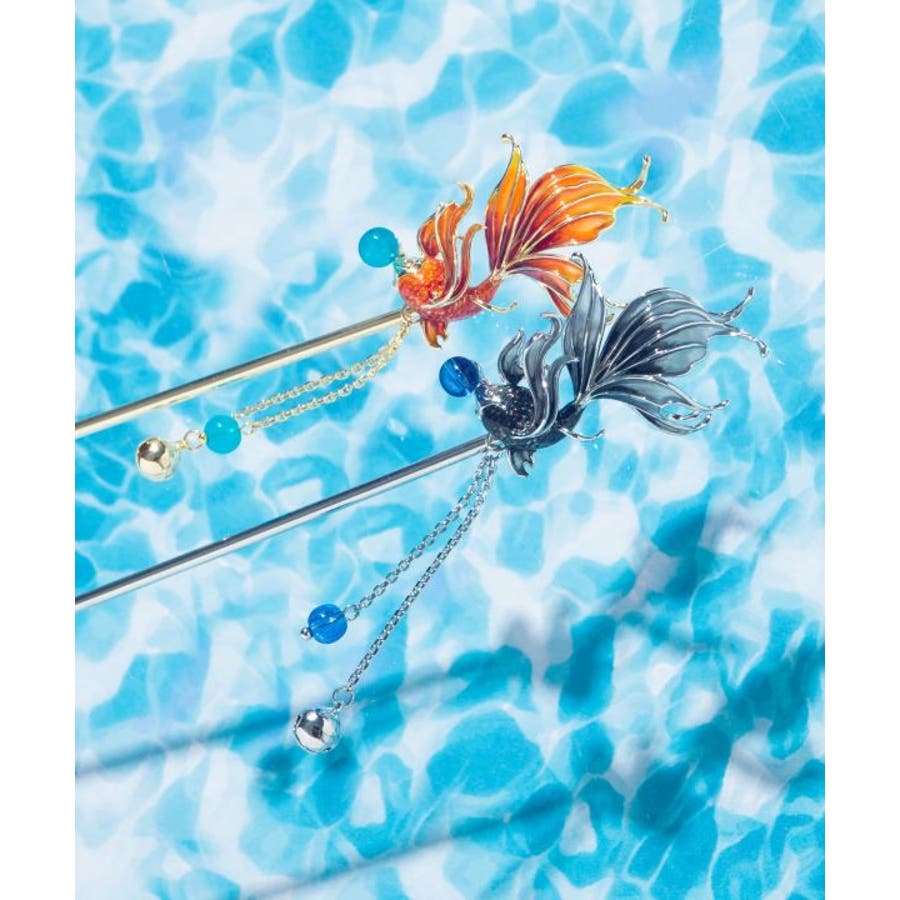 水中を生き生きと泳ぐ金魚を立体的に表現したかんざし。扱いやすい太さの軸で、髪の毛をしっかりとまとめることが出来ます。写実的で躍動感溢れる金魚がコーディネートのアクセントに。
