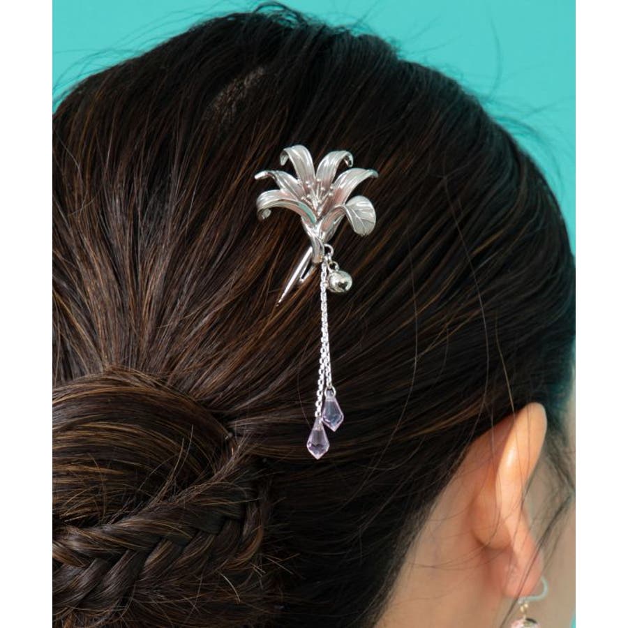 百合の花が開花する様を表現したかんざし。扱いやすい太さの軸で、髪の毛をしっかりとまとめることが出来ます。きらりと光るカットビーズがアクセント。グラデーションカラーの樹脂素材を使用し、上品な印象に仕上げました。