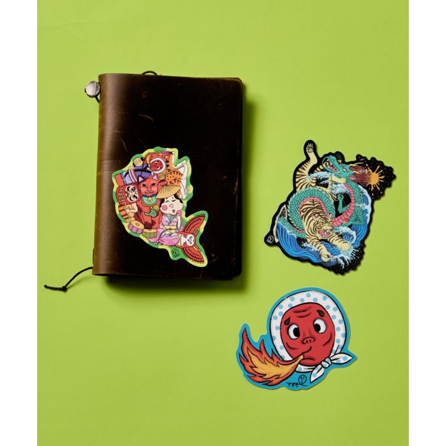 【倭物やカヤ×鈴木ひょっとこ】伝統×現代の融合を魅力的に描く、画家・鈴木ひょっとことのコラボ商品。オリジナル柄「龍虎」がステッカーに。龍と虎がせめぎ合う迫力の構図が印象的で、伝統的な和の力強さを感じさせます。耐久性に優れた特殊素材を使用しており、キャリーバッグなどにも安心して貼れるステッカーです。