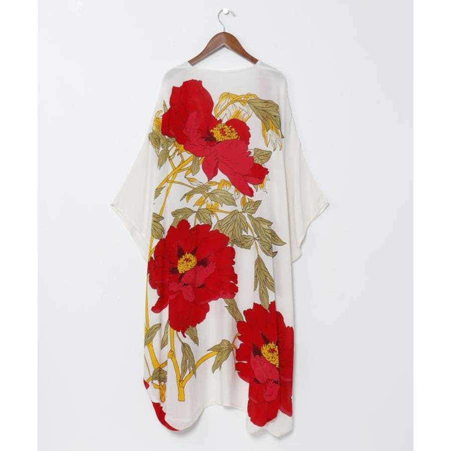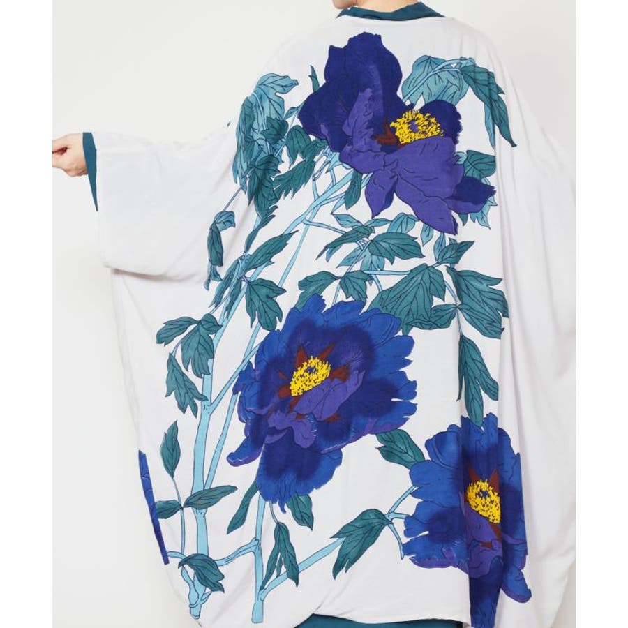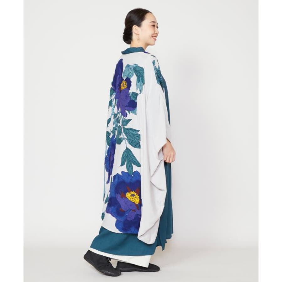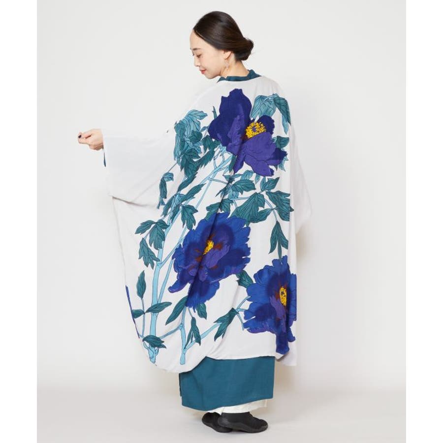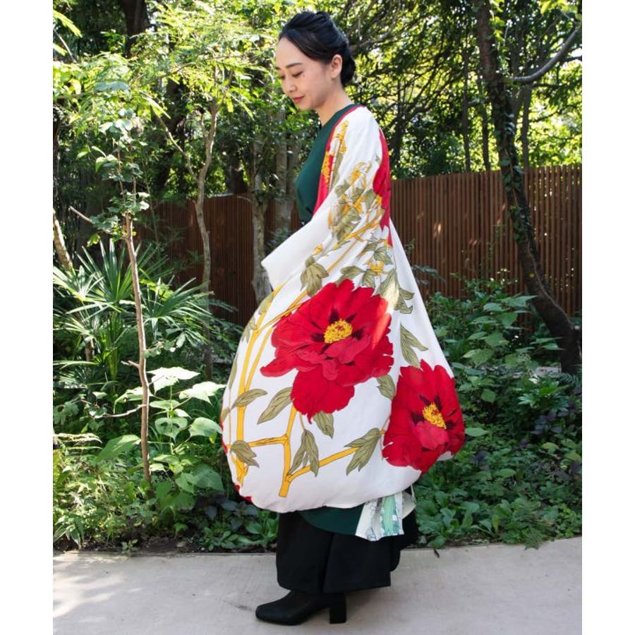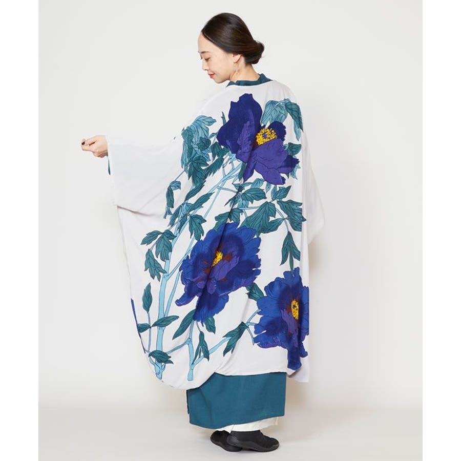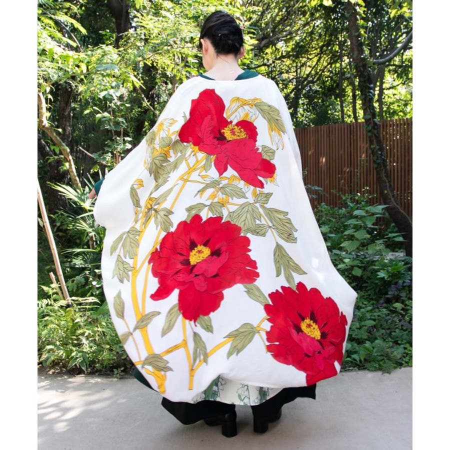 大きく牡丹が描かれている華やかな振袖風羽織。レーヨン素材で軽やかでやわらかな着心地。UVカット加工が施されており、日差しよけに最適。