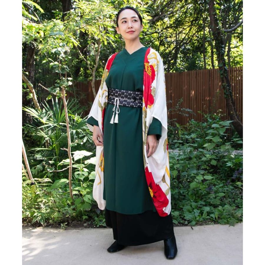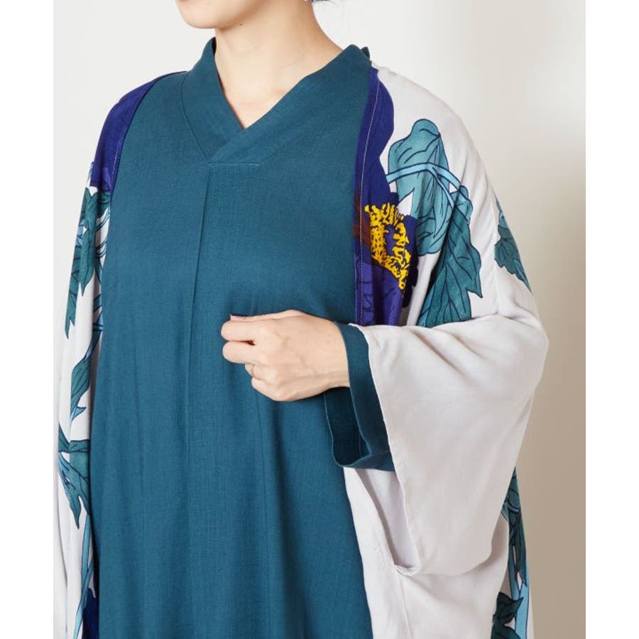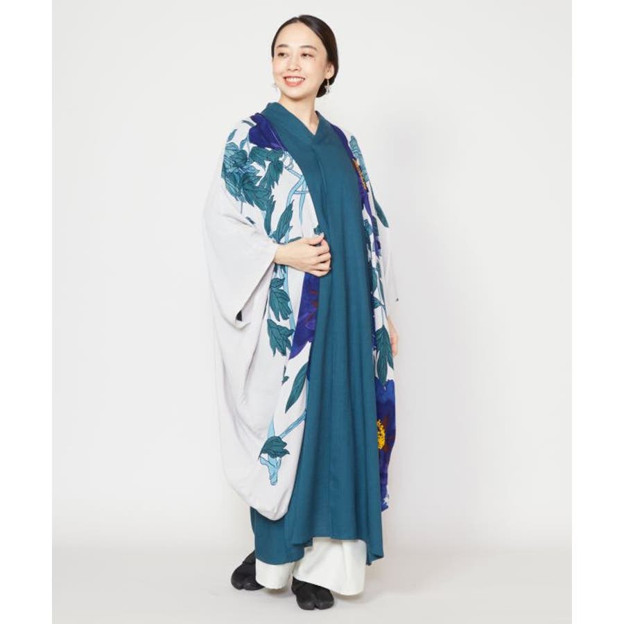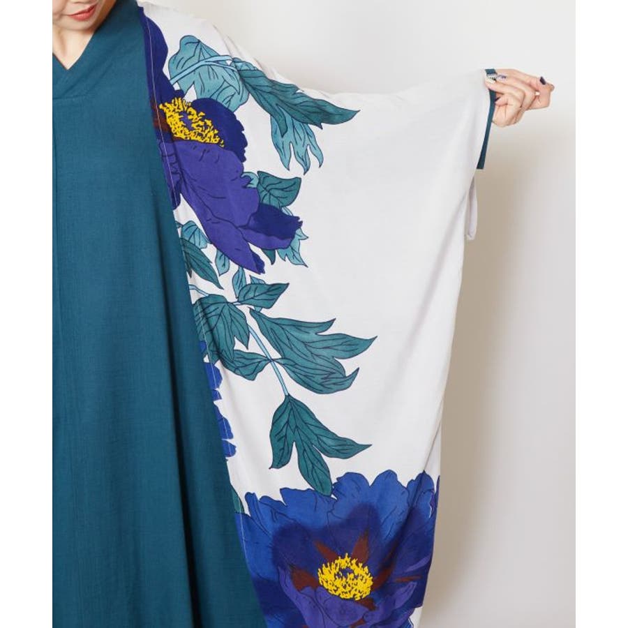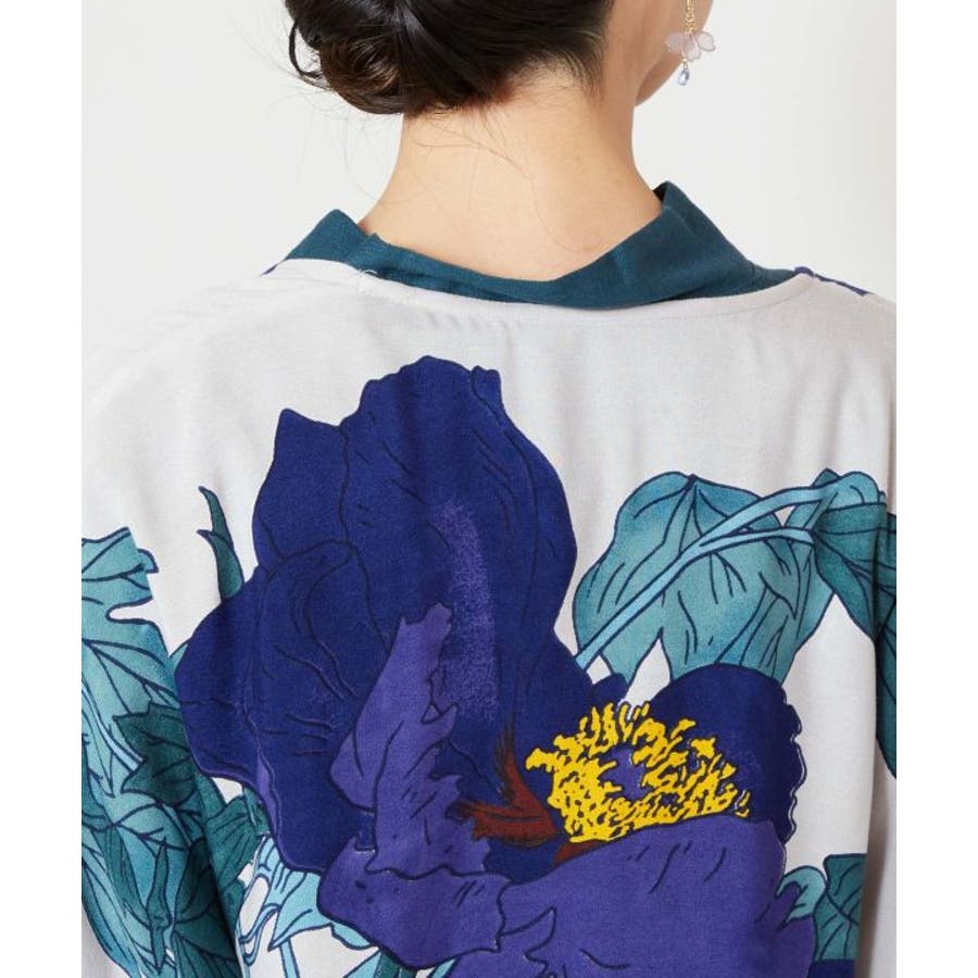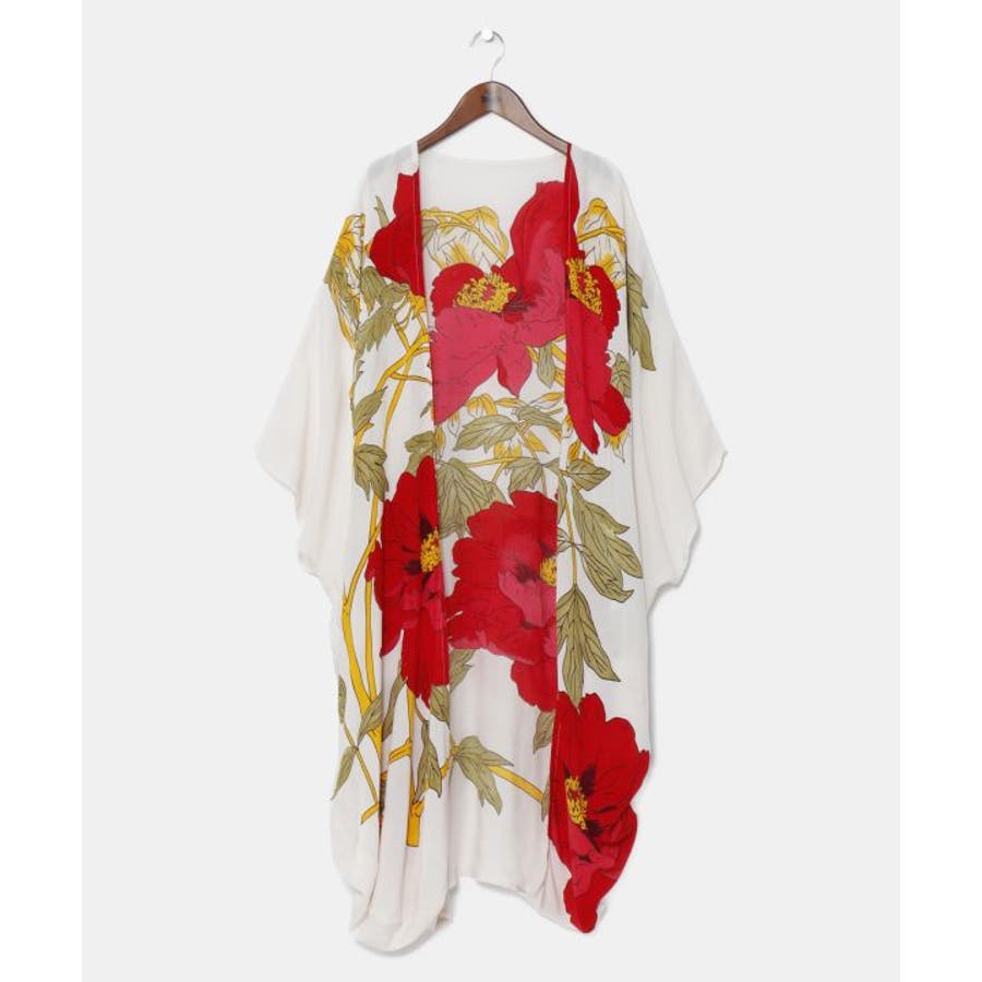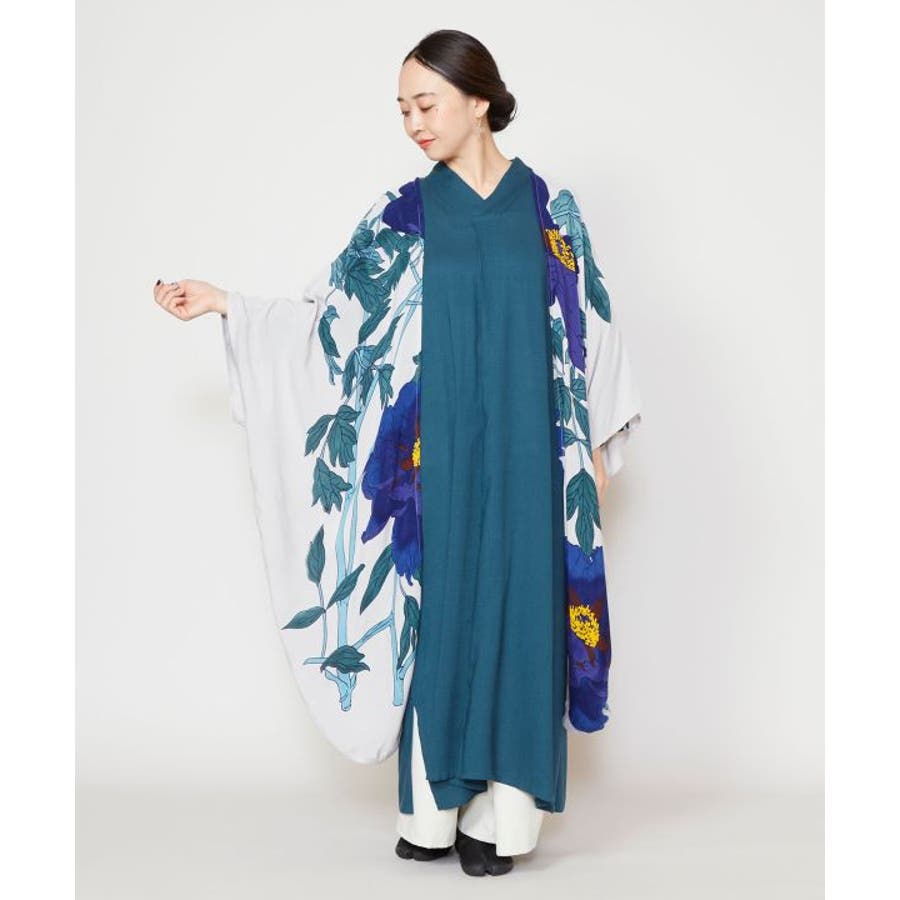 大きく牡丹が描かれている華やかな振袖風羽織。レーヨン素材で軽やかでやわらかな着心地。UVカット加工が施されており、日差しよけに最適。
