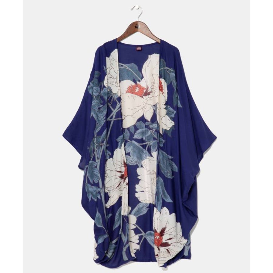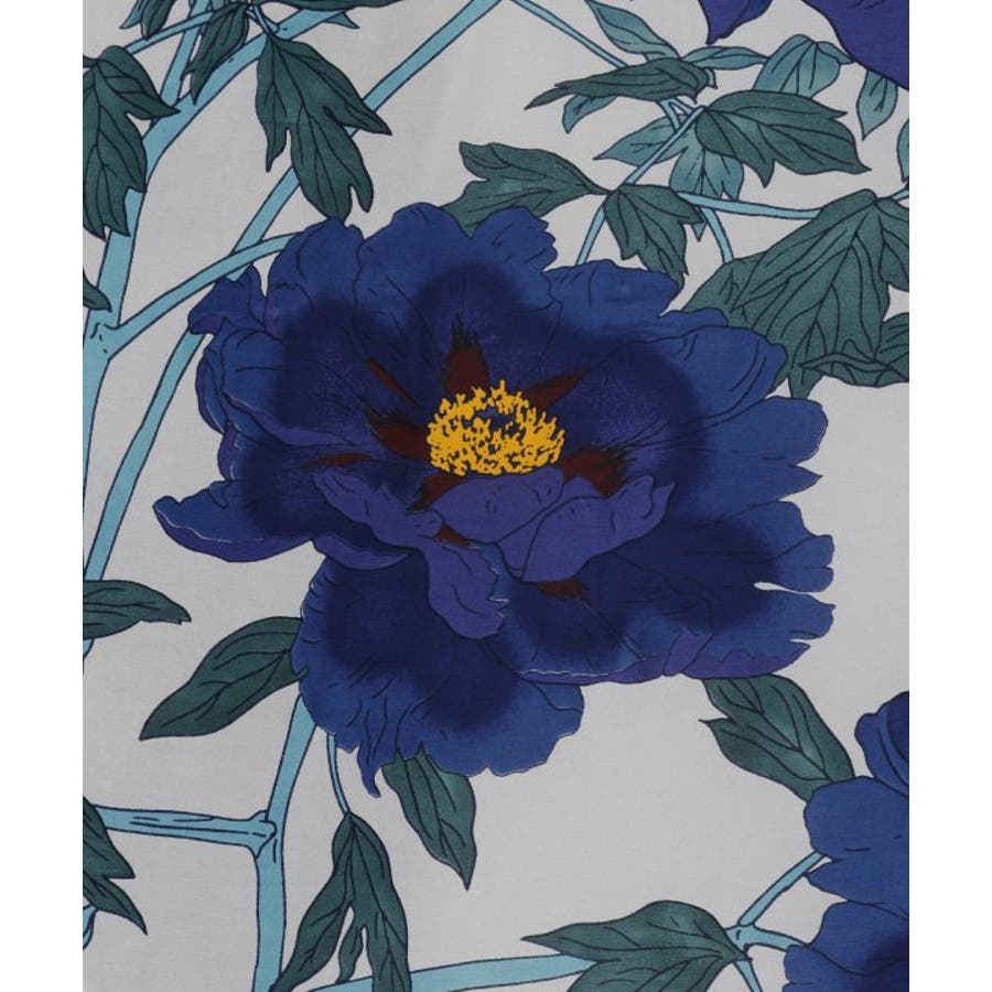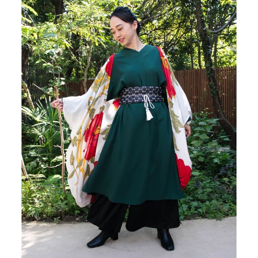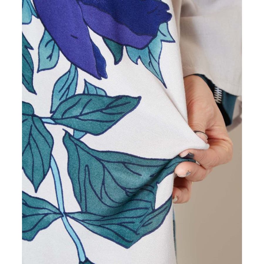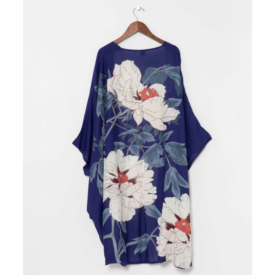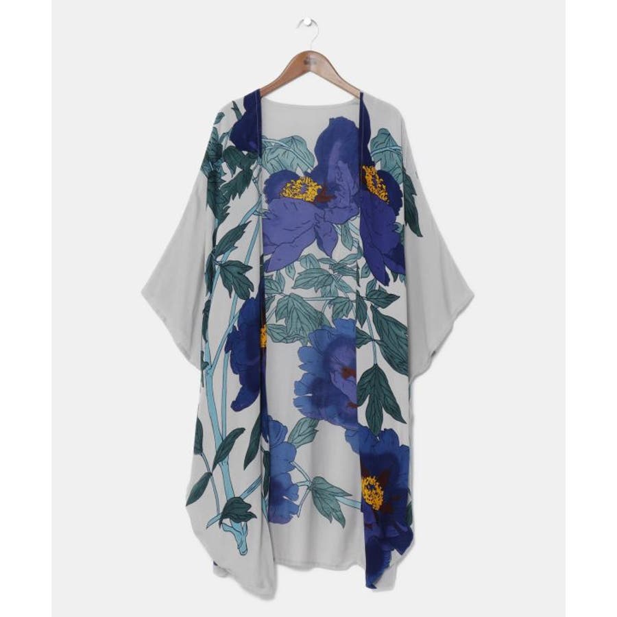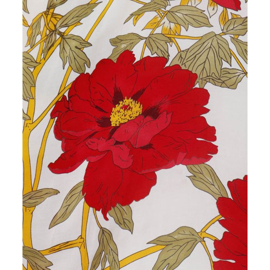 大きく牡丹が描かれている華やかな振袖風羽織。レーヨン素材で軽やかでやわらかな着心地。UVカット加工が施されており、日差しよけに最適。