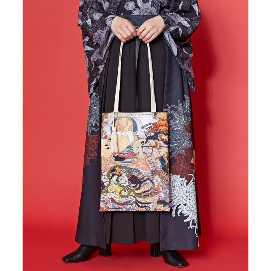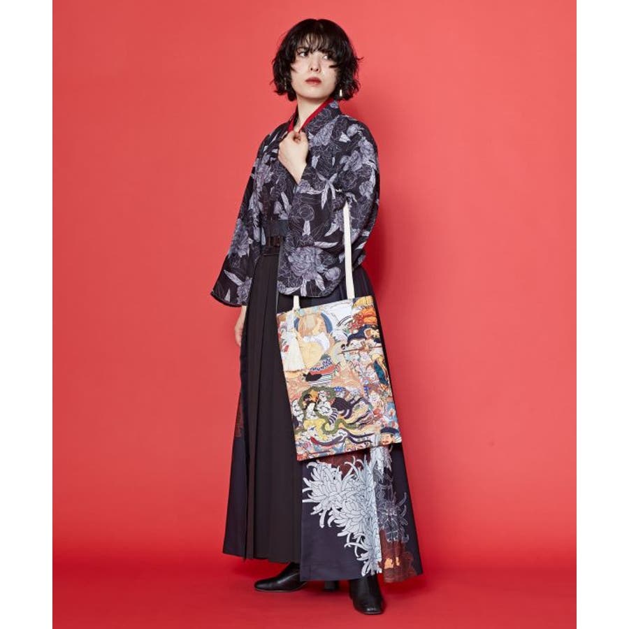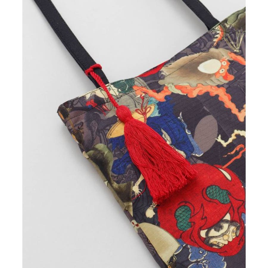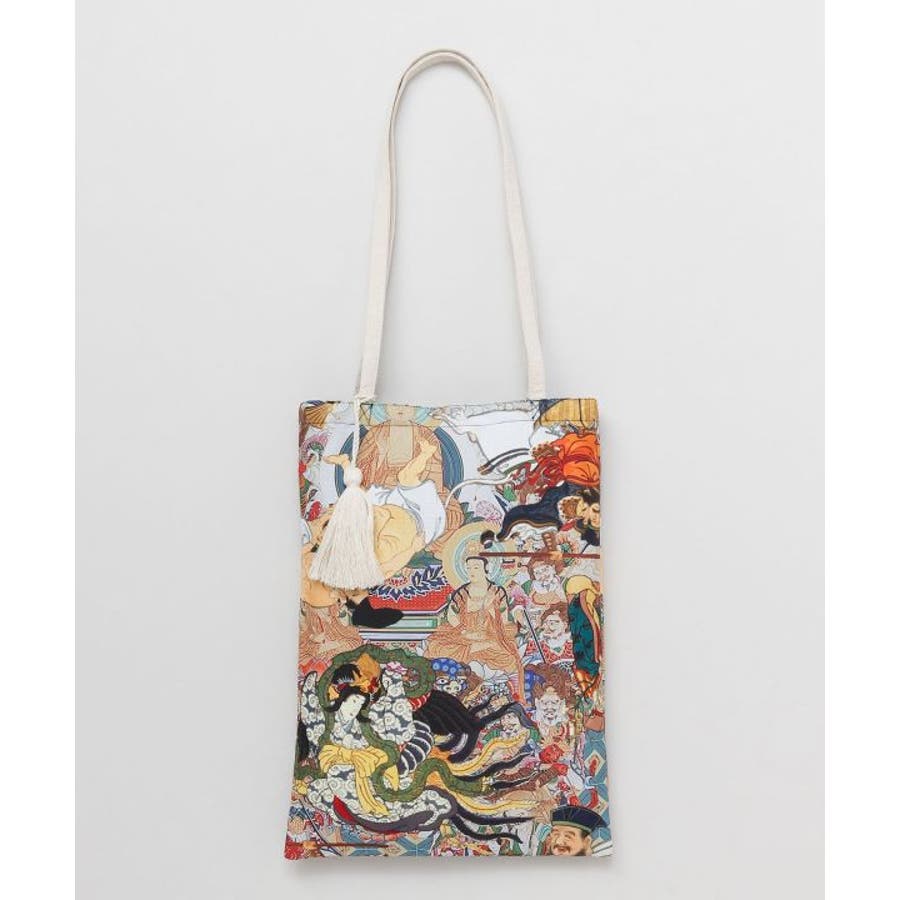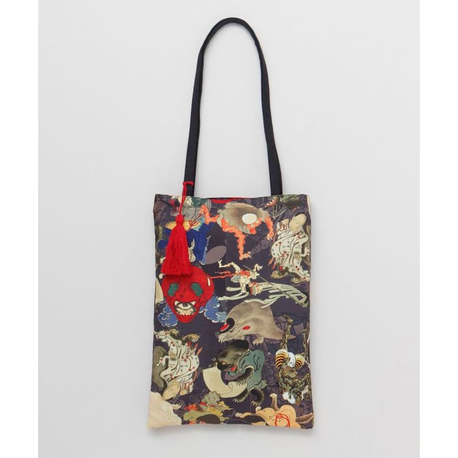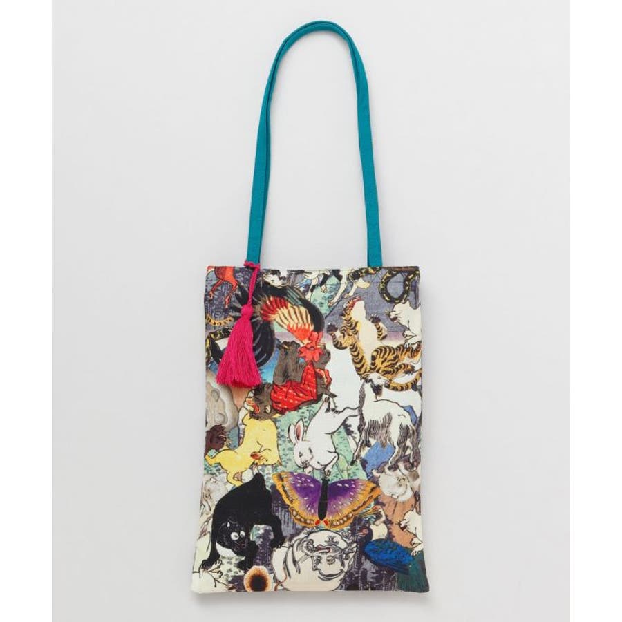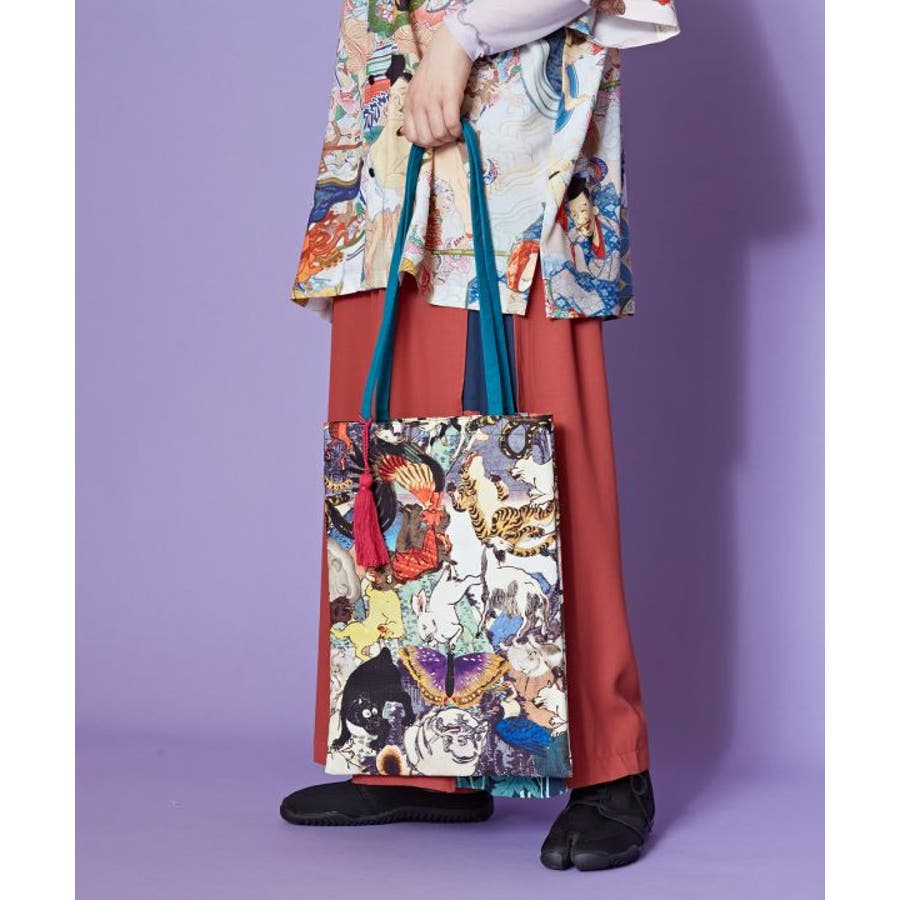 平たい形のトートバッグ。A4サイズもすっぽり入る大きめのサイズです。日本の様々な浮世絵をコラージュデザインしたカヤならではのオリジナル柄。長めの持ち手で、肩掛けも楽に出来ます。フラットなシルエットながらも収納力は抜群。内ポケット付き。
