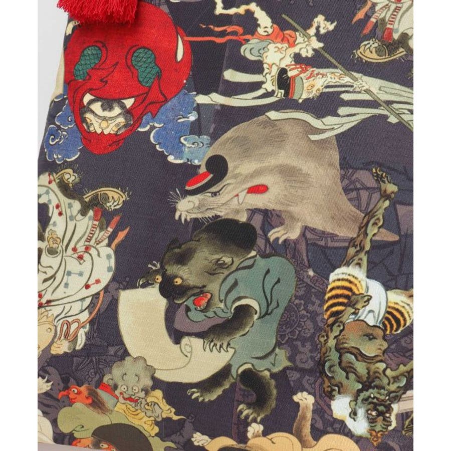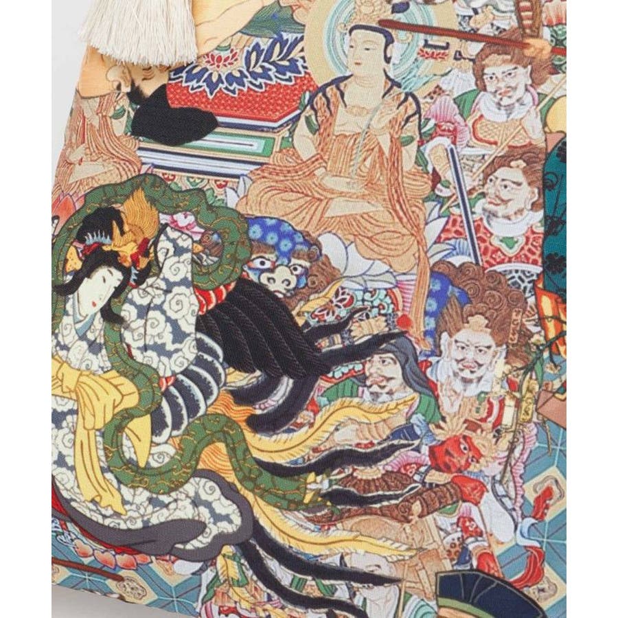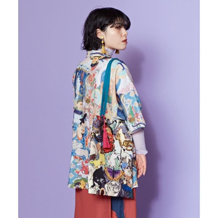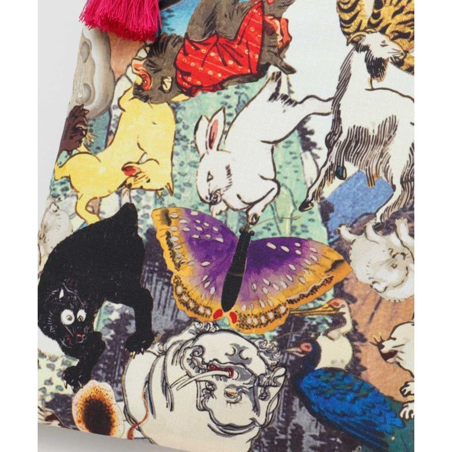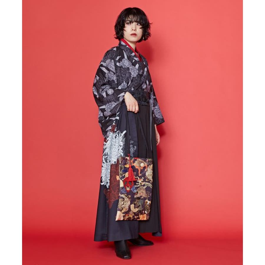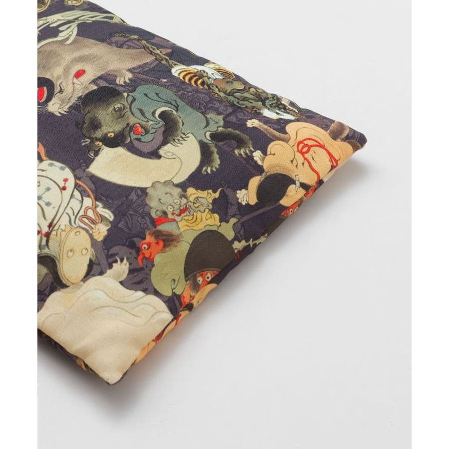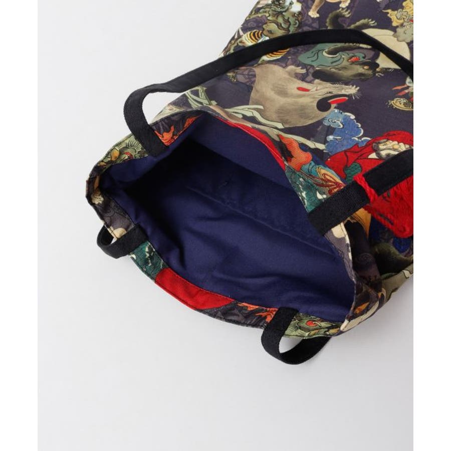 平たい形のトートバッグ。A4サイズもすっぽり入る大きめのサイズです。日本の様々な浮世絵をコラージュデザインしたカヤならではのオリジナル柄。長めの持ち手で、肩掛けも楽に出来ます。フラットなシルエットながらも収納力は抜群。内ポケット付き。
