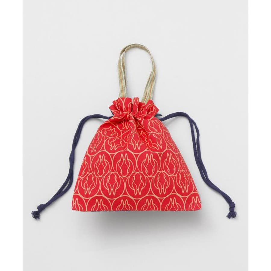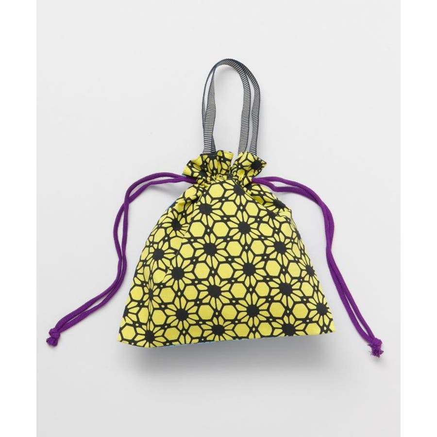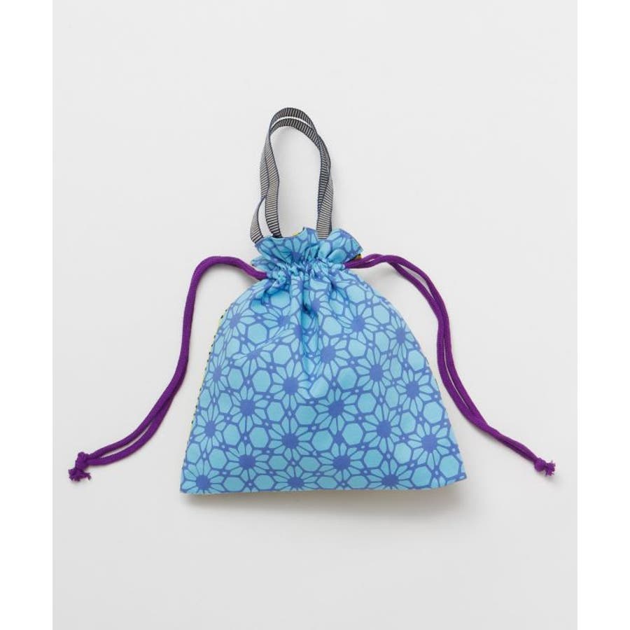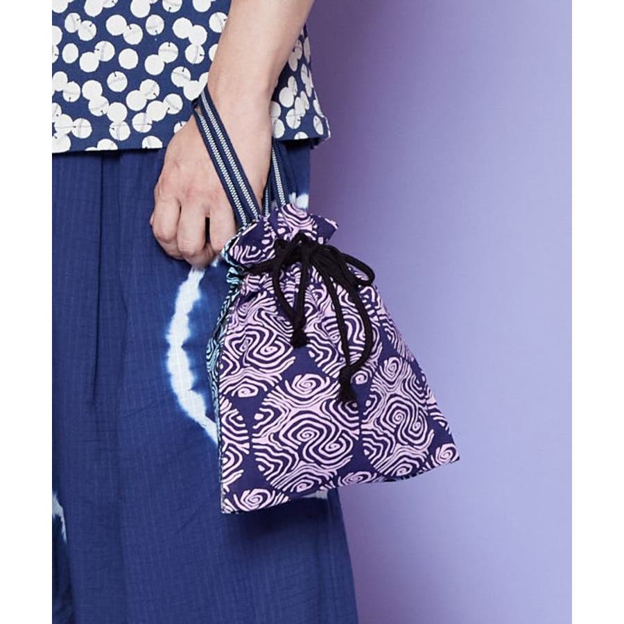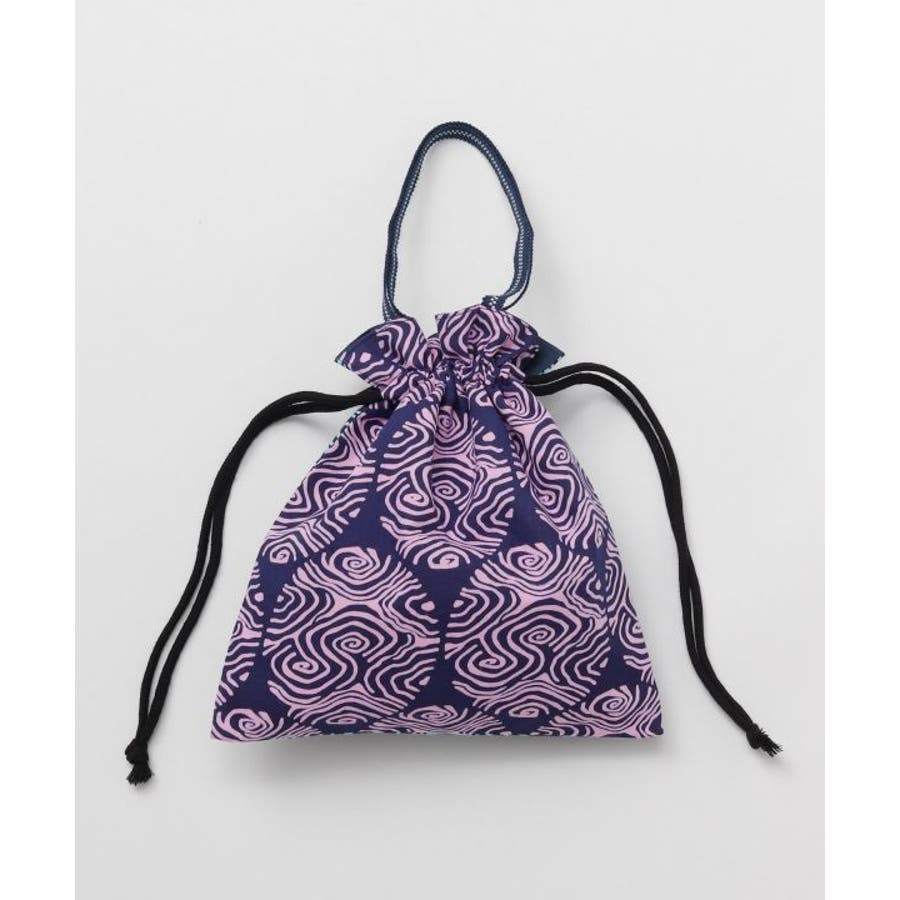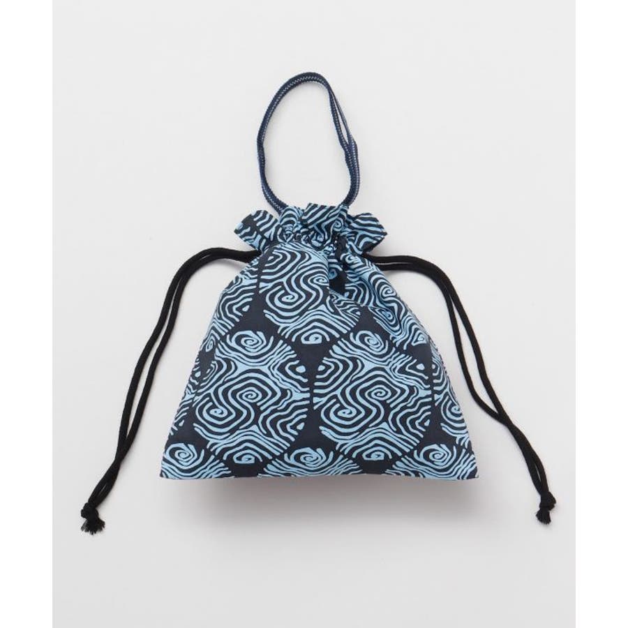 日本の伝統的な技法で染めた「注染手拭」を使用した巾着バッグ。持ち手部分には真田紐、柄は北斎模様より抜粋。オールジャパンメイドの、こだわりが詰まったアイテムです。