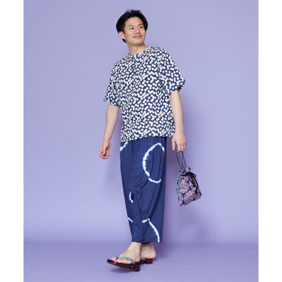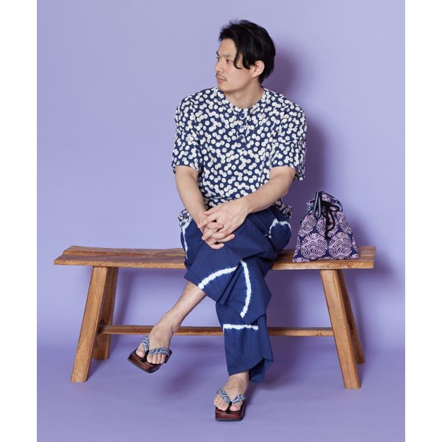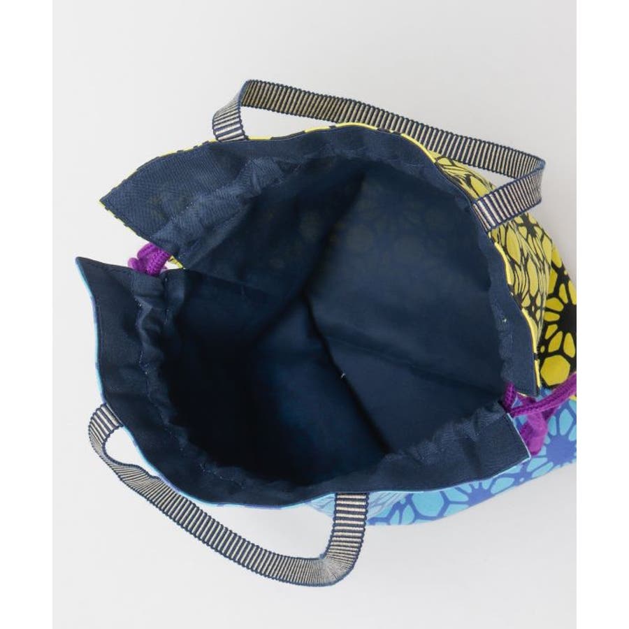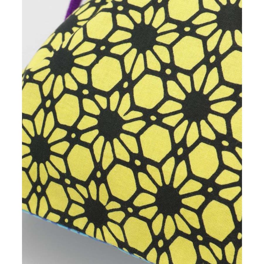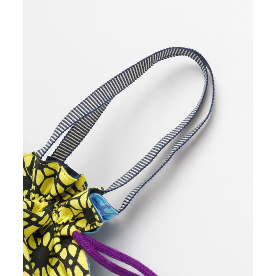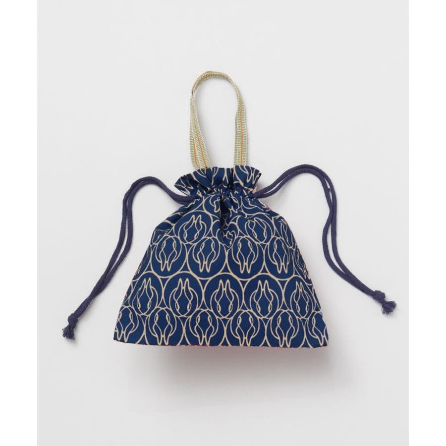 日本の伝統的な技法で染めた「注染手拭」を使用した巾着バッグ。持ち手部分には真田紐、柄は北斎模様より抜粋。オールジャパンメイドの、こだわりが詰まったアイテムです。