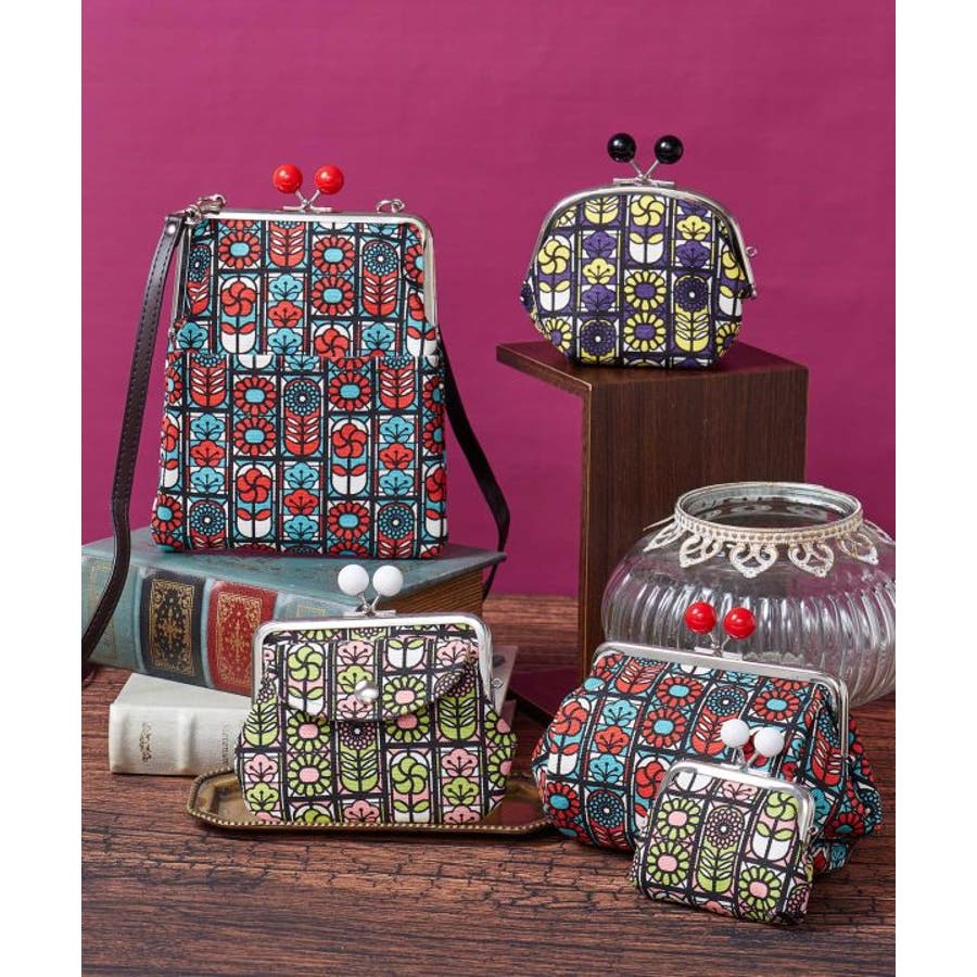 ステンドガラス風のレトロモダンな玉付きがま口。中に小さい口金が付いた親子タイプ。小銭とお札を別けて入れられる便利なお財布です。