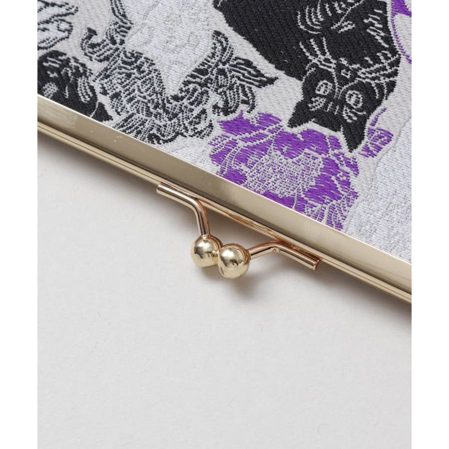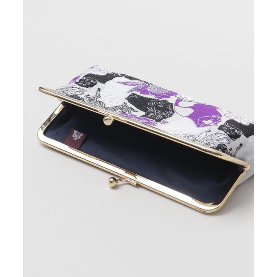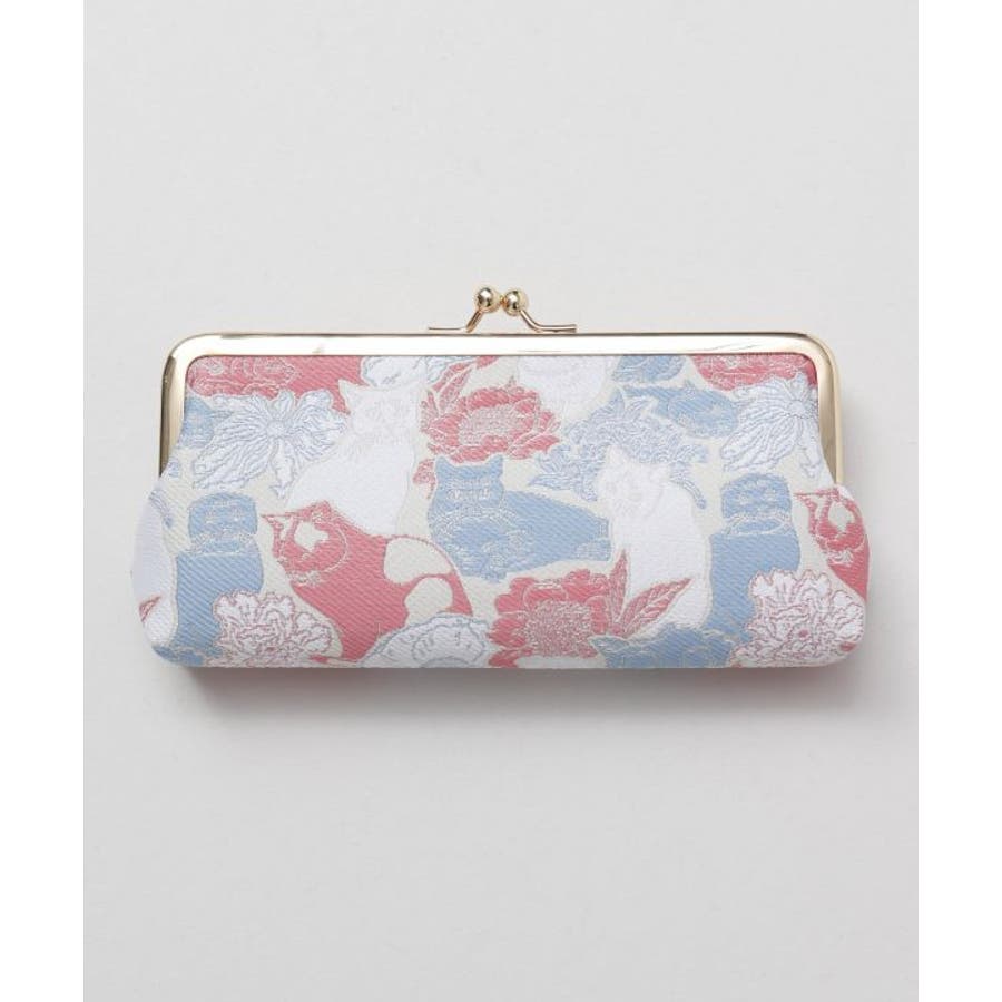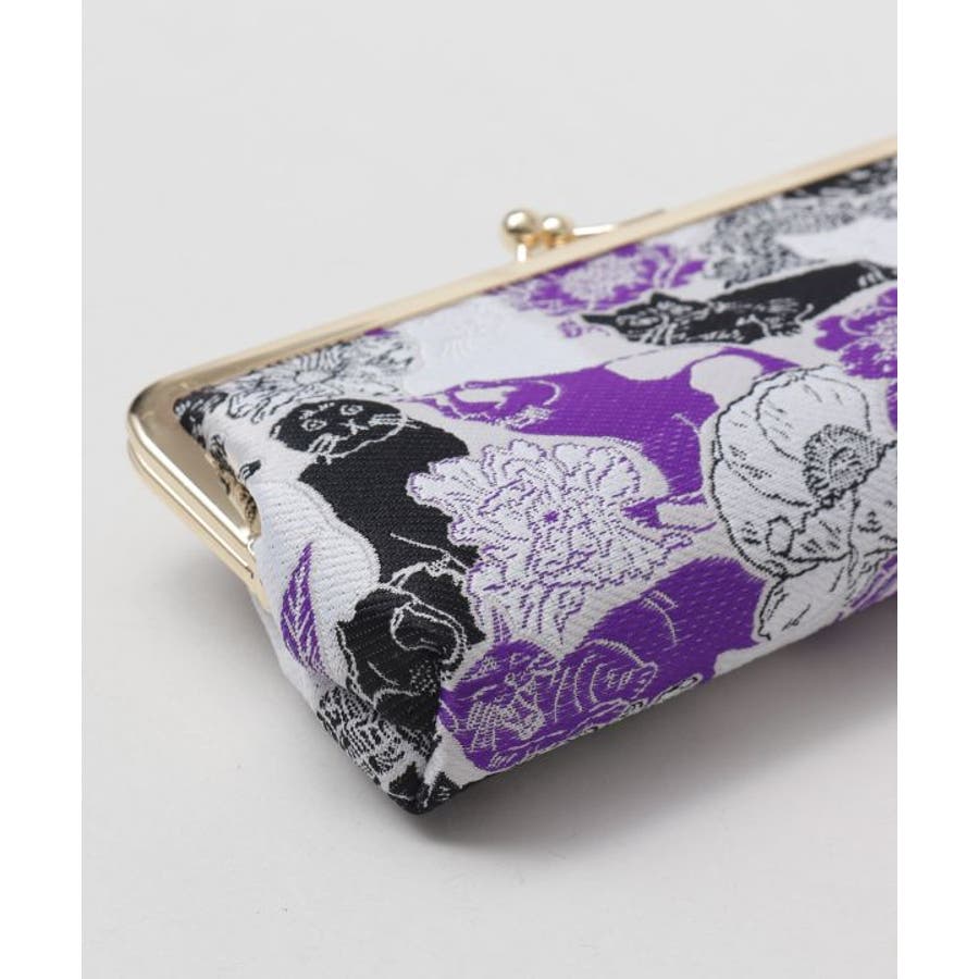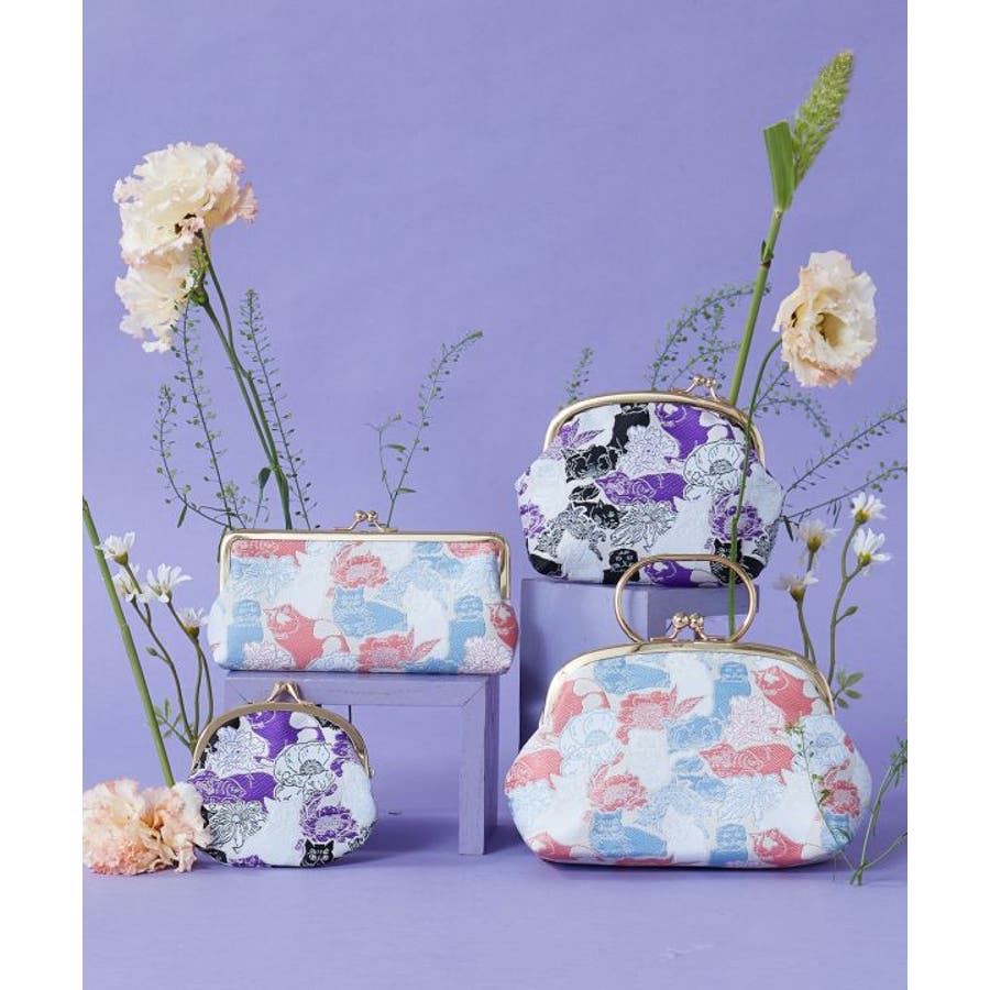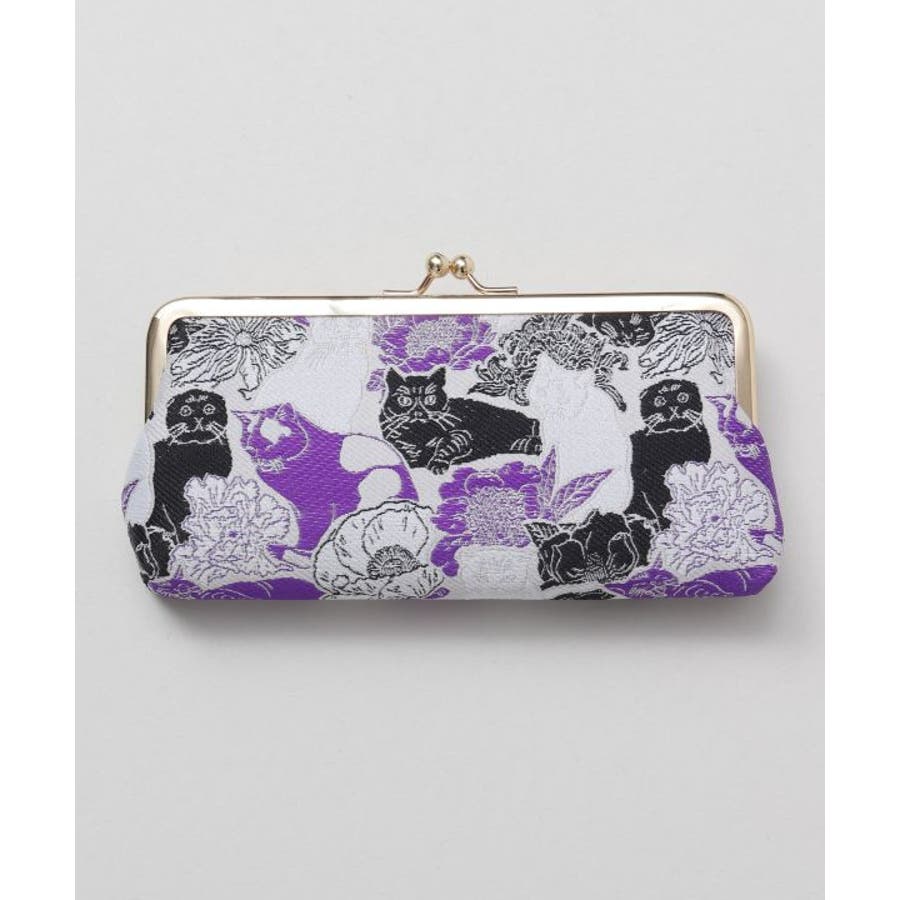 眼鏡や筆記用具を入れられるがま口。可愛らしい猫たちと花々が描かれたデザイン。優しい色合いの桃と大人な色合いの紫が上品でモダンな印象。