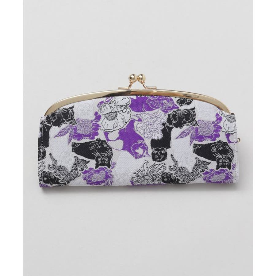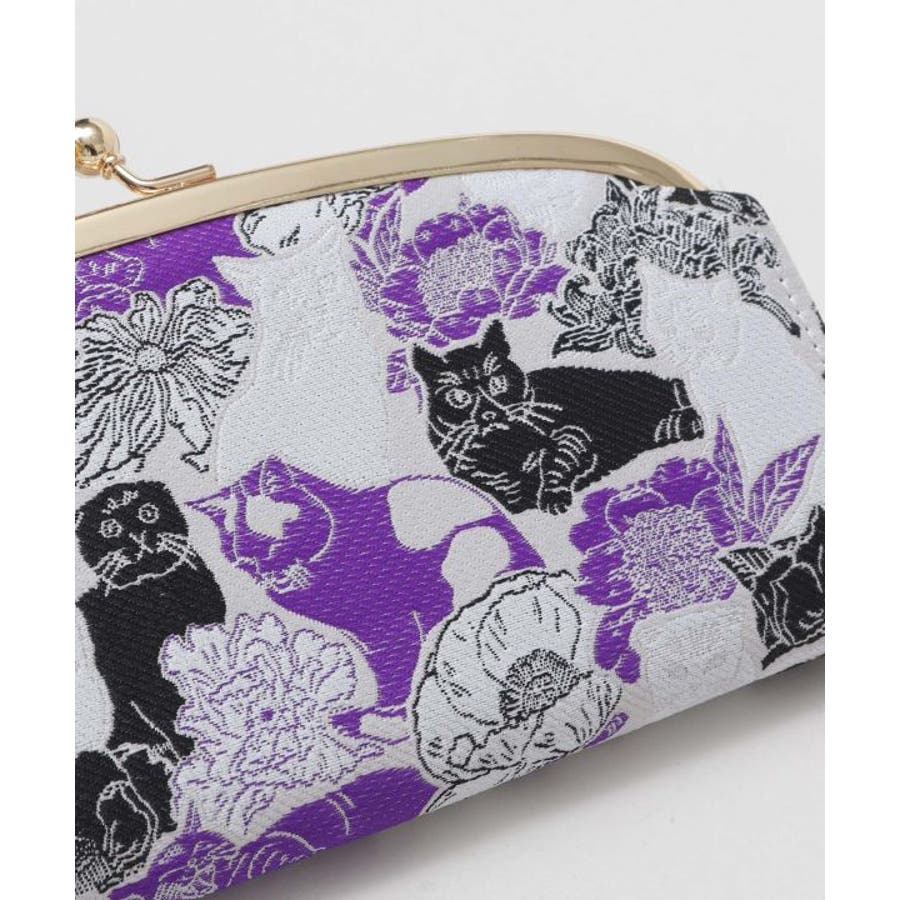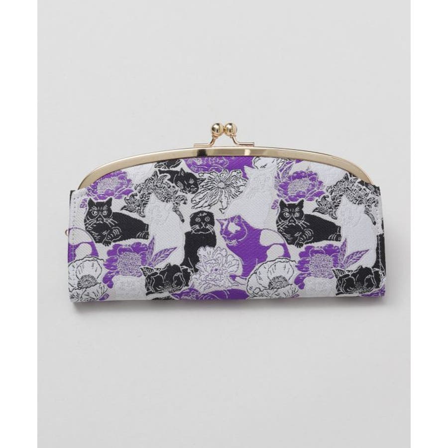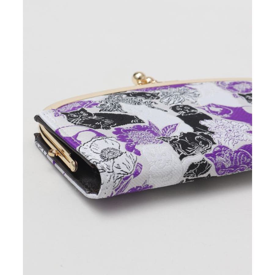 お札を折らずに入れられる長財布。カードの収納も豊富。可愛らしい猫たちと花々が描かれたデザイン。優しい色合いの桃と大人な色合いの紫が上品でモダンな印象。
