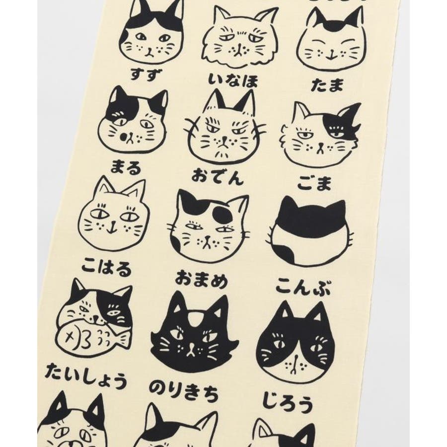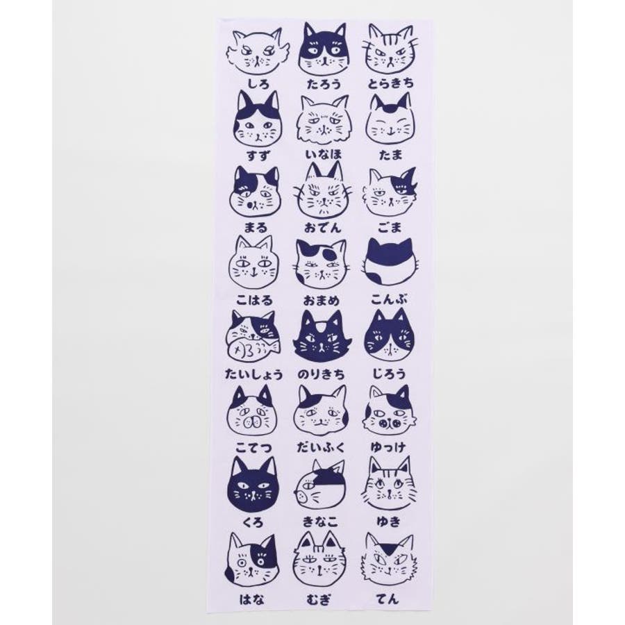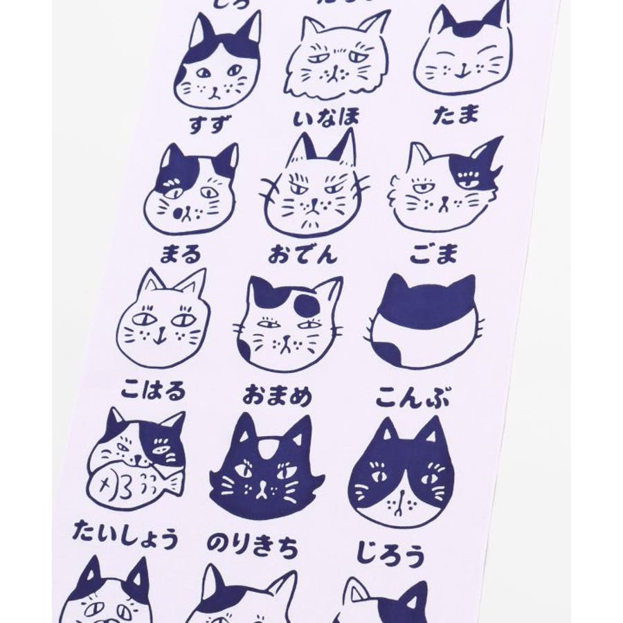 沢山の猫が描かれた手拭い。お気に入りの一匹を見つけてください。手ぬぐいは速乾性があり、小さくたためるので持ち運びにも便利。家でも外でも重宝できます。