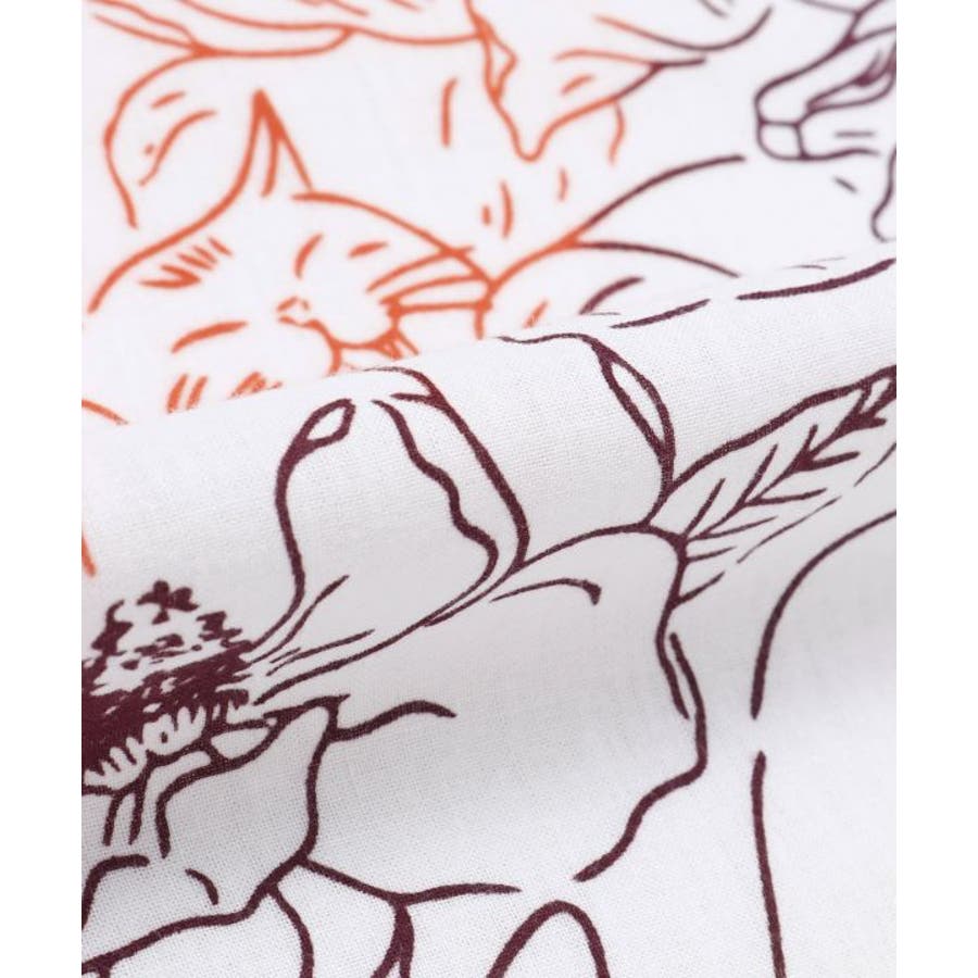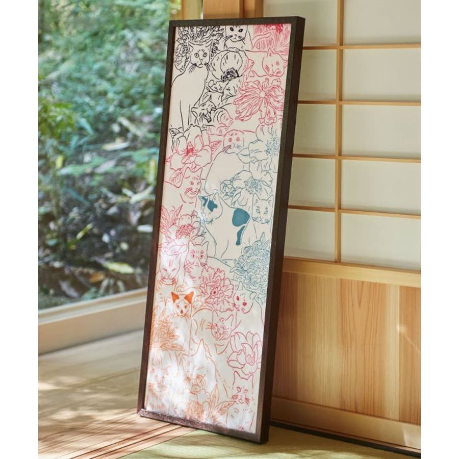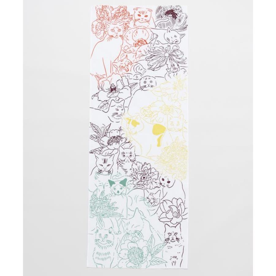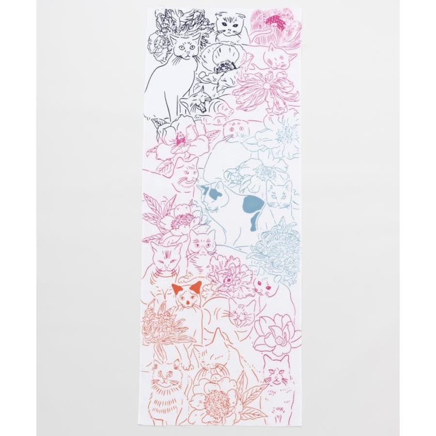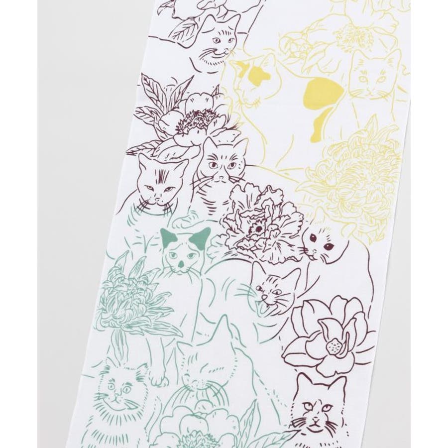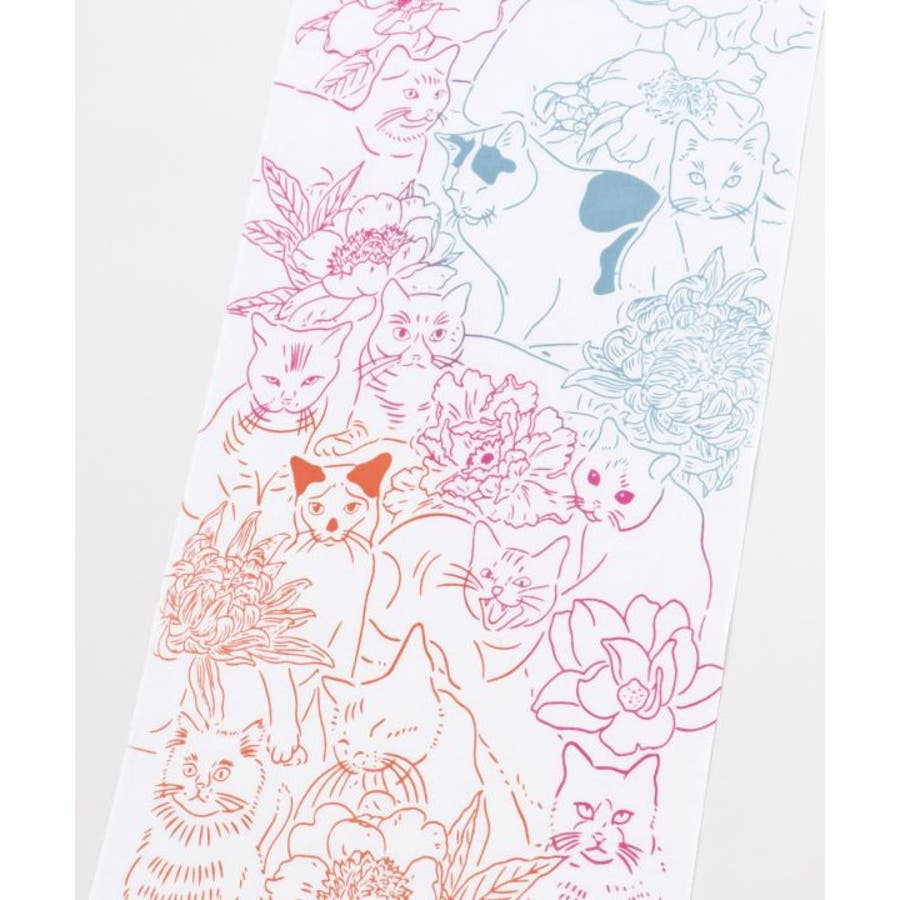 様々な種類の猫と花がちりばめられた手拭い。お部屋のインテリアにもピッタリの一枚。手ぬぐいは速乾性があり、小さくたためるので持ち運びにも便利。家でも外でも重宝できます。
