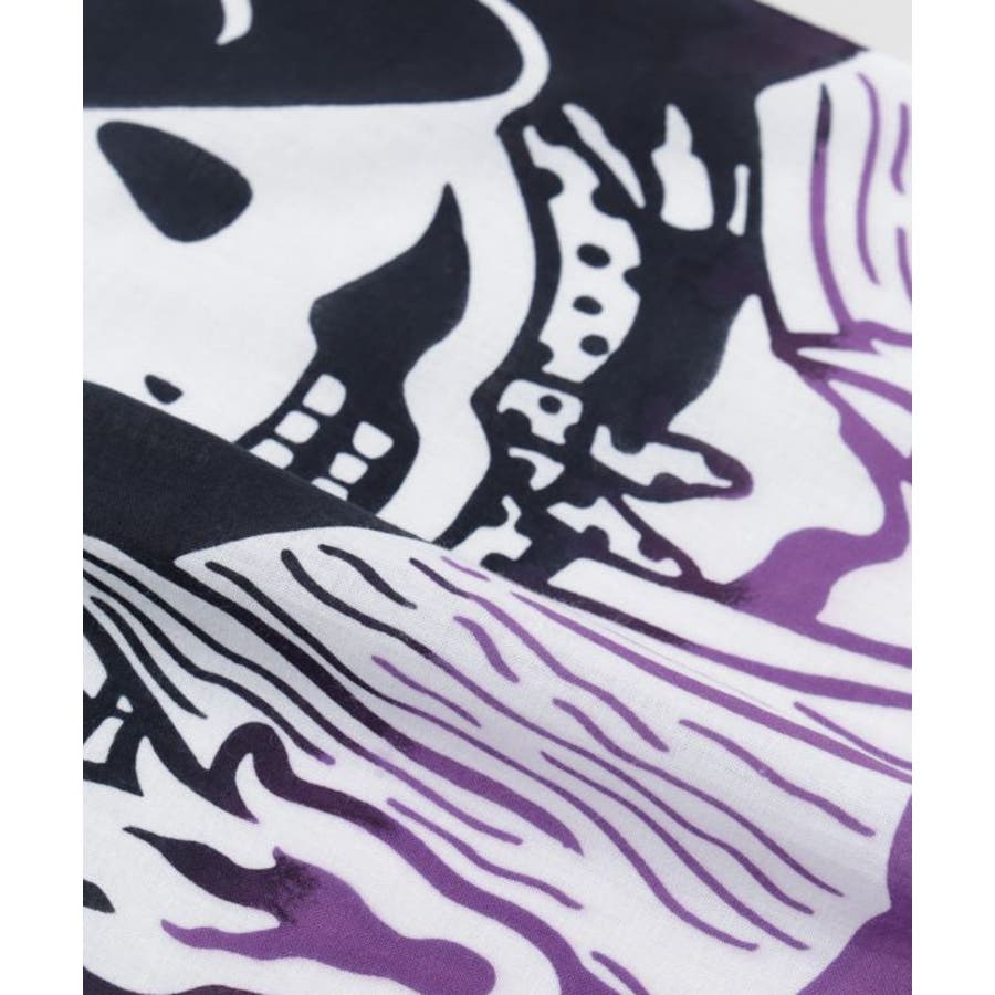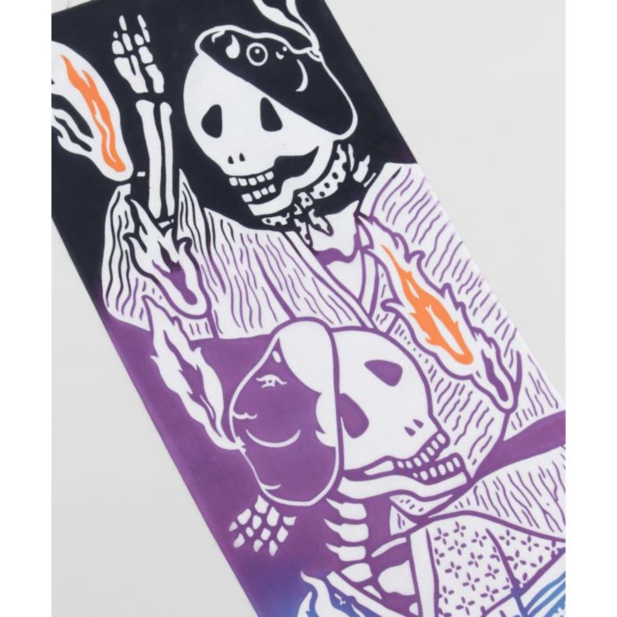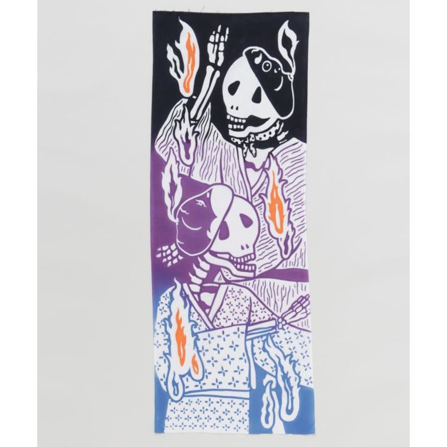 おかめとひょっとこの仮面をかぶった骸骨たちが踊る、ユーモアたっぷりの手拭。グラデーションとゆらめく火の演出が幻想的な雰囲気を醸し出します。飾っても使っても楽しめる個性派アイテムです。