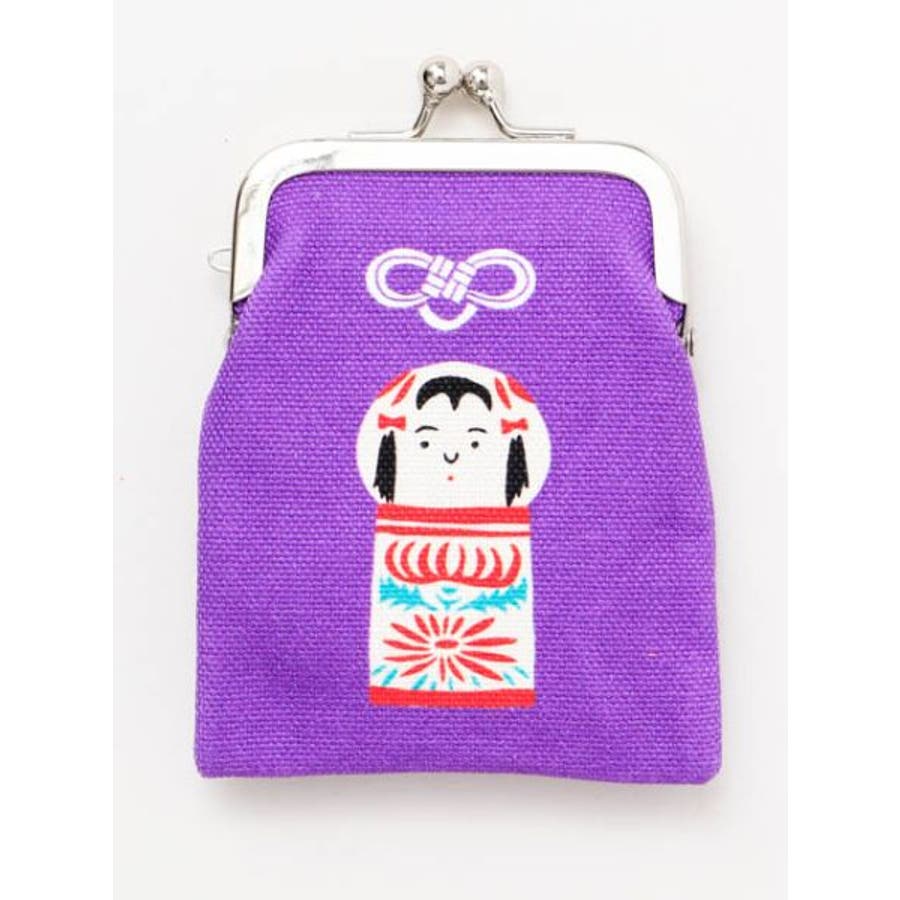 『あなたの持ち物守ります♪』と言わんばかりのお茶目な表情でアナタを見つめる愛らしい民芸品たち。縁起の良い日本の民芸品を、しっかりとした生地感の帆布にプリントした縦長がま口です。