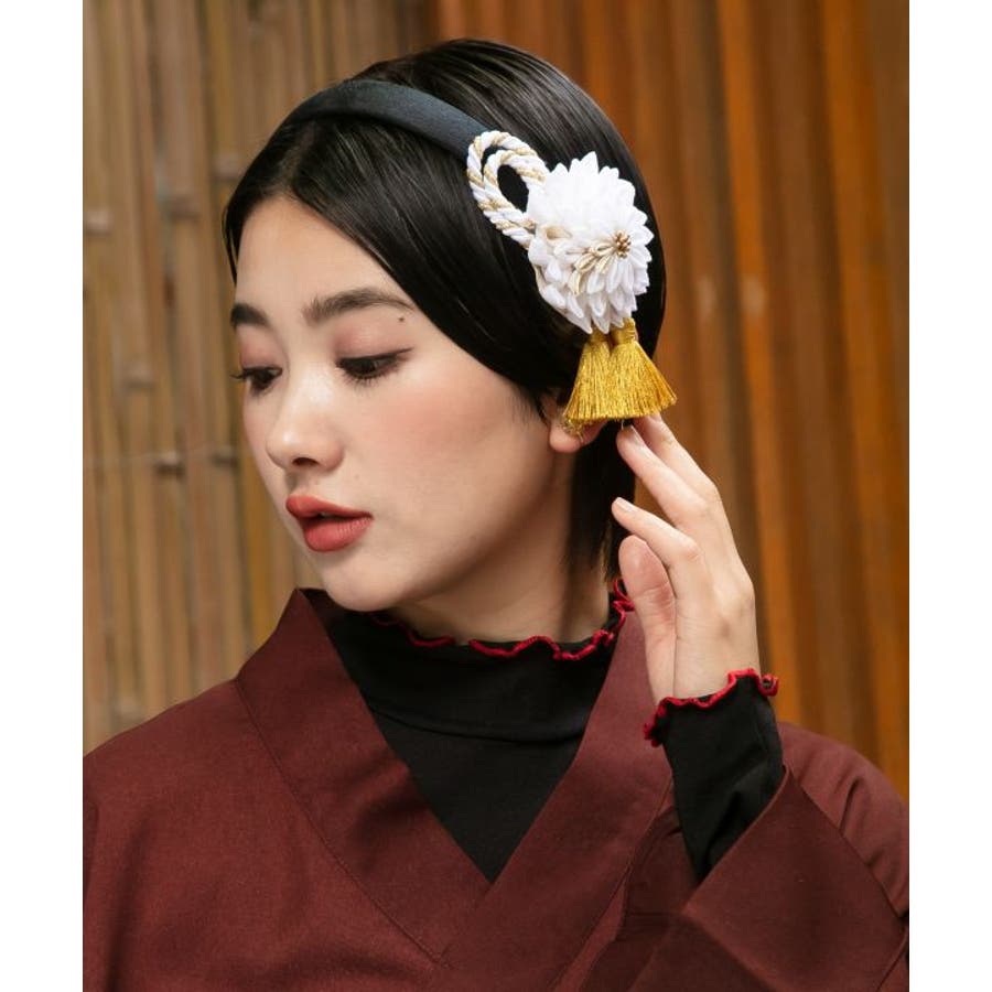 大振りな菊の花をつまみ細工で表現したカチューシャ。煌びやかな結び紐とベロア風素材のカチューシャを組み合わせ、レトロモダンな雰囲気に仕上げました。特別な「ハレの日」はもちろん、普段の装いにも気軽に和の要素を取り入れられるアクセサリー。