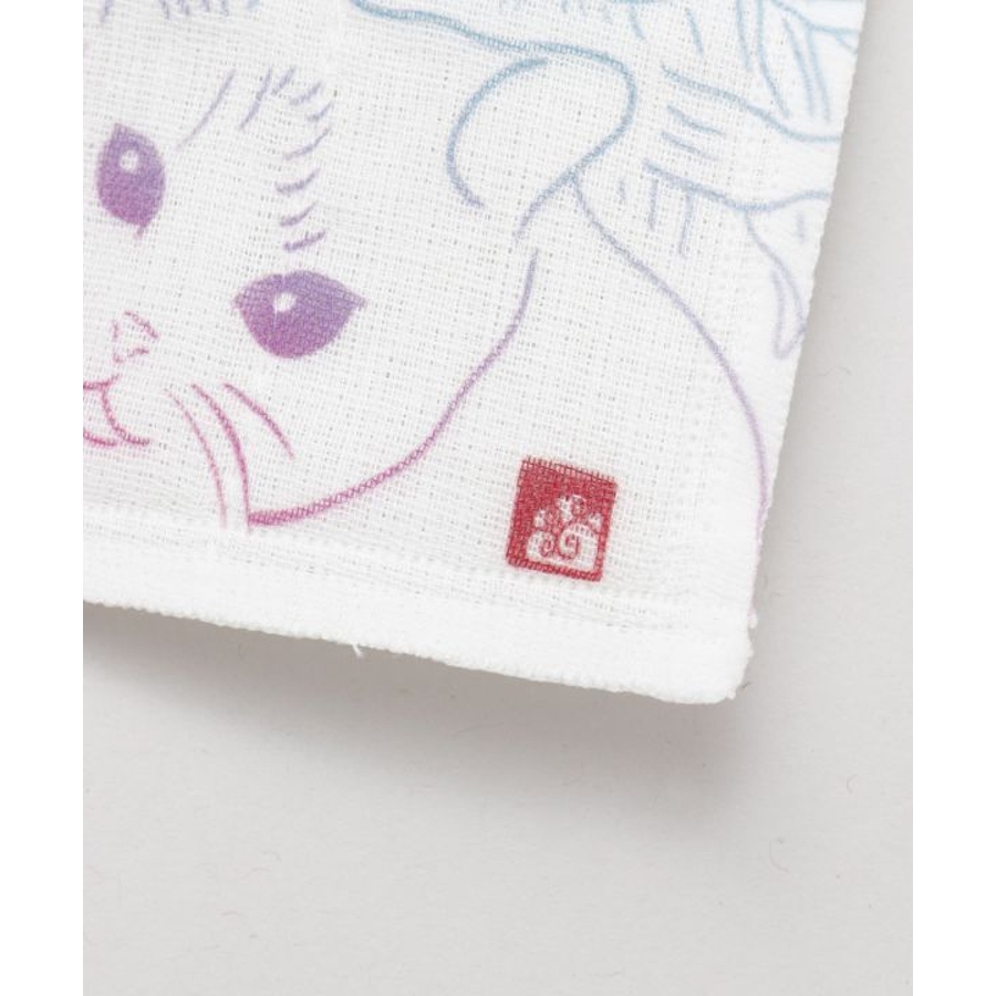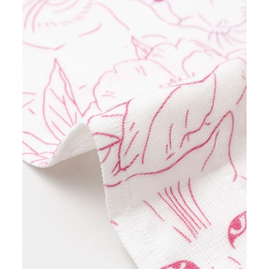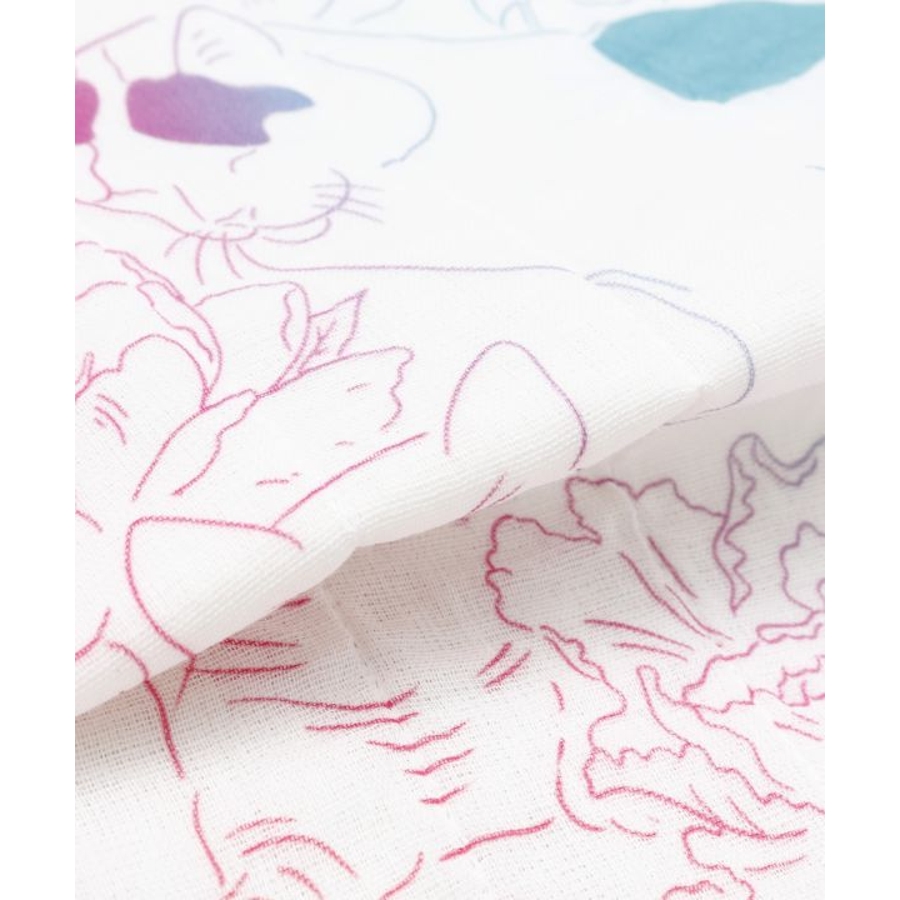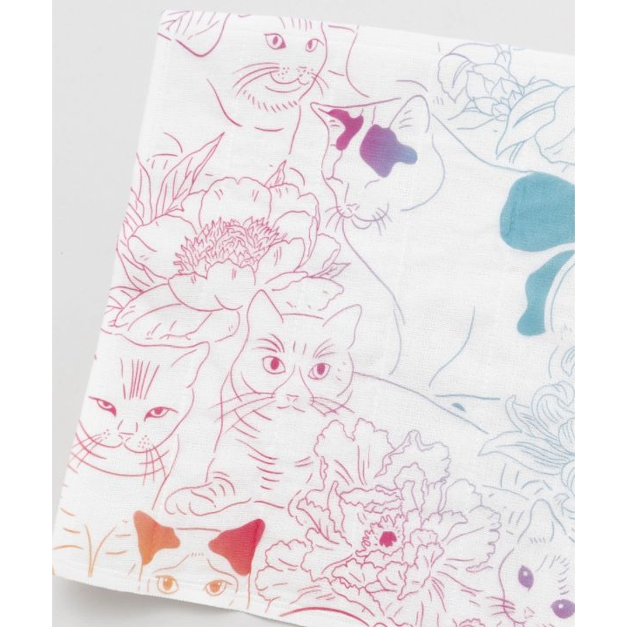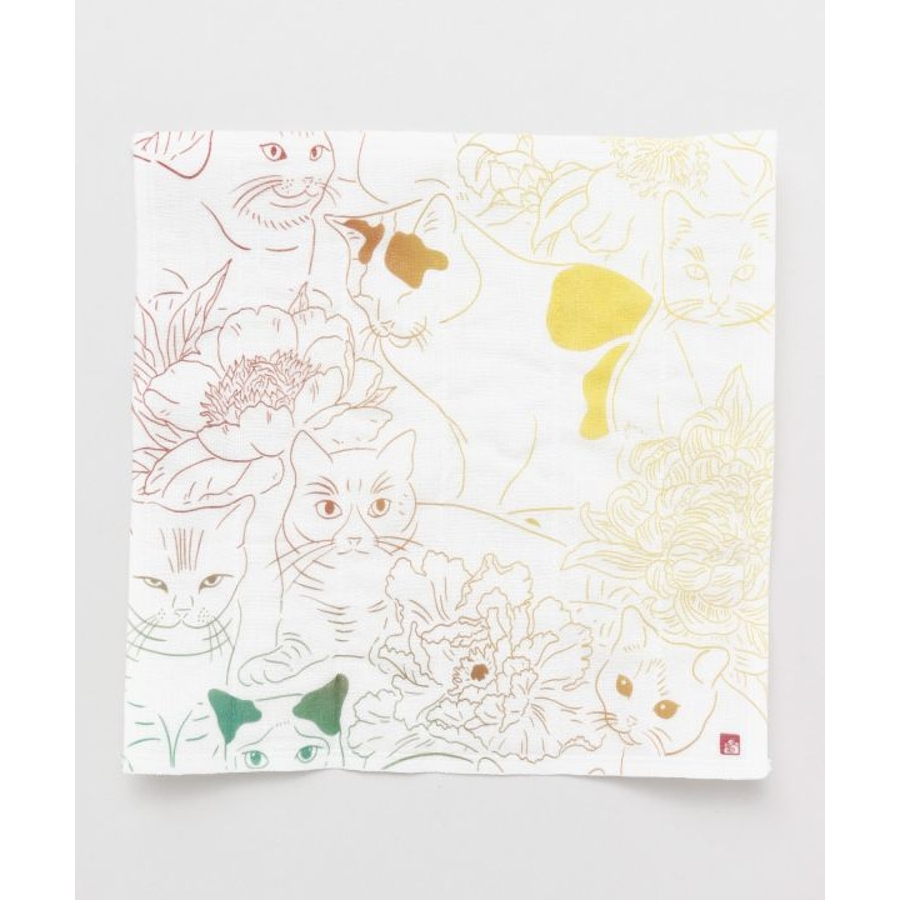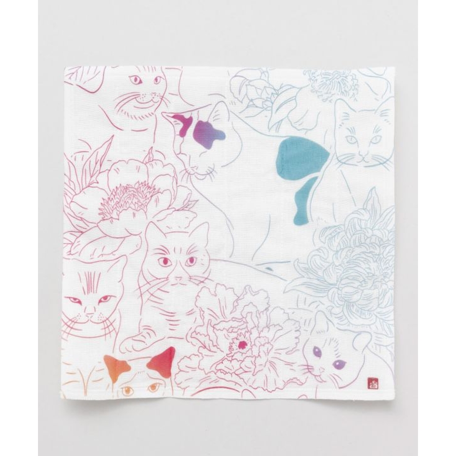 様々な種類の猫と花がデザインされた一枚。ふきんは「蚊帳」を使用し、自然素材で作られた生地なので安心してご使用いただけます。