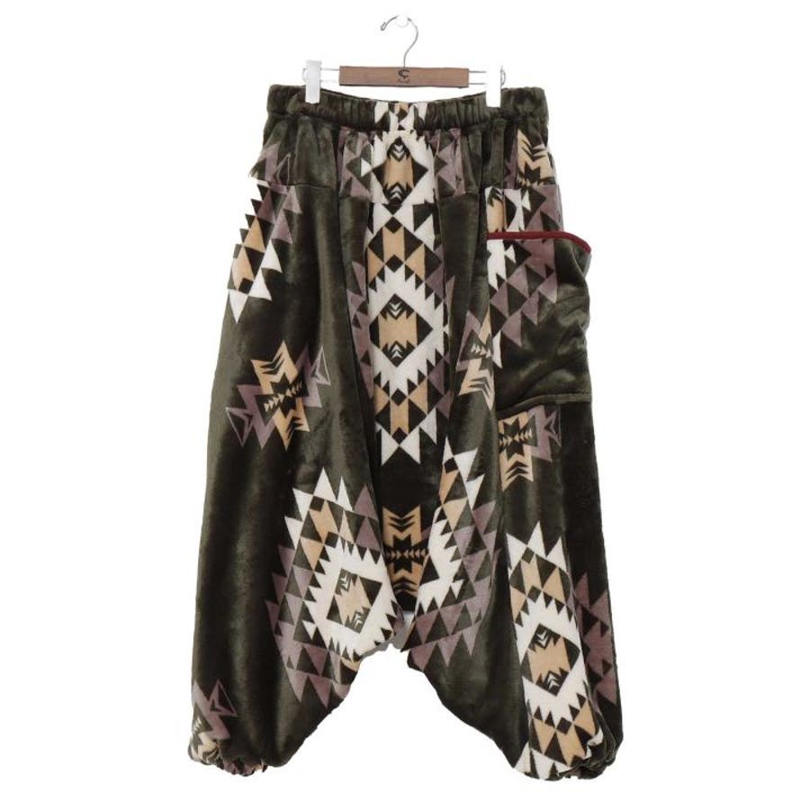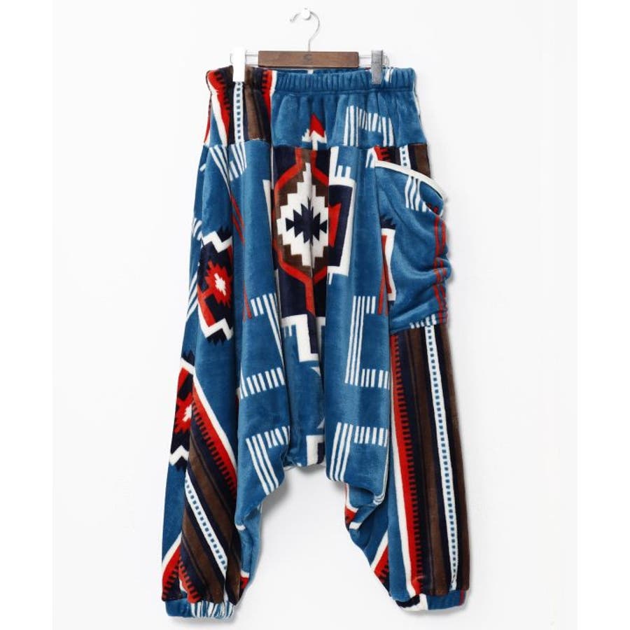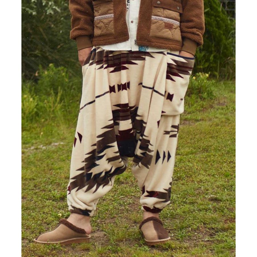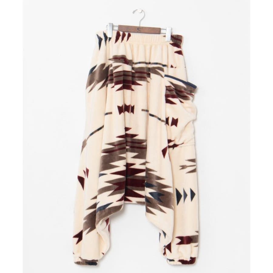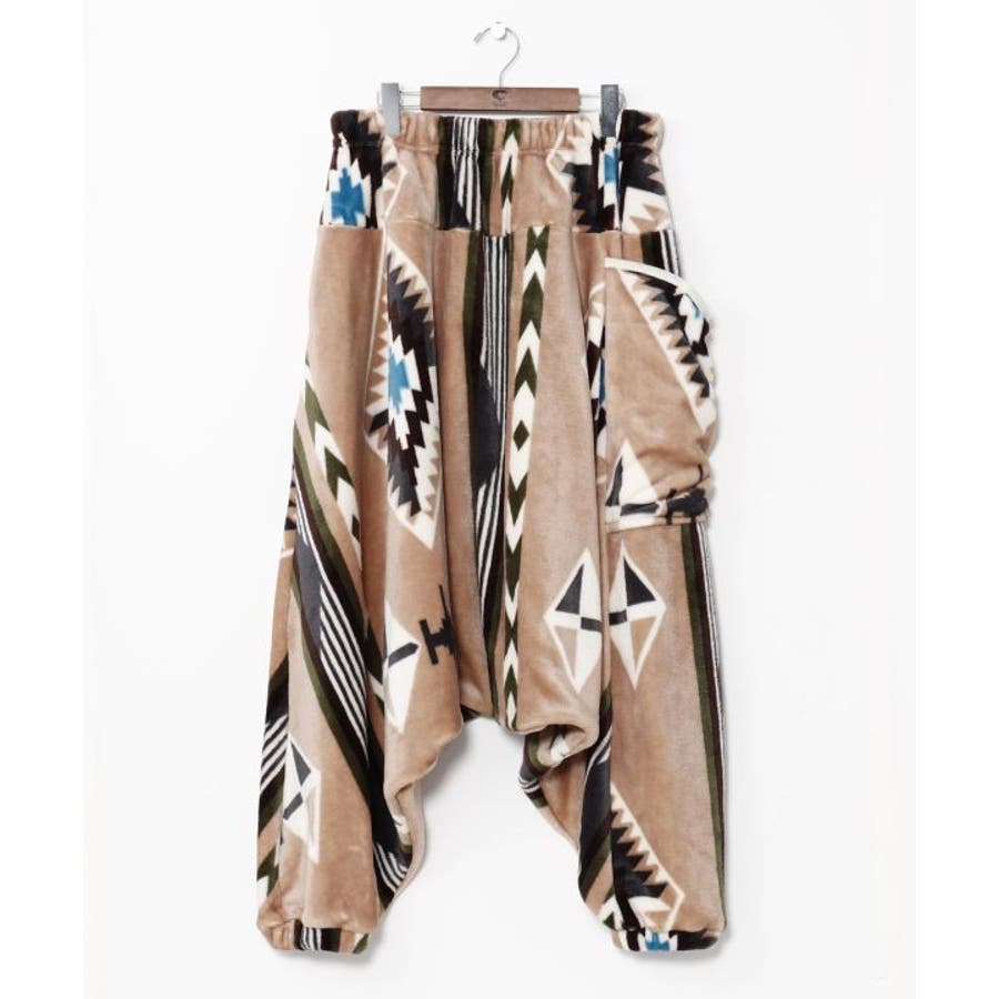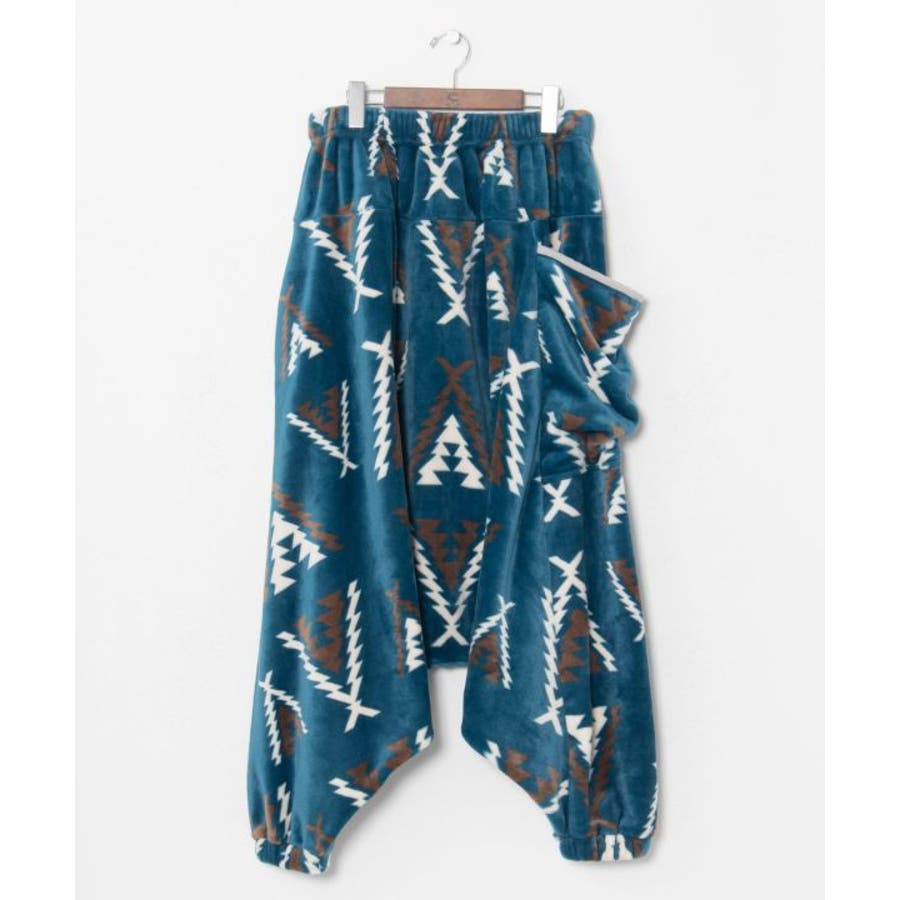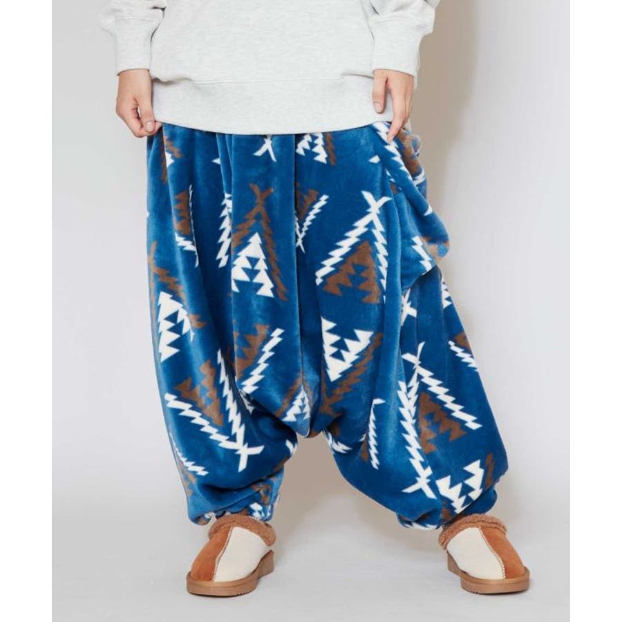 [NOMADY]ブランケット生地を使ったサルエルパンツ。男女兼用のフリーサイズ。スマホや財布が入る大きなポケットが付いているため、アウトドアシーンでも活躍。パッカブル仕様でクッションとしても使用可能。ふんわりとした肌ざわりで、リラックスタイムや寒さ対策にぴったり。デザイン性と機能性を兼ね備えた、実用性の高いアイテムです。