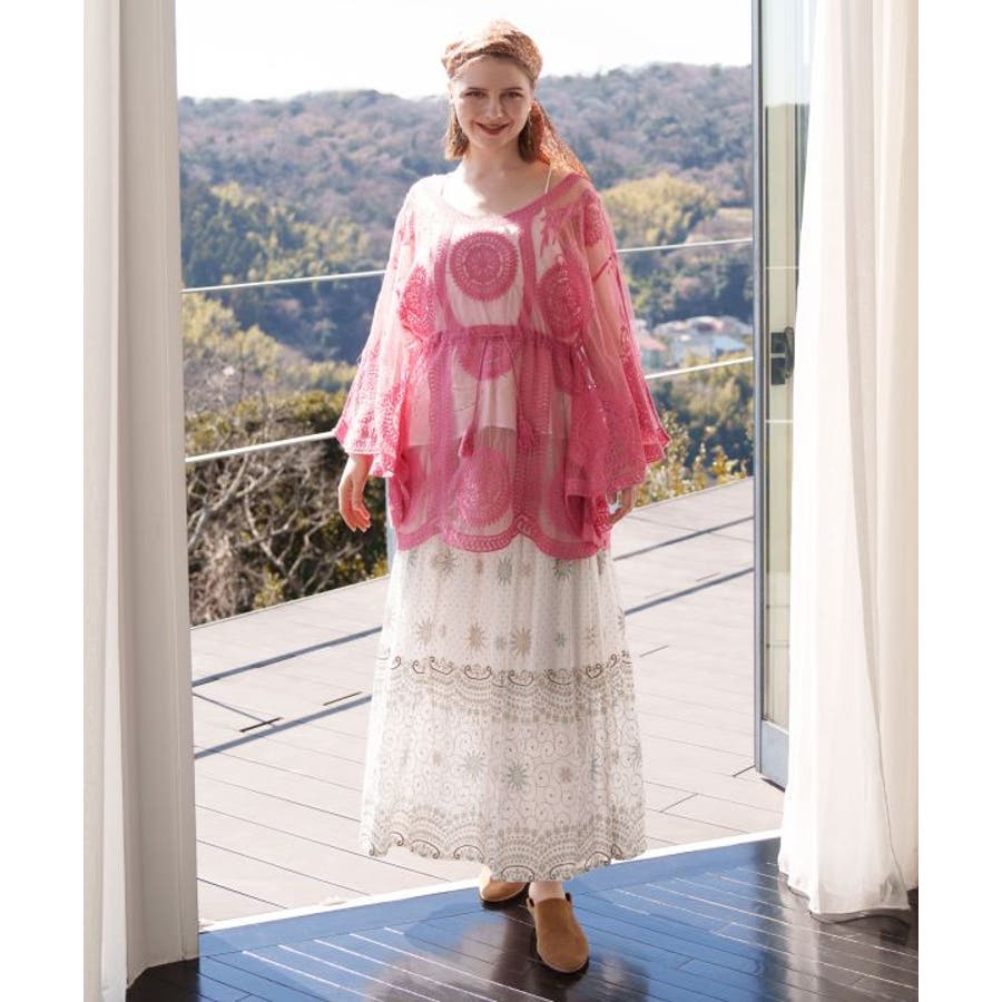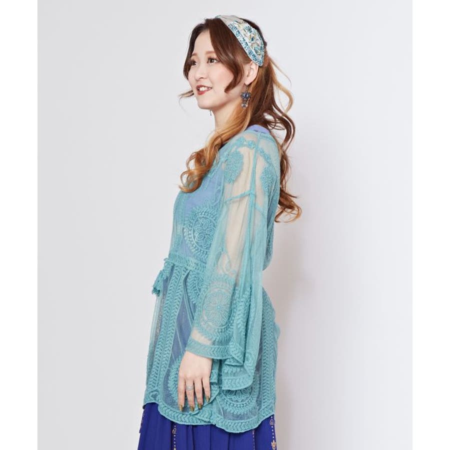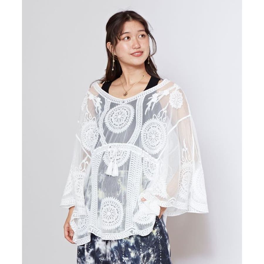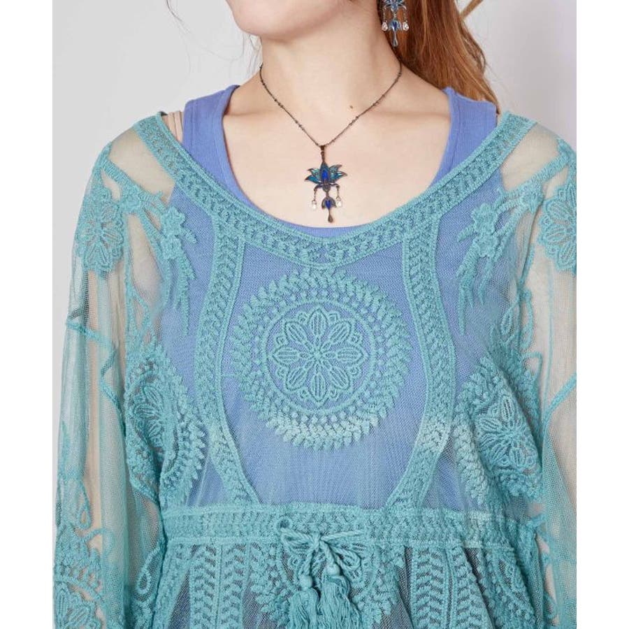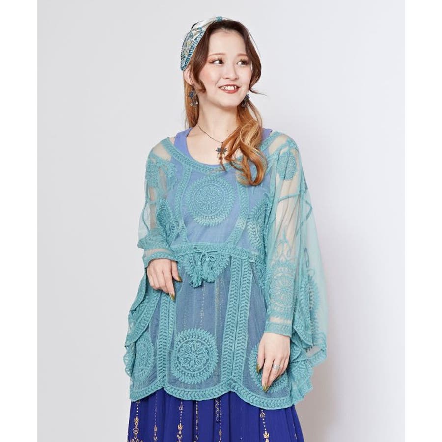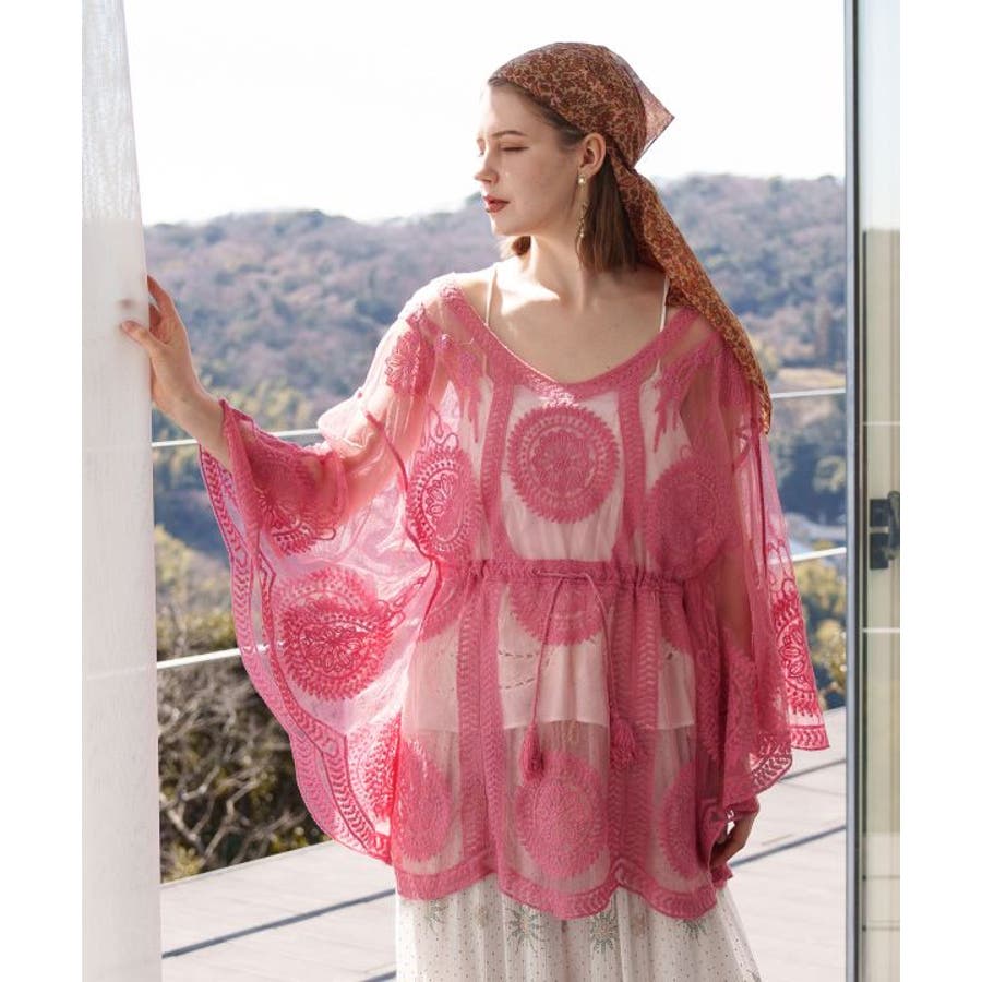 レースの素材が涼し気なトップス。ウエストマークで変形トップスとしても。大胆な刺しゅう模様と鮮やかなカラーバリエーションが魅力的。